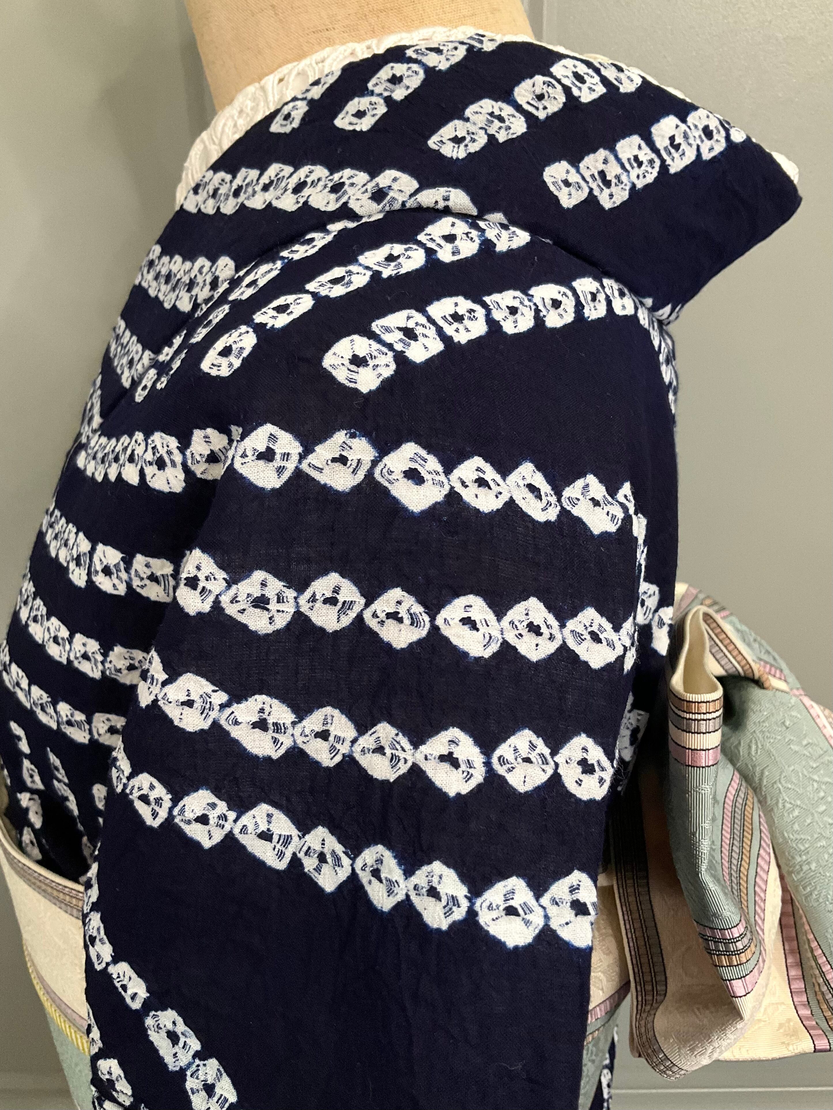 深みのある藍色の地色に、白抜きで表現された編み目のようなデザインの有松鳴海絞り浴衣です♪