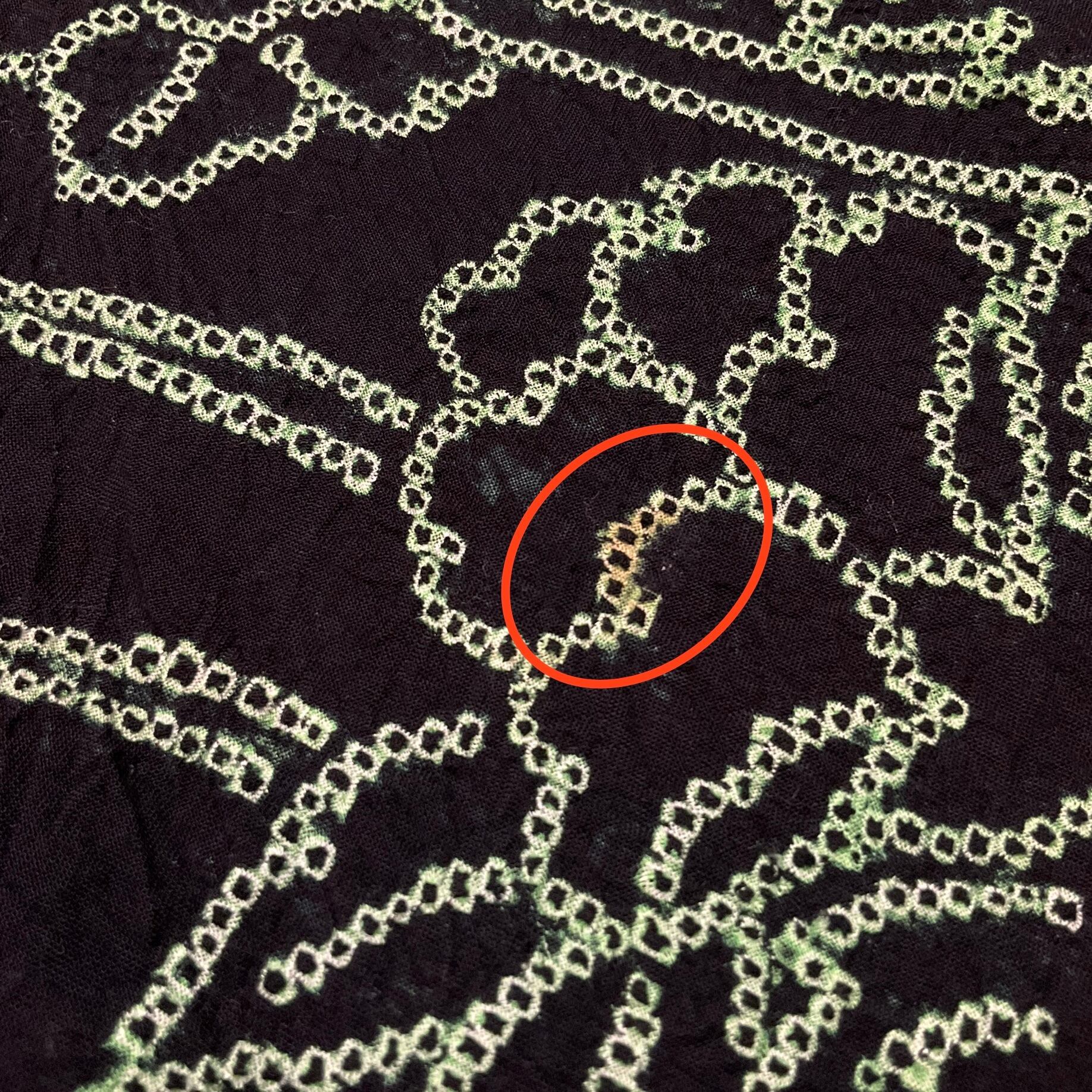 右衿、右外袖、右後身頃(裾から約42cmあたり)、左前身頃(裾から約63cmあたり)に、染色飛び?と思われる部分有り。