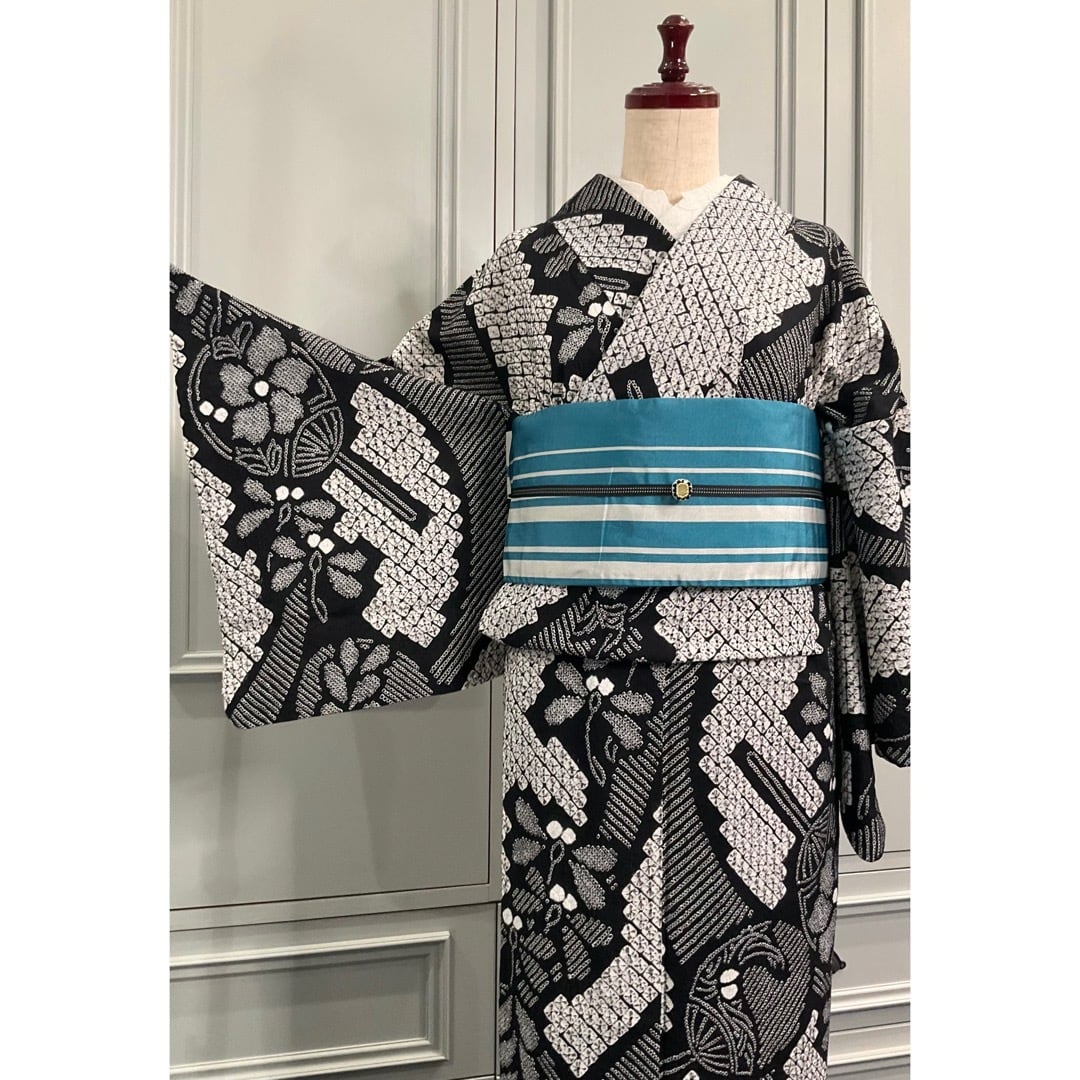 ブラック×ホワイトの地色に、団扇と蜻蛉がデザインされた、有松鳴海絞り浴衣です♪