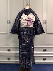 深みのある藍色に、イエロー系とピンク系の花模様が優しい印象の1着です^^