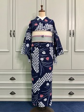 藍色の地色に、チューリップがデザインされた、有松鳴海絞り浴衣です♪