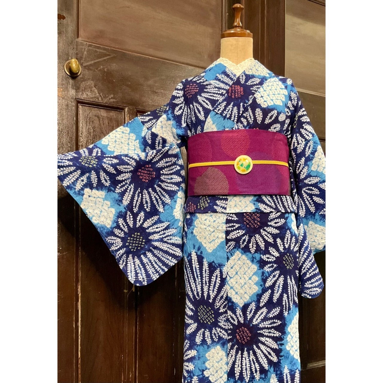 水色×ネイビー×ホワイトの地色に、向日葵のような模様がデザインされた有松鳴海絞り浴衣です♪