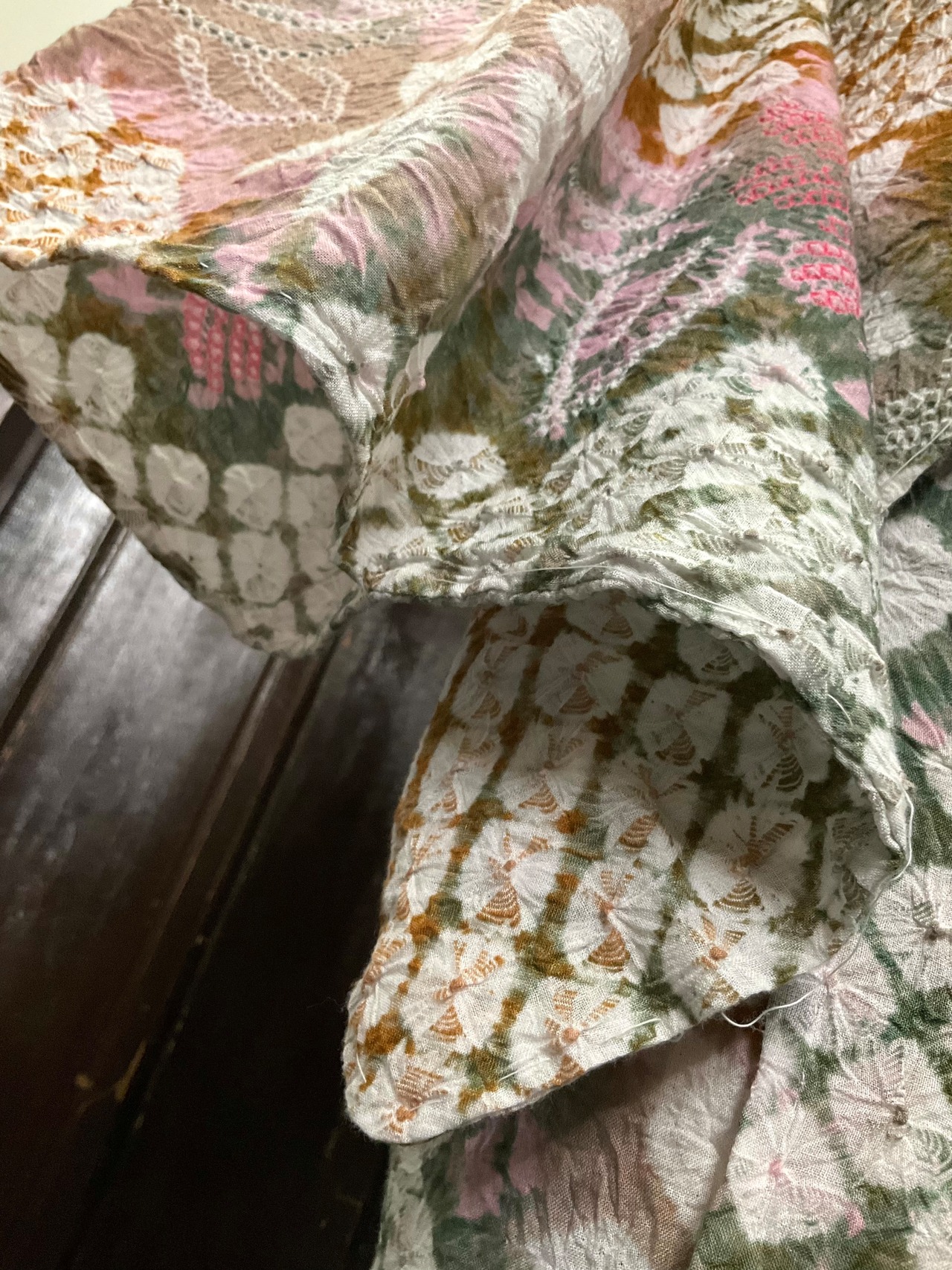 型彫り、絵刷り、糸を使った縫い絞りや括りの手作業、染色、糸抜き、などなどたくさんの技法がたくさんの人の手によって施され出来上がる、伝統工芸品です。