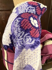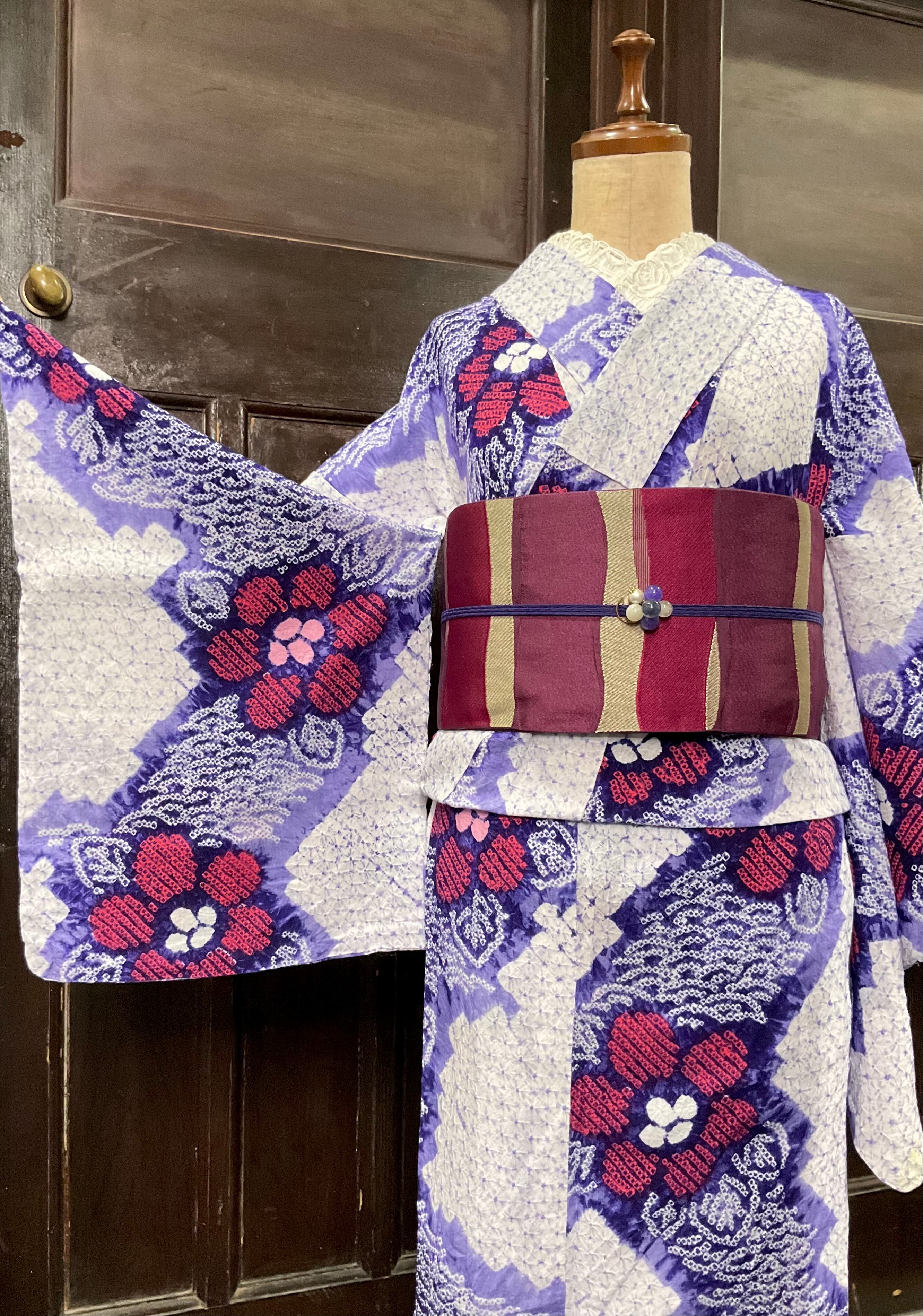 ホワイト系×パープル系の地色に、花模様がデザインされた、有松鳴海絞り浴衣です♪