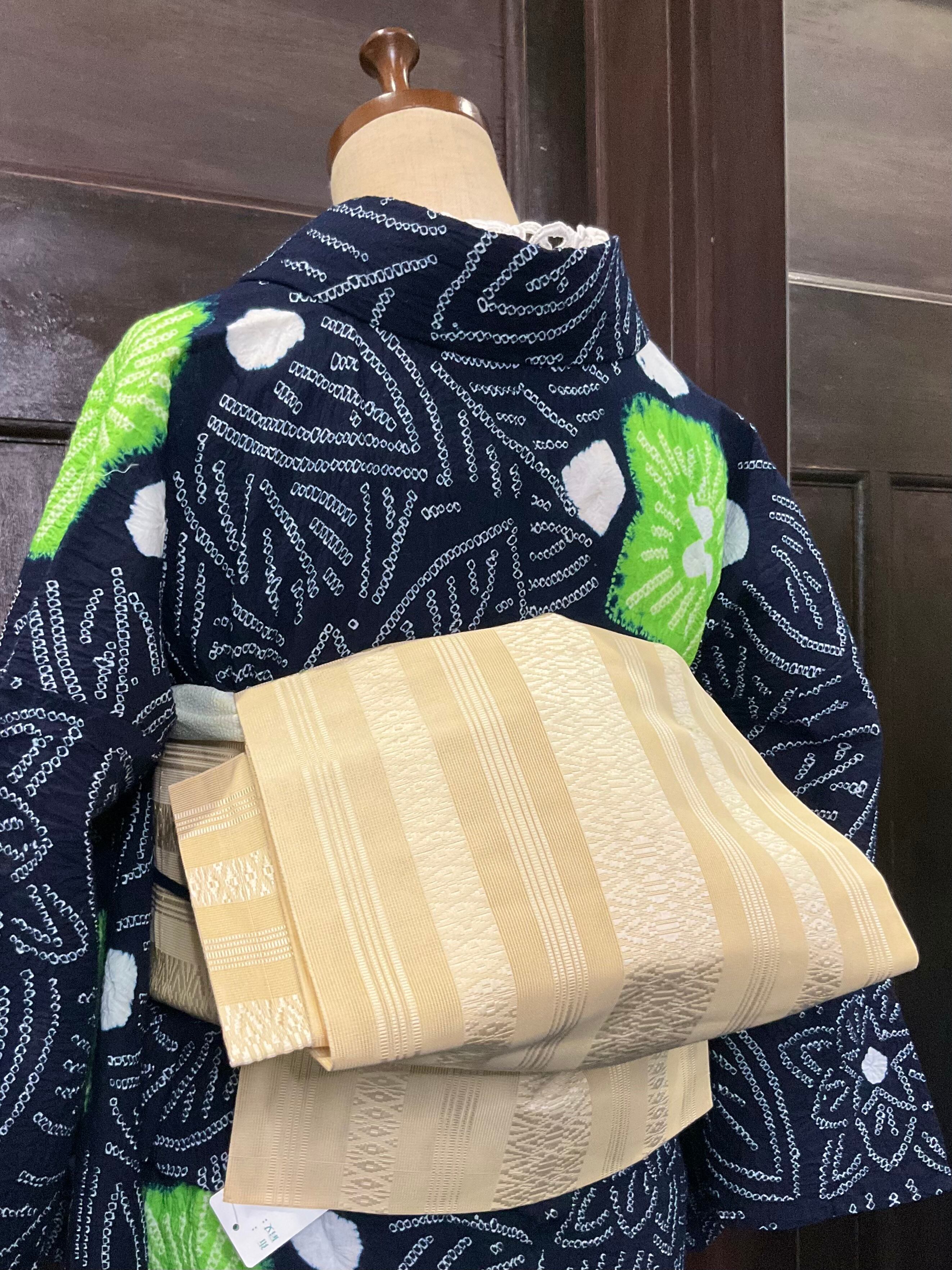 淡いイエロー系の色が綺麗な夏のリサイクル八寸名古屋帯(松葉仕立て)です♪