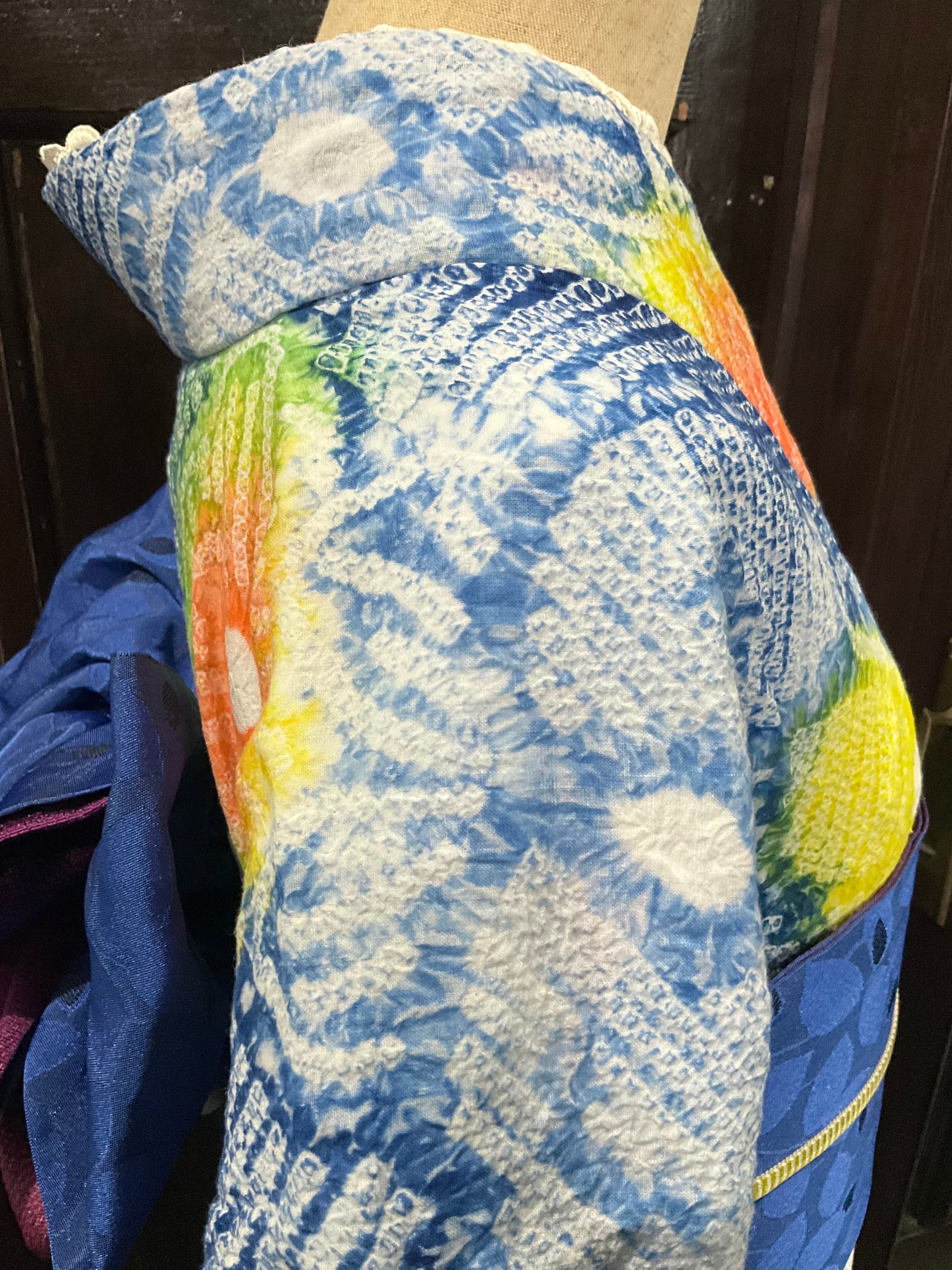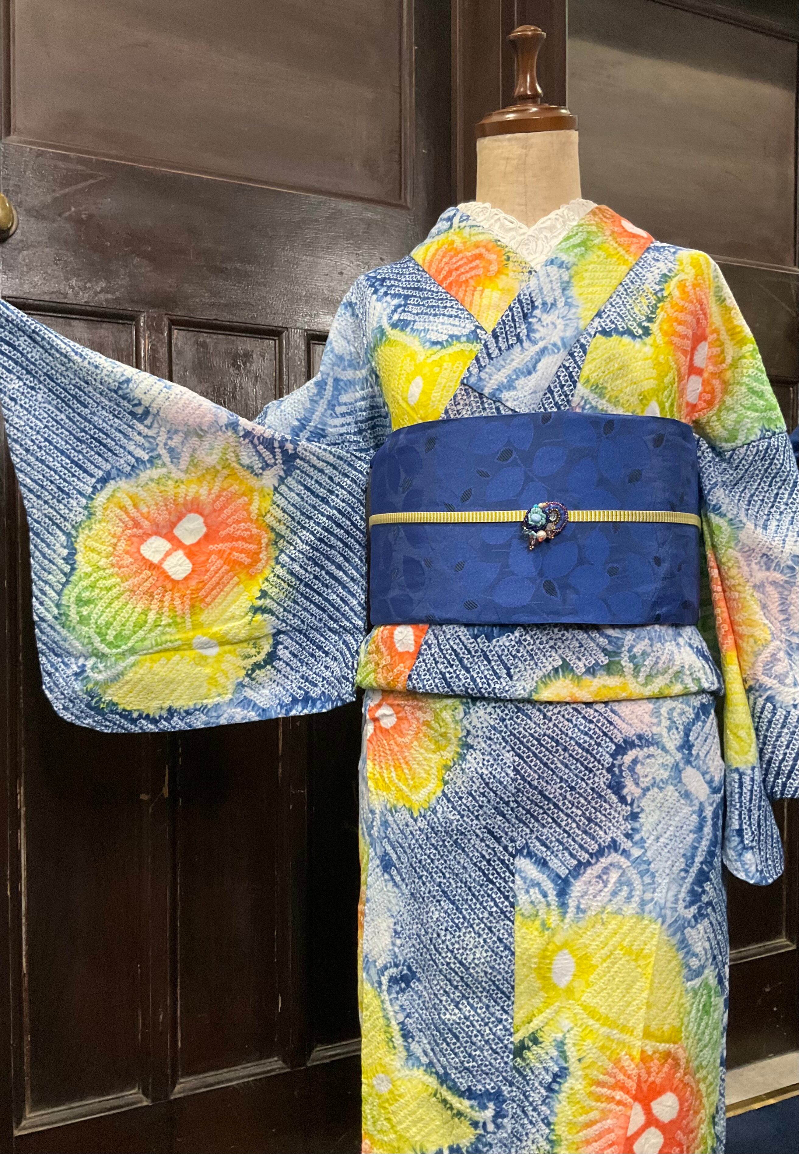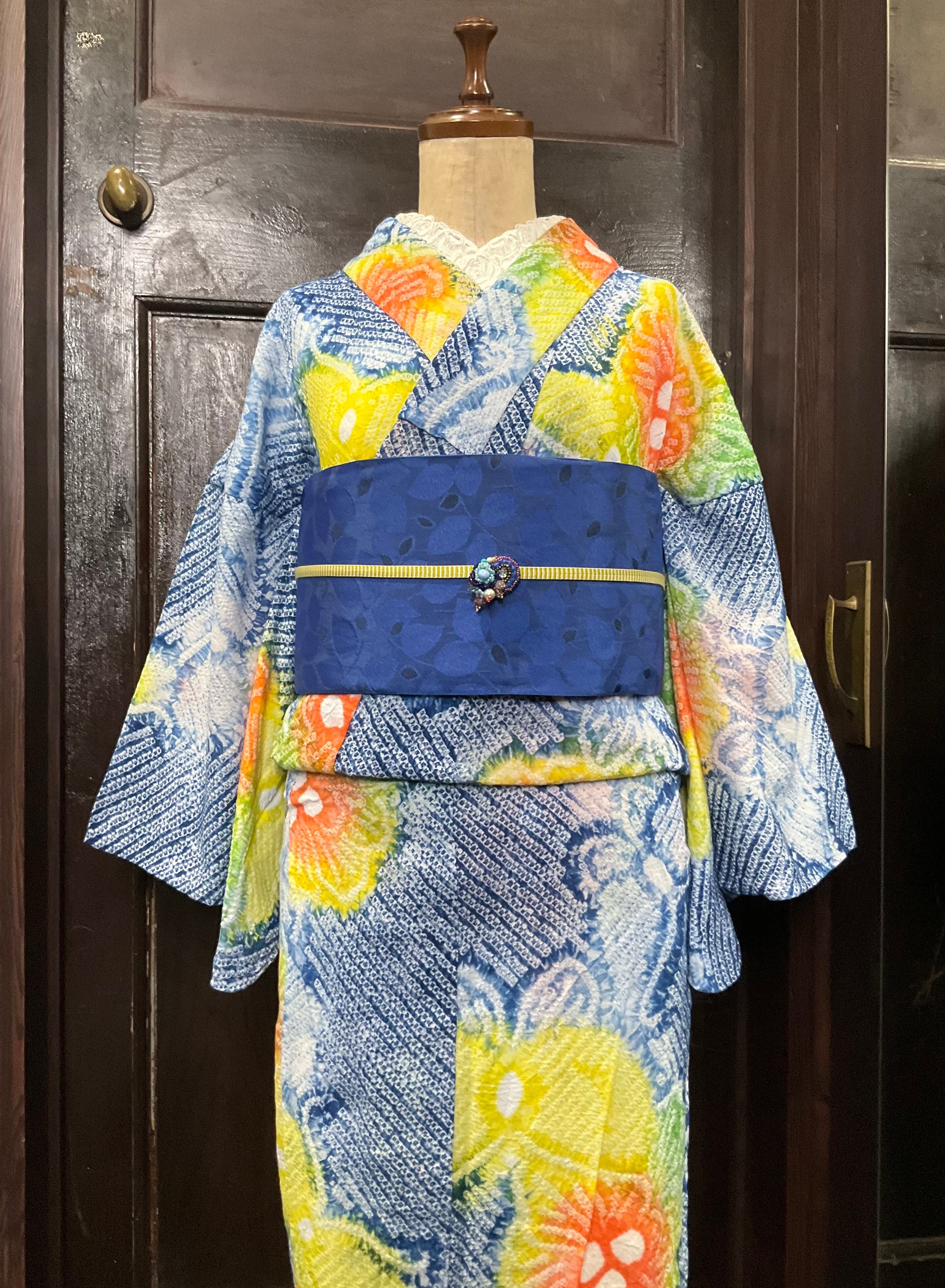 晴れた夏空に、太陽が眩しく照らしているようなお色使いがとても綺麗な、こちらの絞り浴衣。