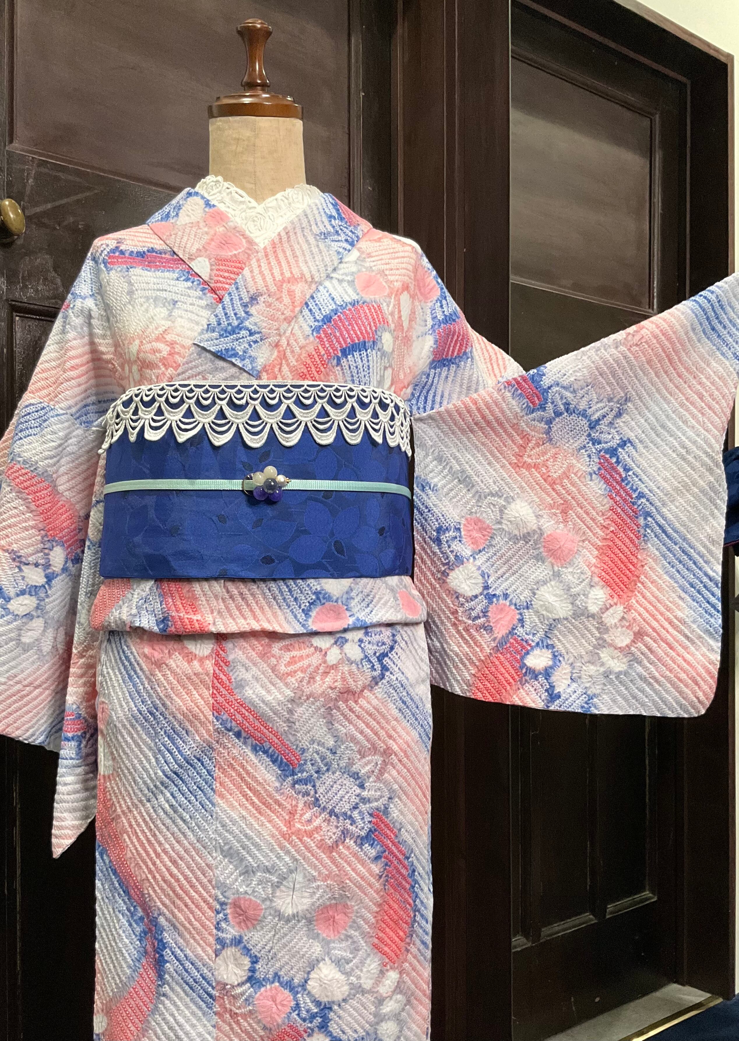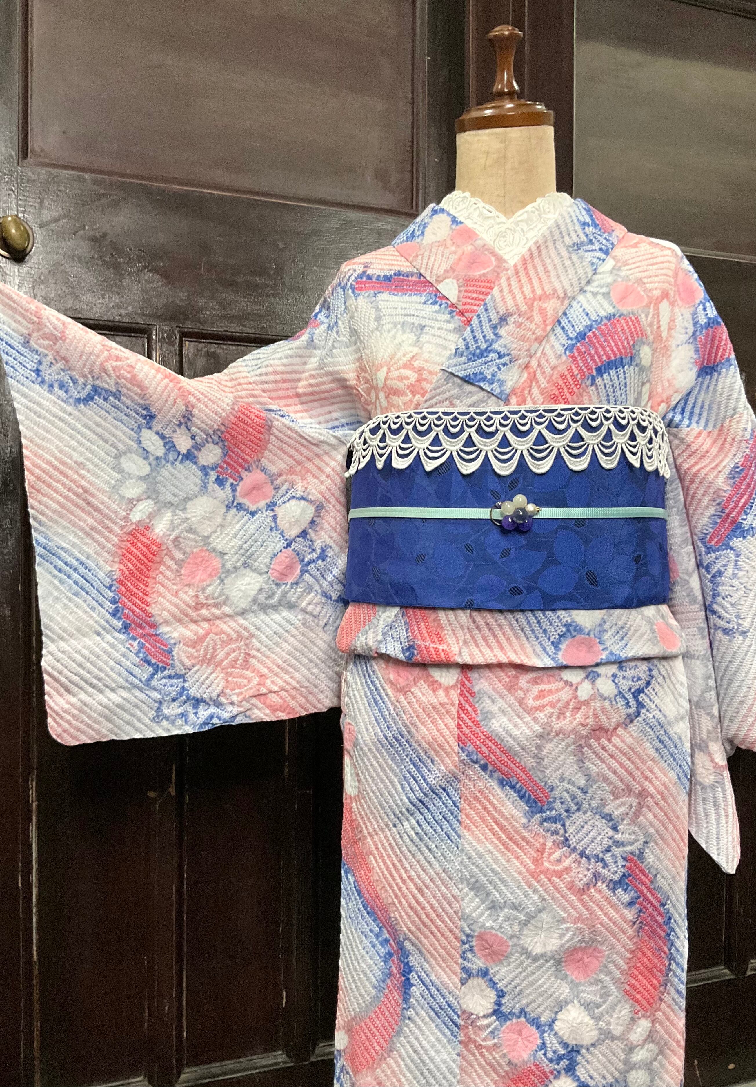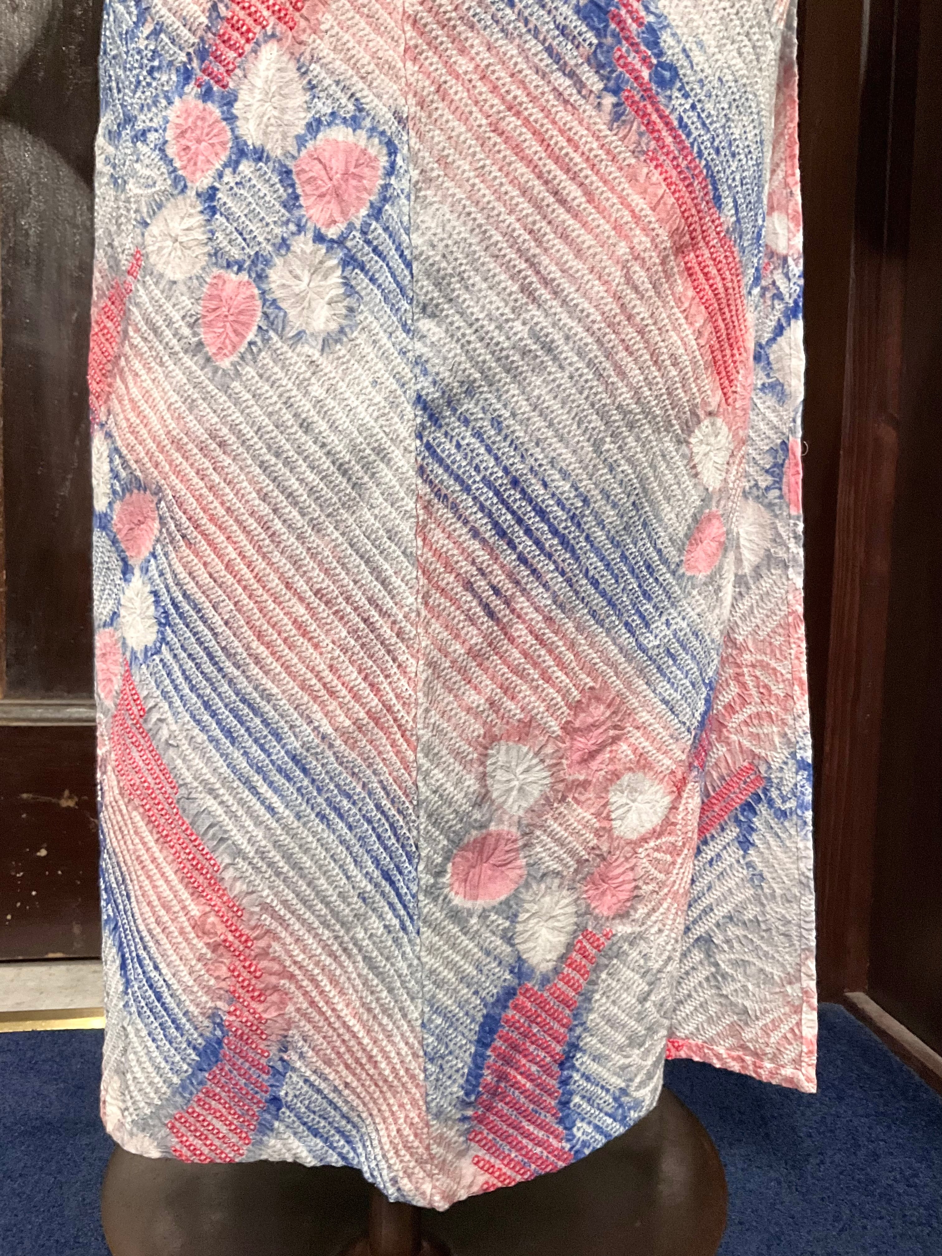 ホワイト系×ブルー×ピンクのグラデーションの地色に、花模様がデザインされた、有松鳴海絞り浴衣です♪