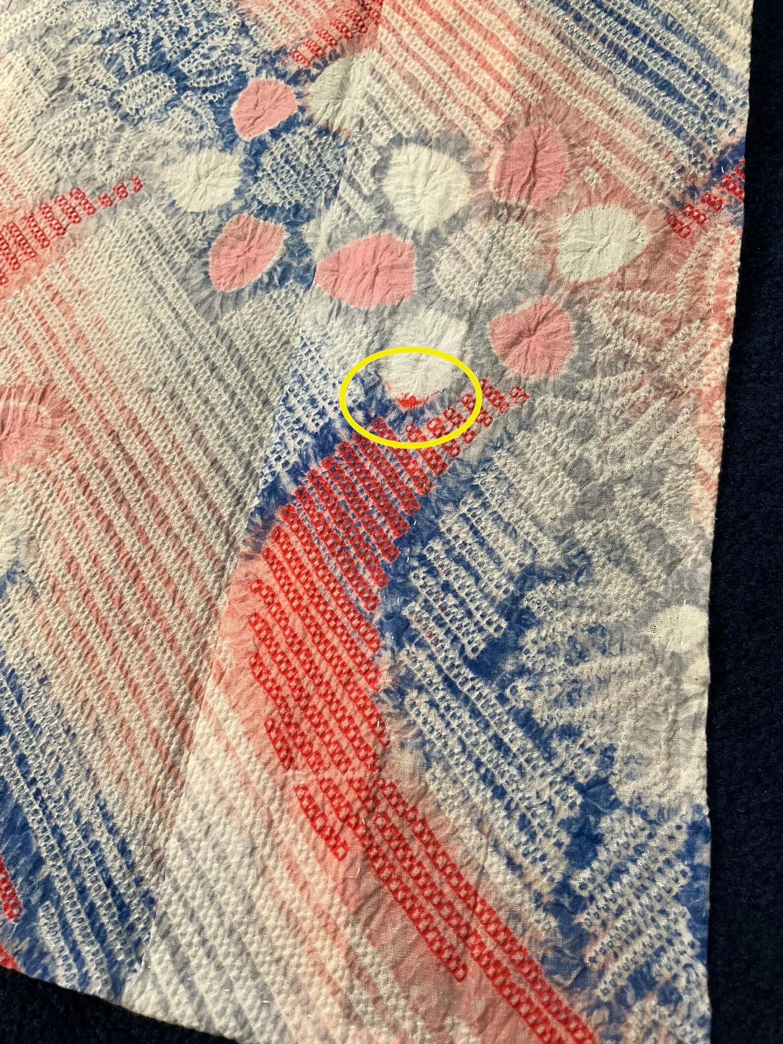 左外袖(上部)に、絞りの際に抜いた糸によるピンホール有り。