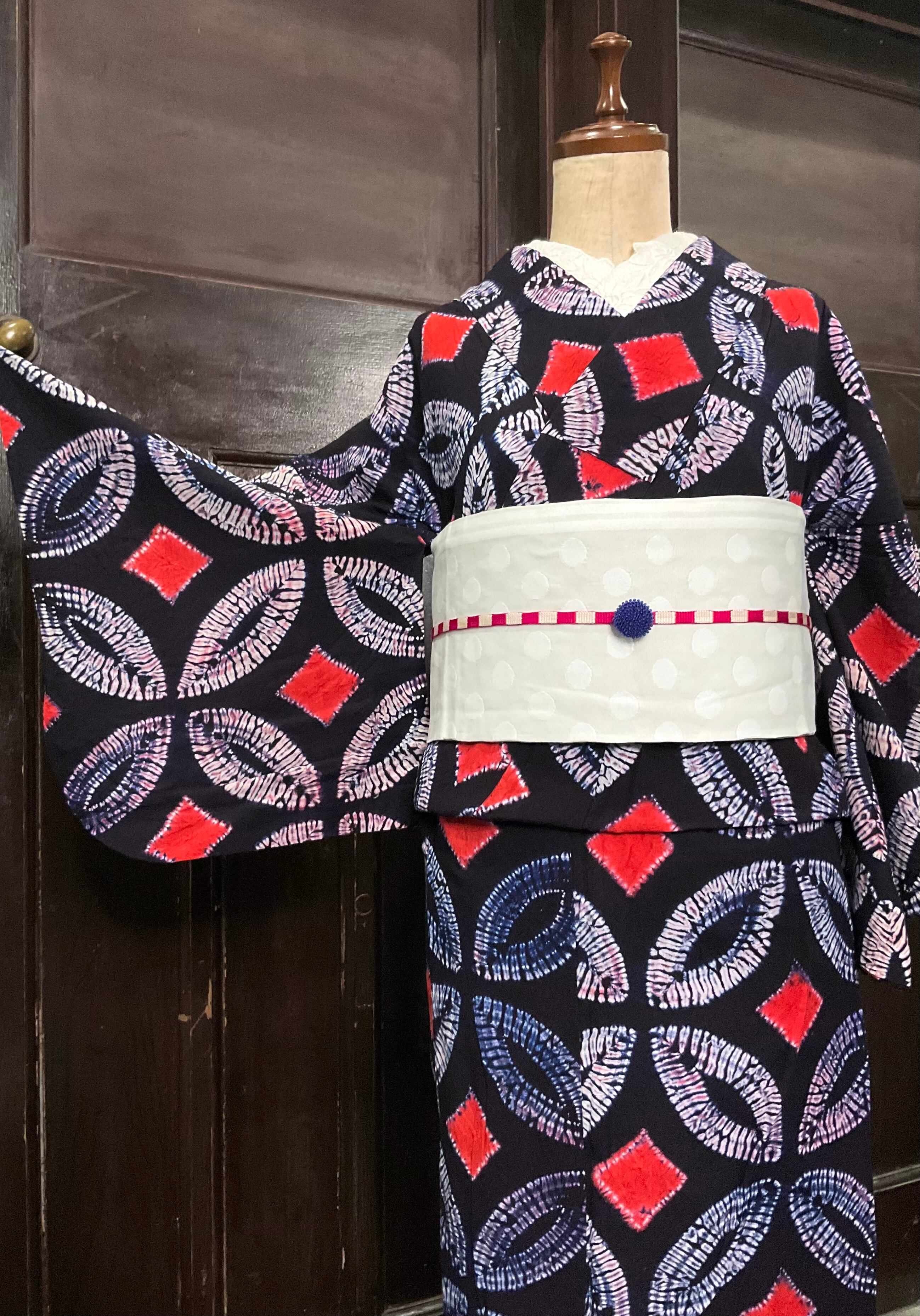 深みのある藍色の地色に、七宝柄がデザインされた、有松鳴海絞り浴衣です♪
