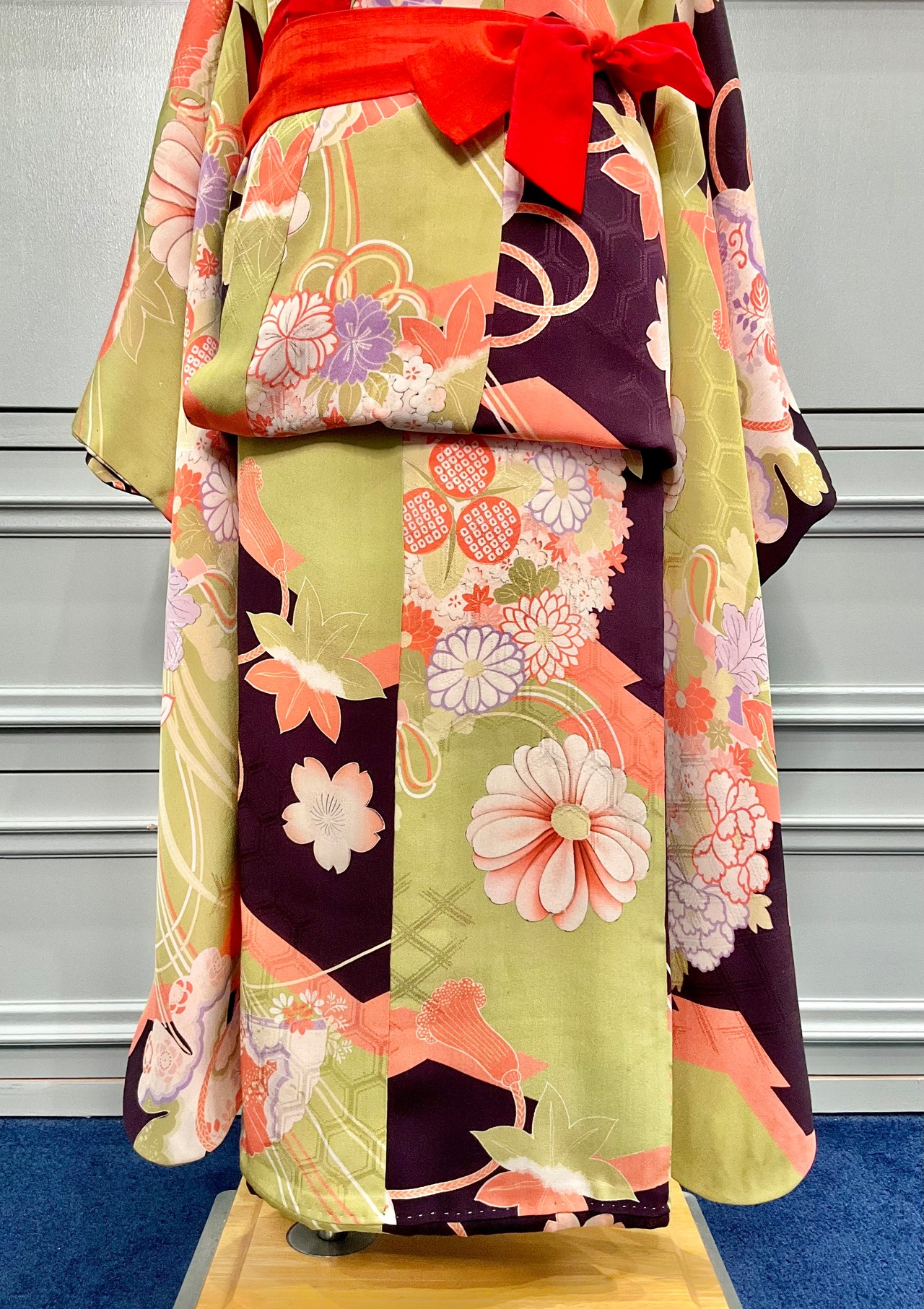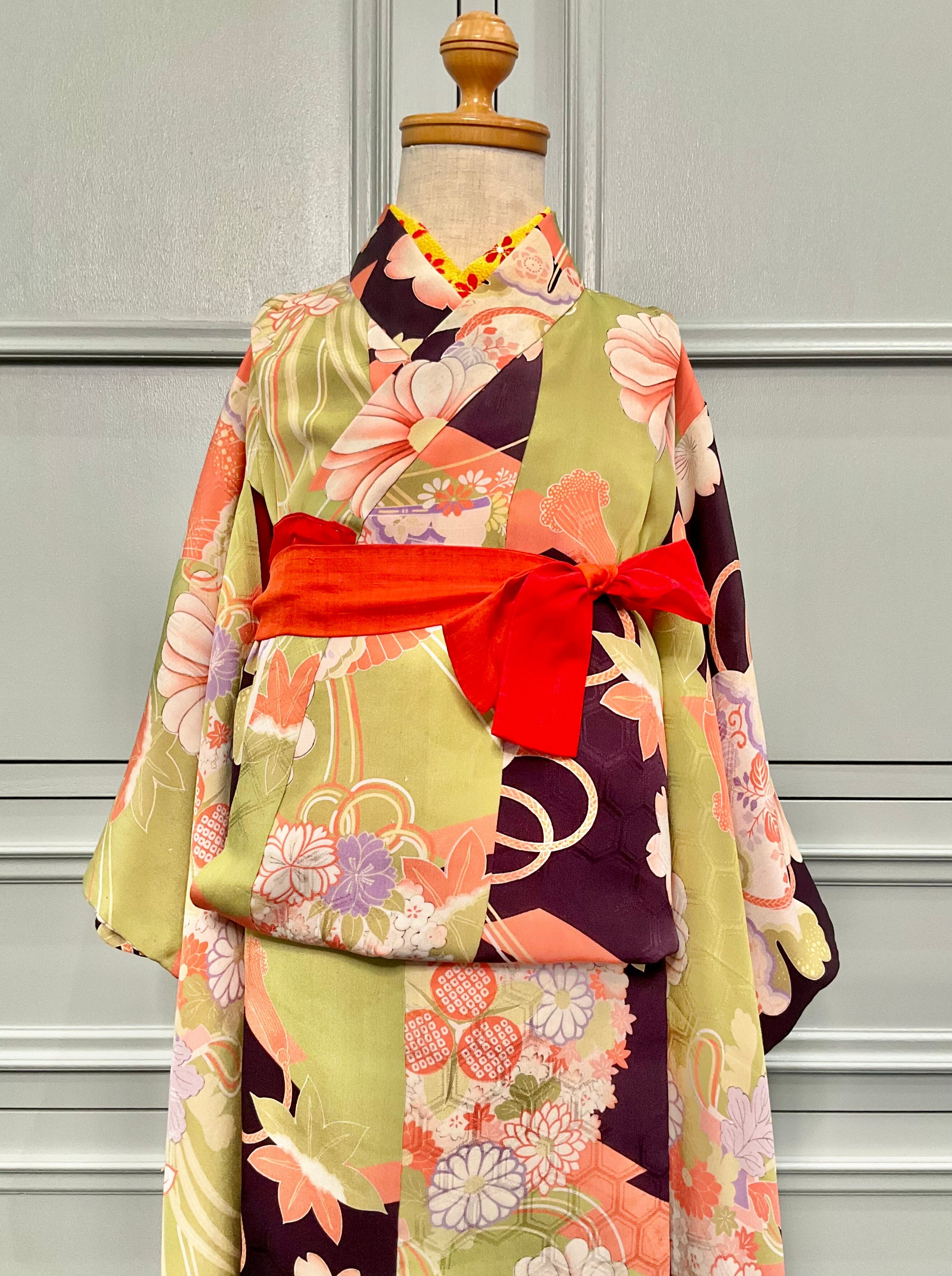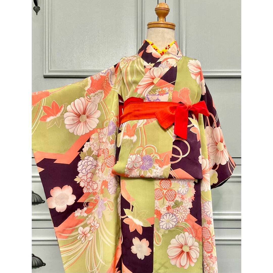 レアな色合いの抹茶グリーン×黒の地色に、花薬玉や桜、菊、紅葉などの四季折々の花模様がとても華やかです✨