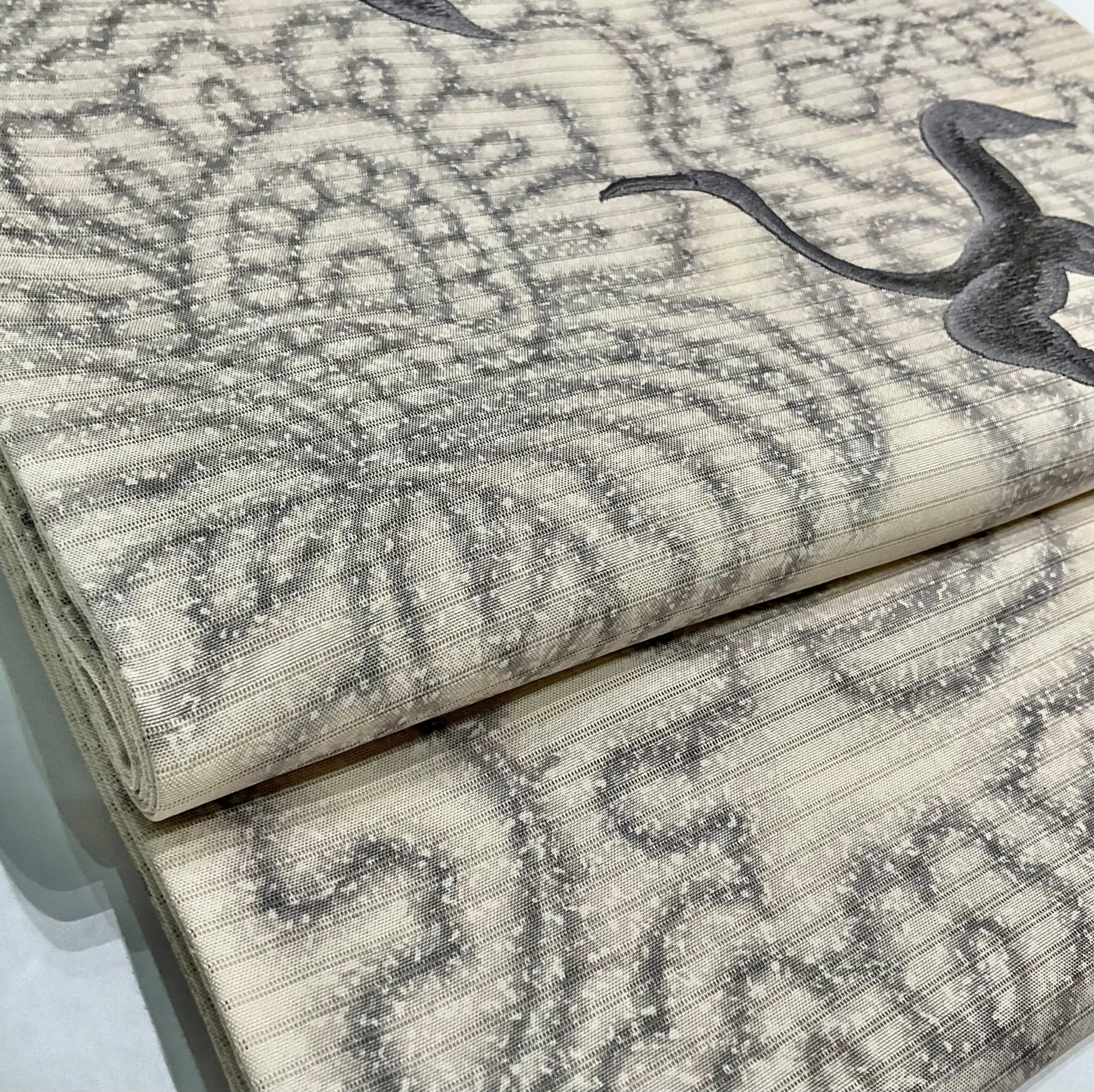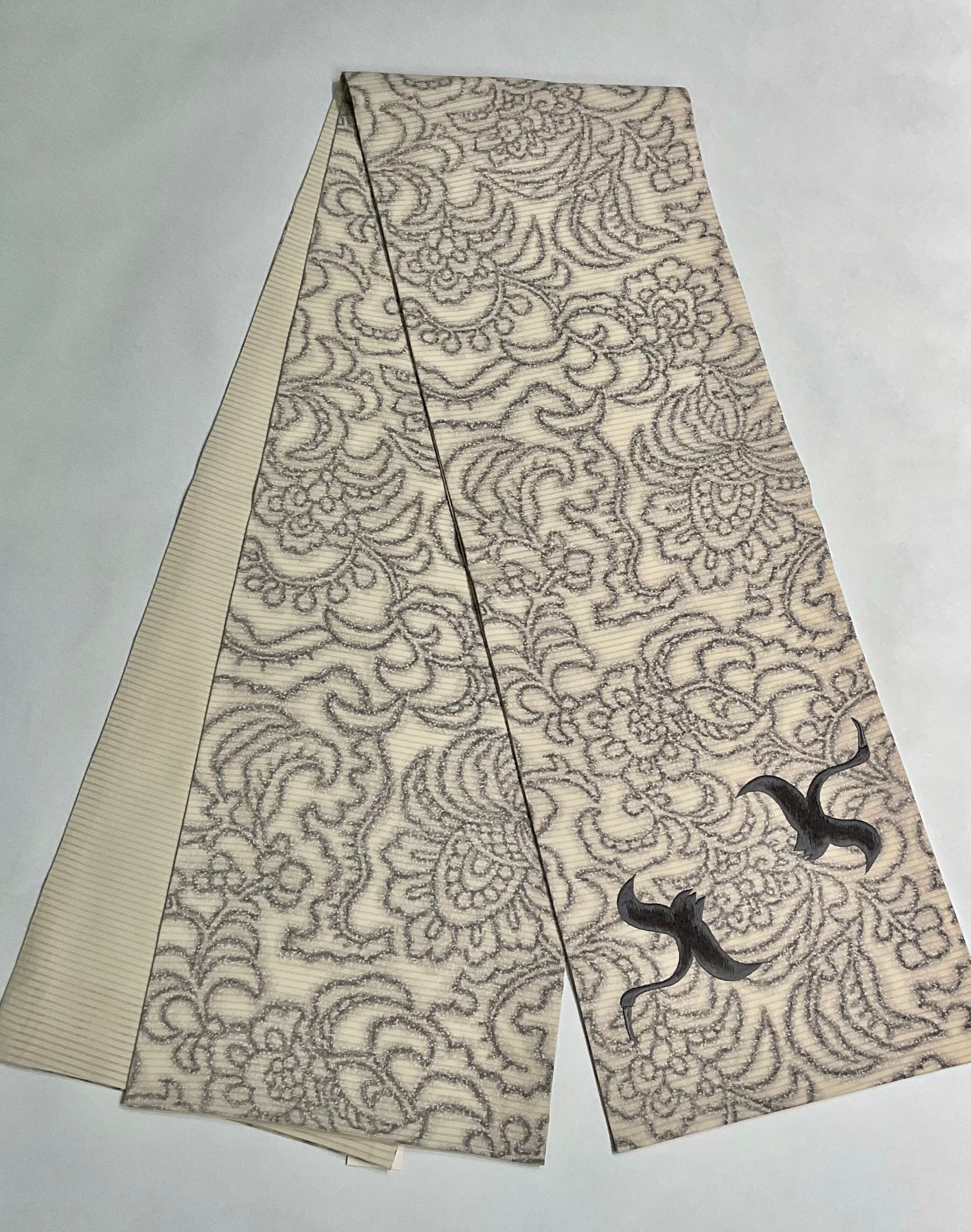 オリエンタルな染めの唐花模様に、羽ばたくグレーの鳥たちの刺繍が美しく、存在感があります✨️
