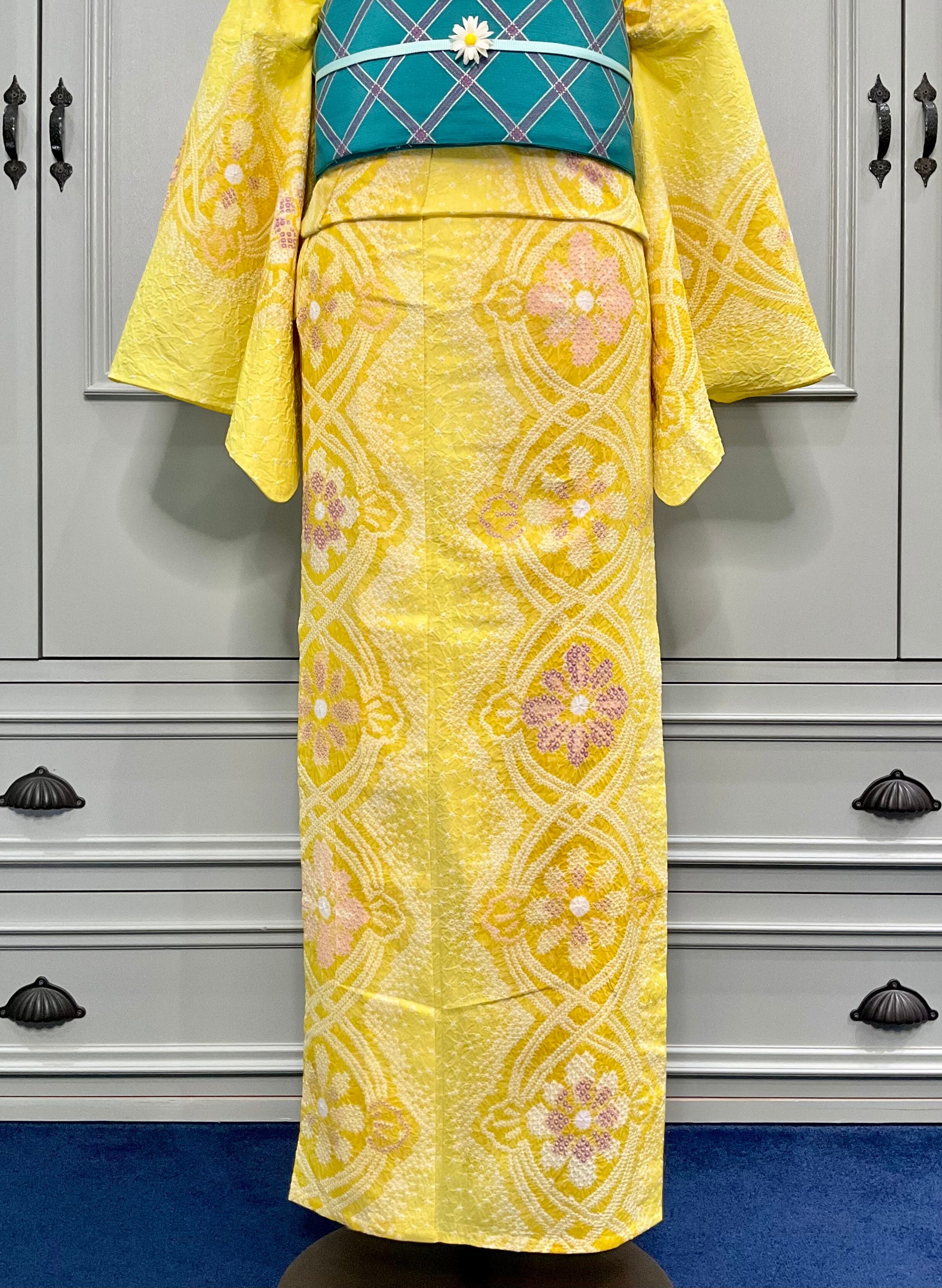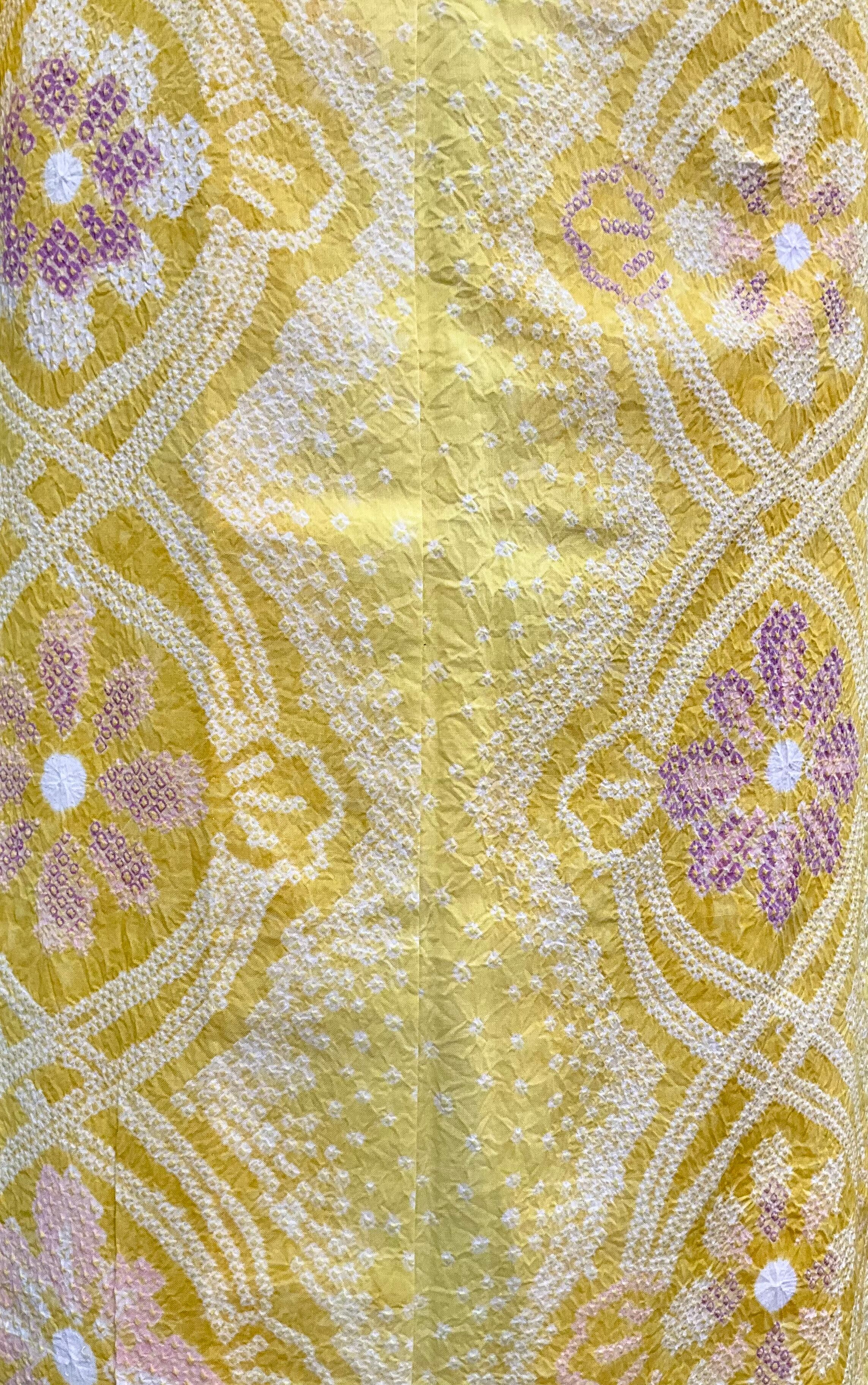 レアなイエロー地に、パープルやピンクの花模様がお洒落な未使用の有松鳴海絞り浴衣です♪