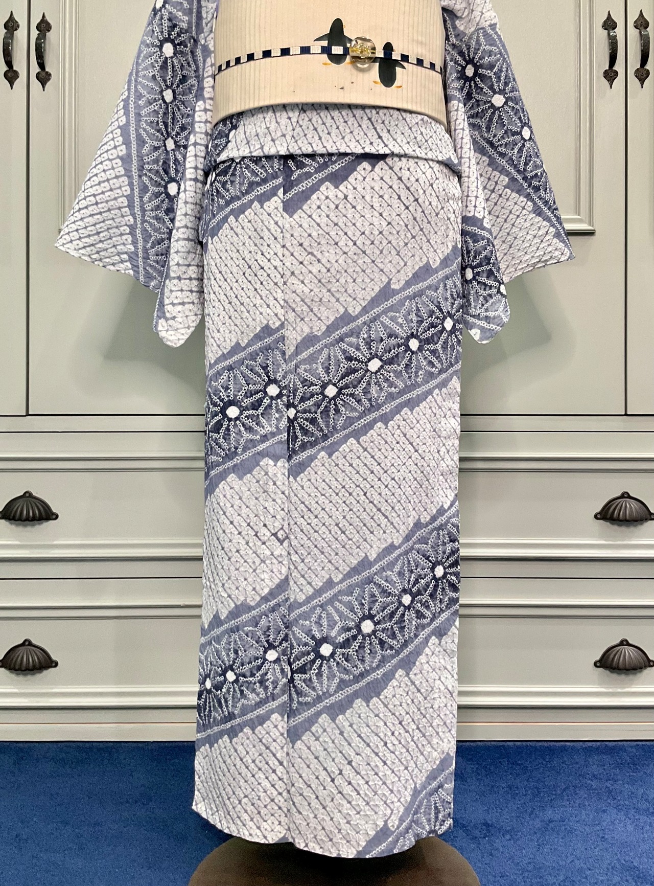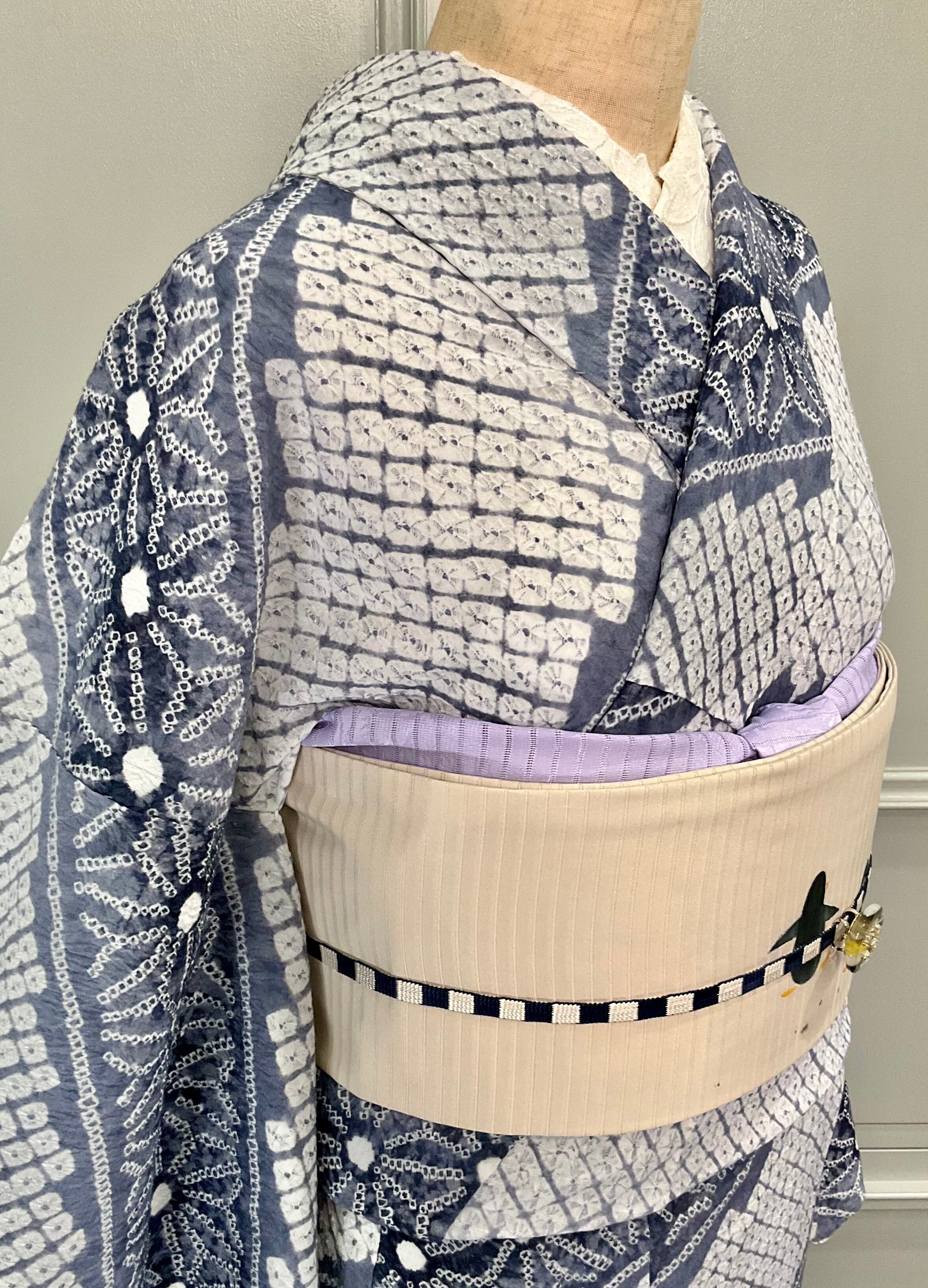 絞り浴衣では珍しいシックな色柄なので、中に襦袢を着たり、夏の名古屋帯を合わせたり、着物風の着こなしもぴったりですね^^