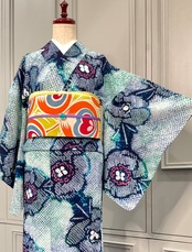 ターコイズグリーン系の地色に、ブルー系の大きな花模様が美しい有松鳴海絞り浴衣です♪