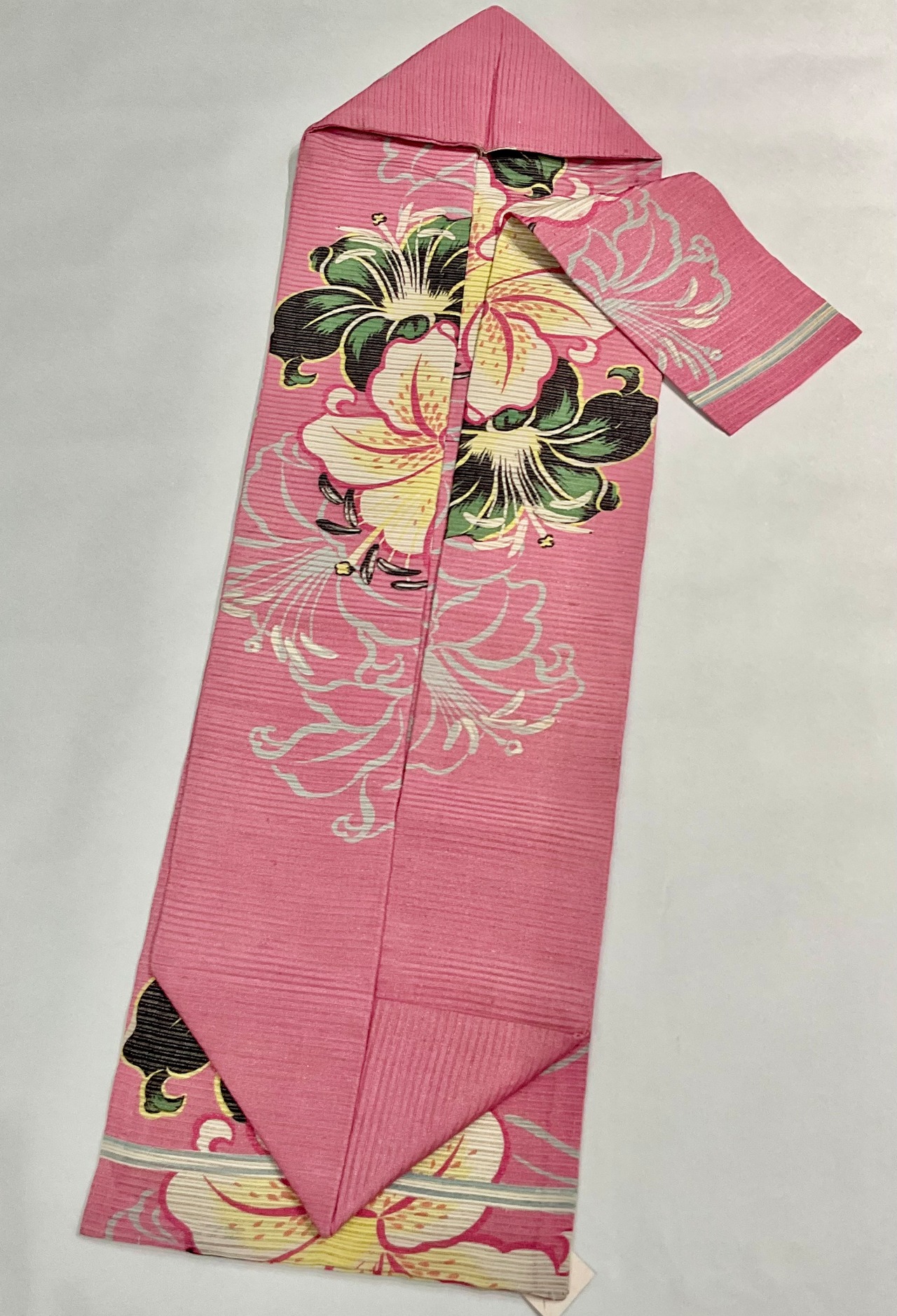やわらかいピンク地に大きな百合がパッと目を惹くデザイン♪まるで夏の恋する乙女のように見えてきます♡