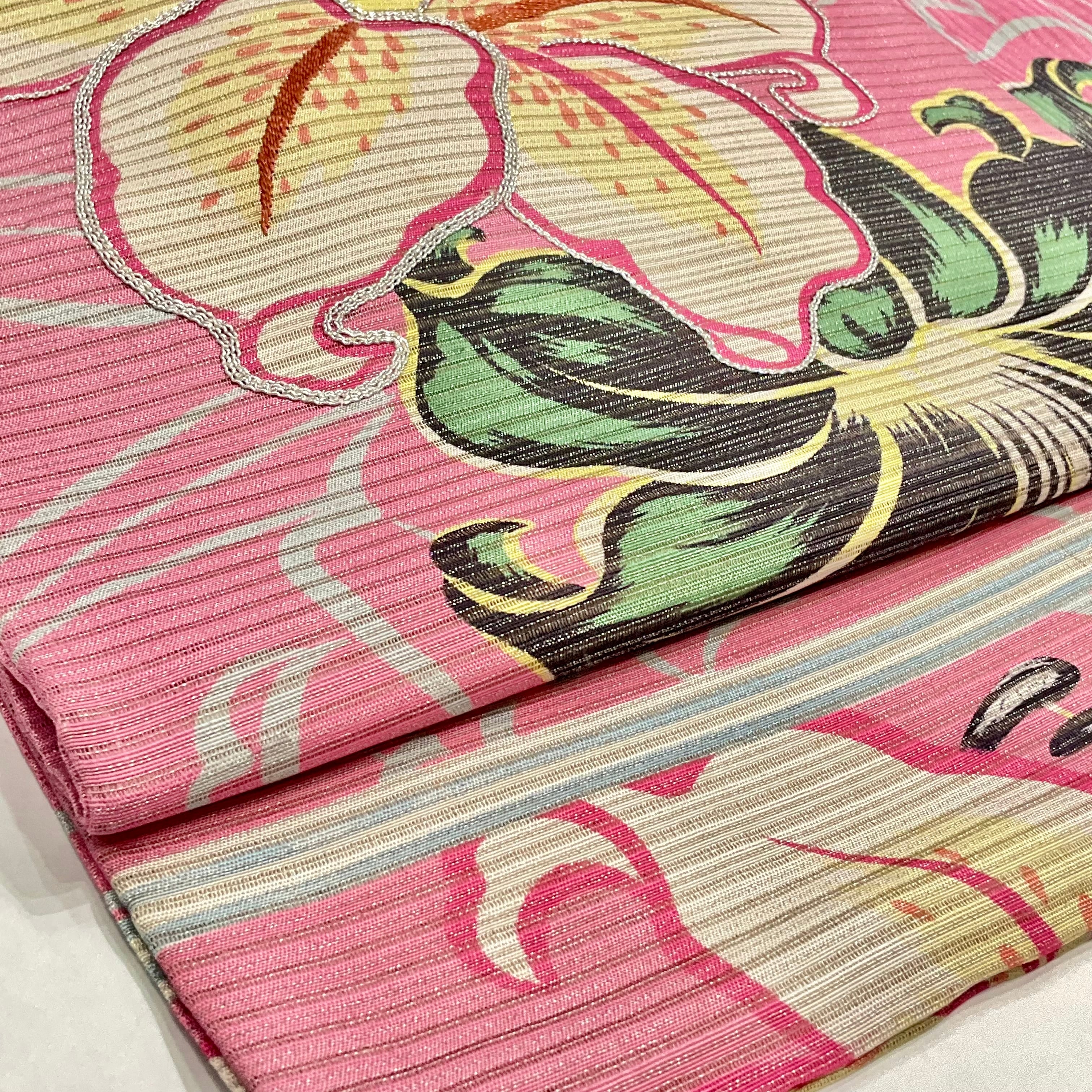 ピンク地に大きな百合の柄が華やかな夏(絽)のアンティーク名古屋帯です♪