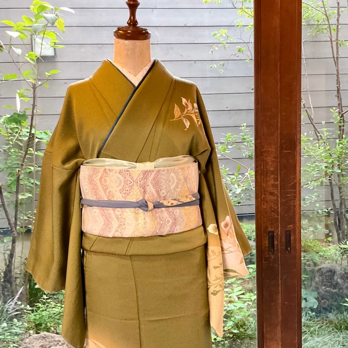 合わせた訪問着の洋花のオリエンタルな柄とこちらの袋帯のコーディネートはフォーマルな席でひときわ目を引くモダンでお洒落な装いになりますね✨