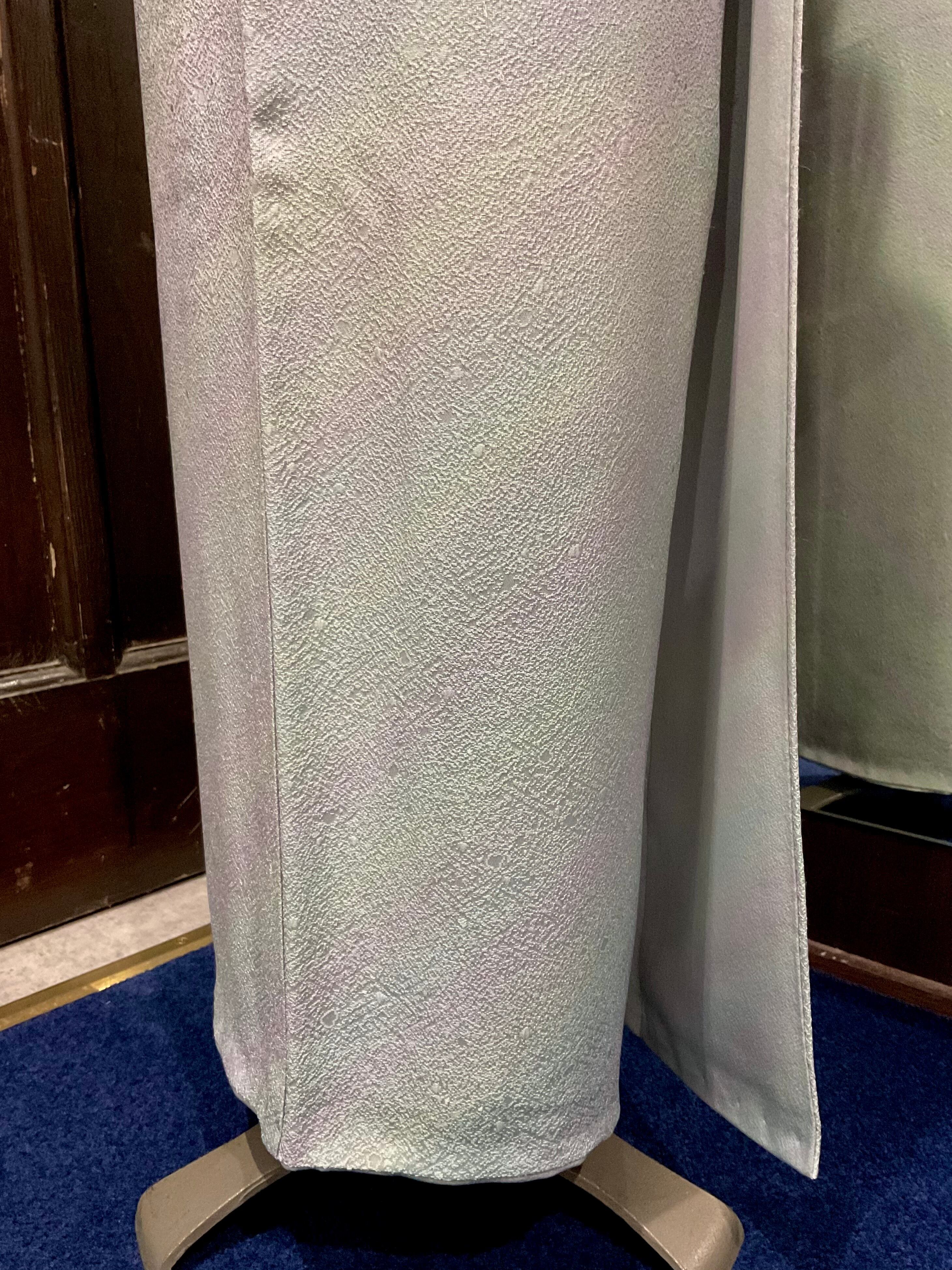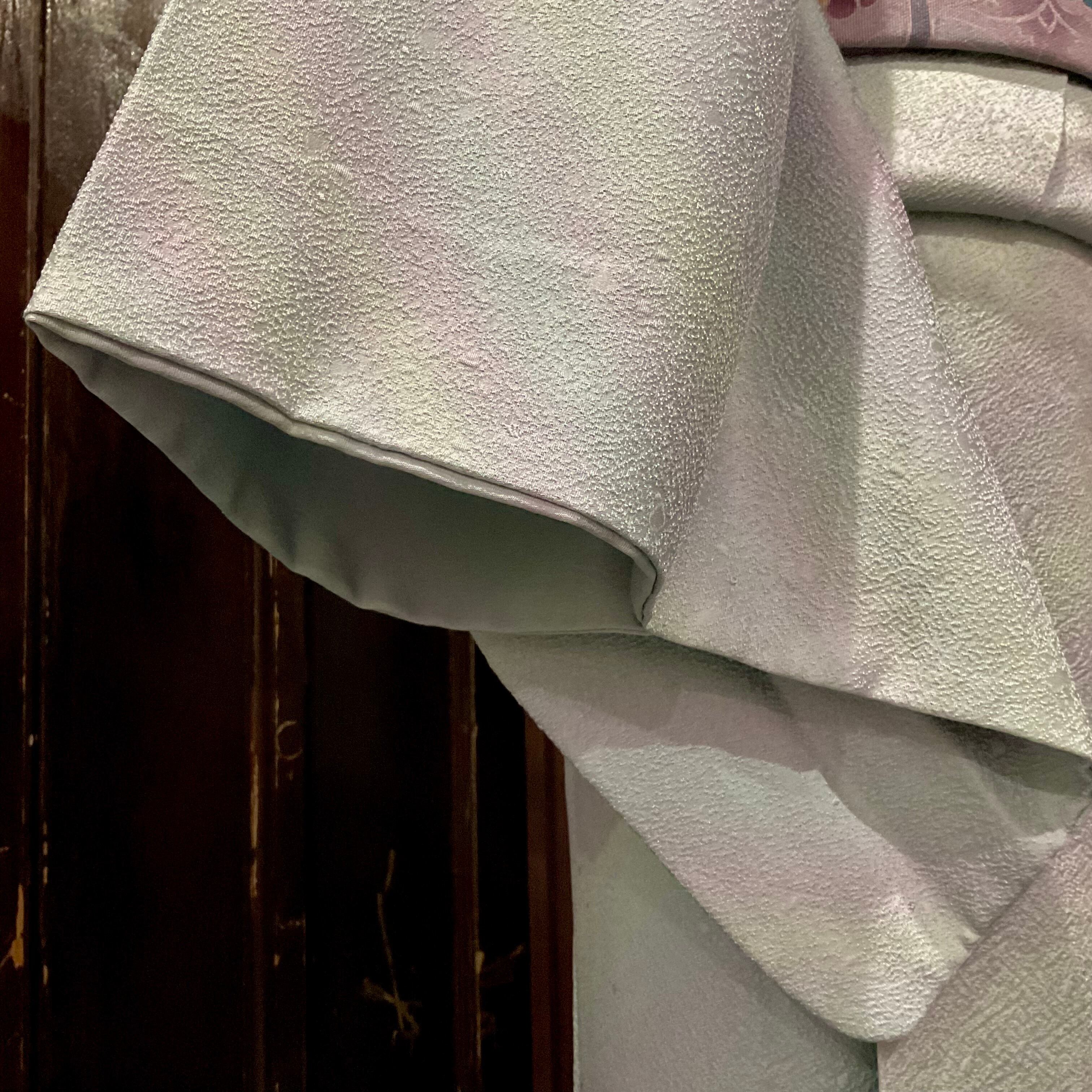 曇り空のような淡い浅葱色や淡いパープル系の色が混ざり合った美しいリサイクルの色無地です。