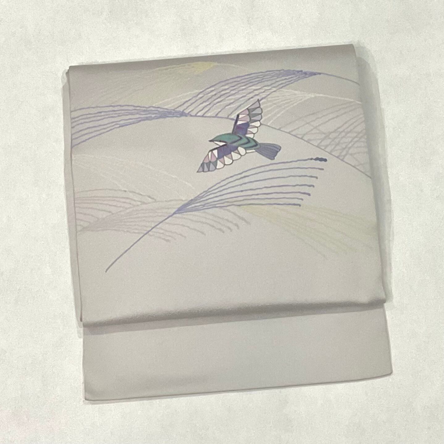 やや青みのあるライトグレー系のベースに秋を感じるススキに、色鮮やかな小鳥が描かれた名古屋帯
