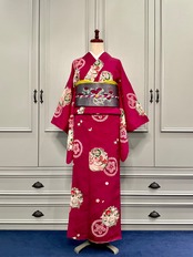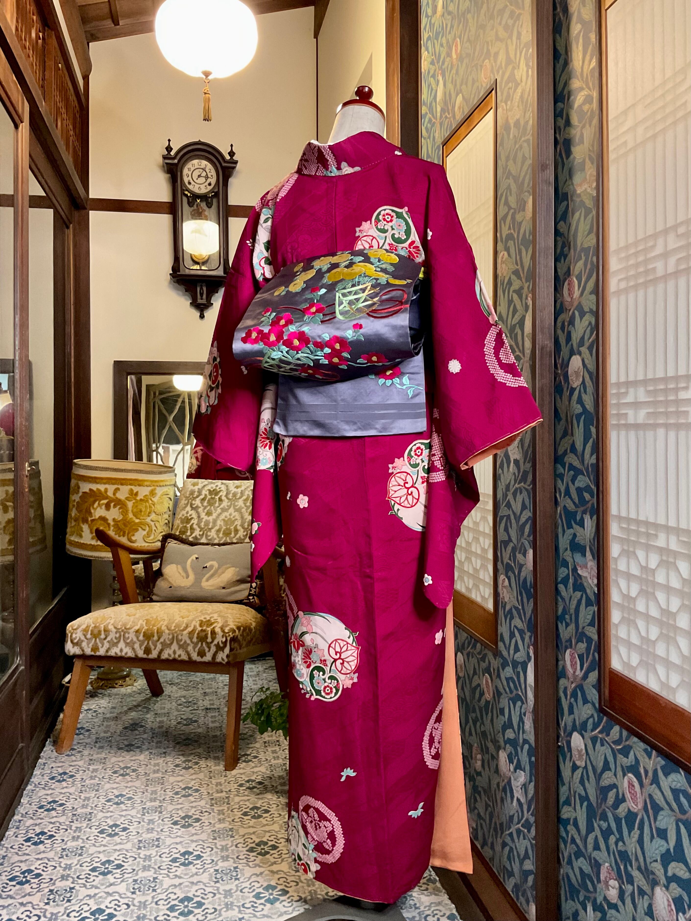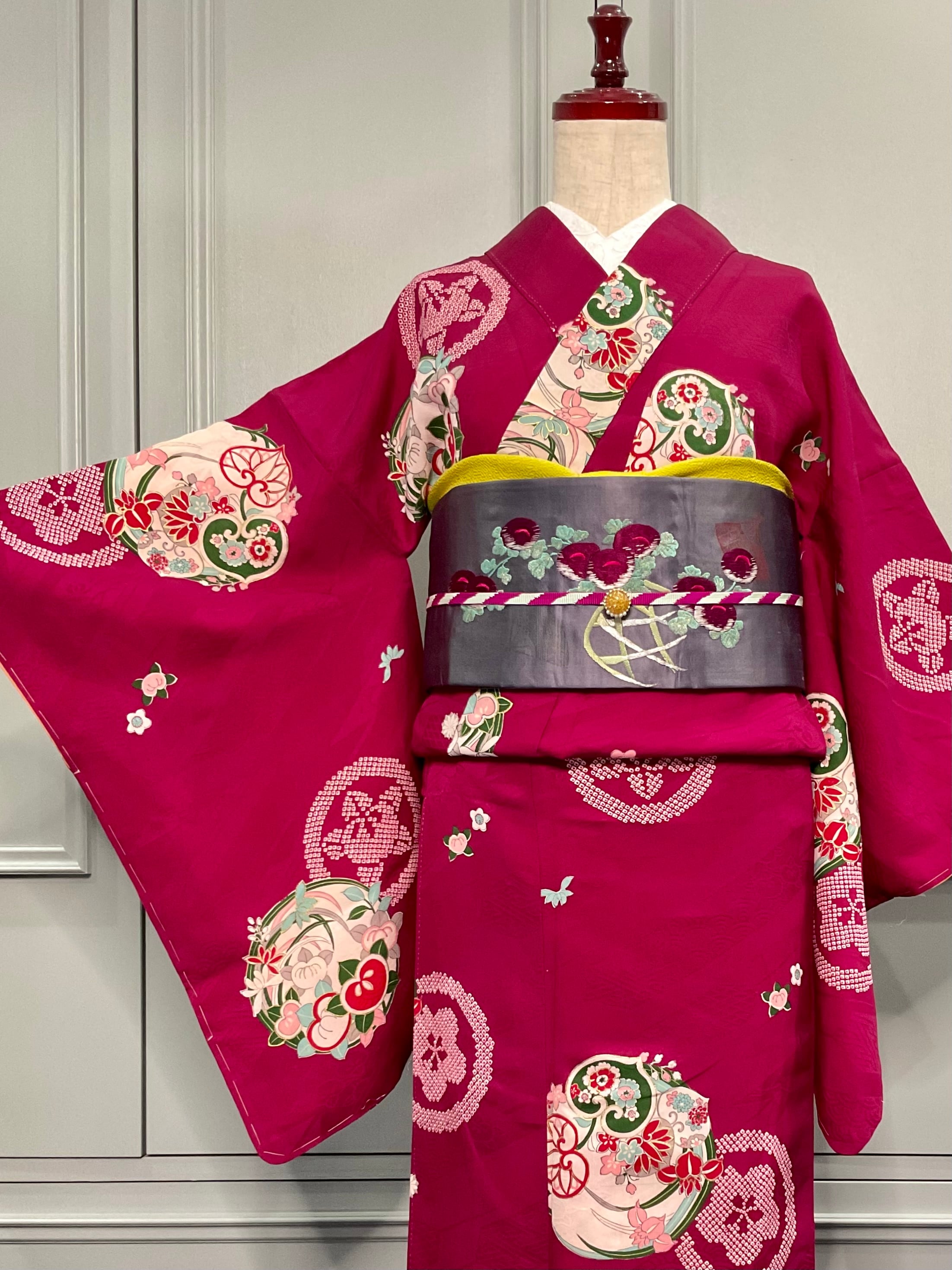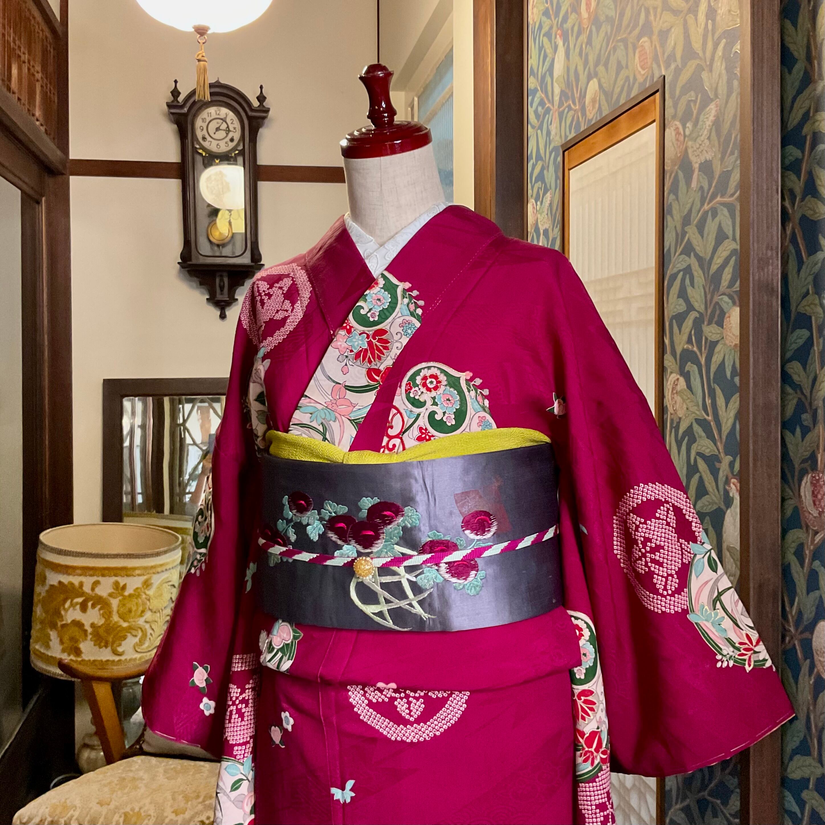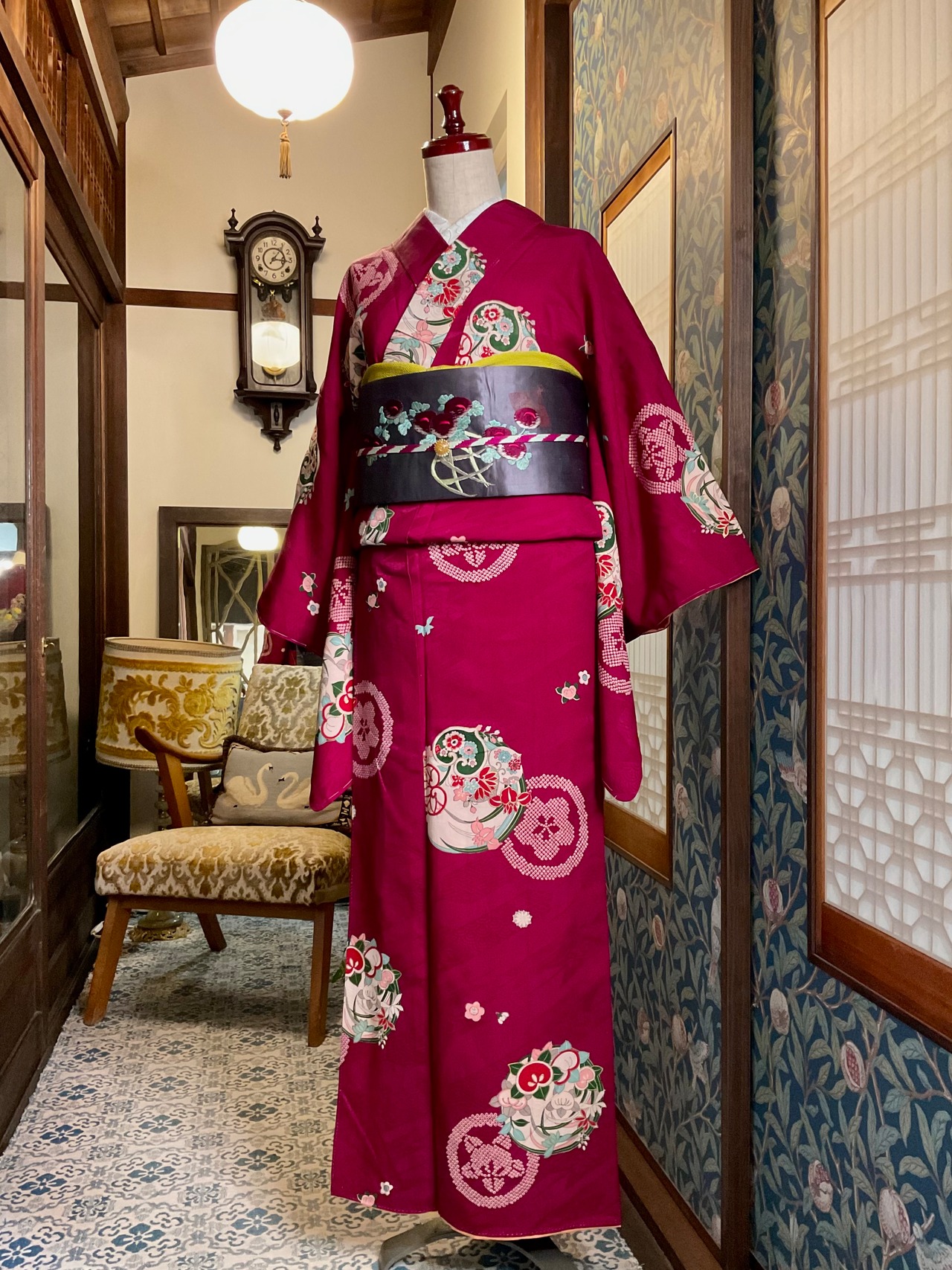 深みのある深紅色に、よく見ると、うっすら地紋の矢羽根柄が浮かび上がり、染め模様が描かれてない部分も綺麗ですね✨