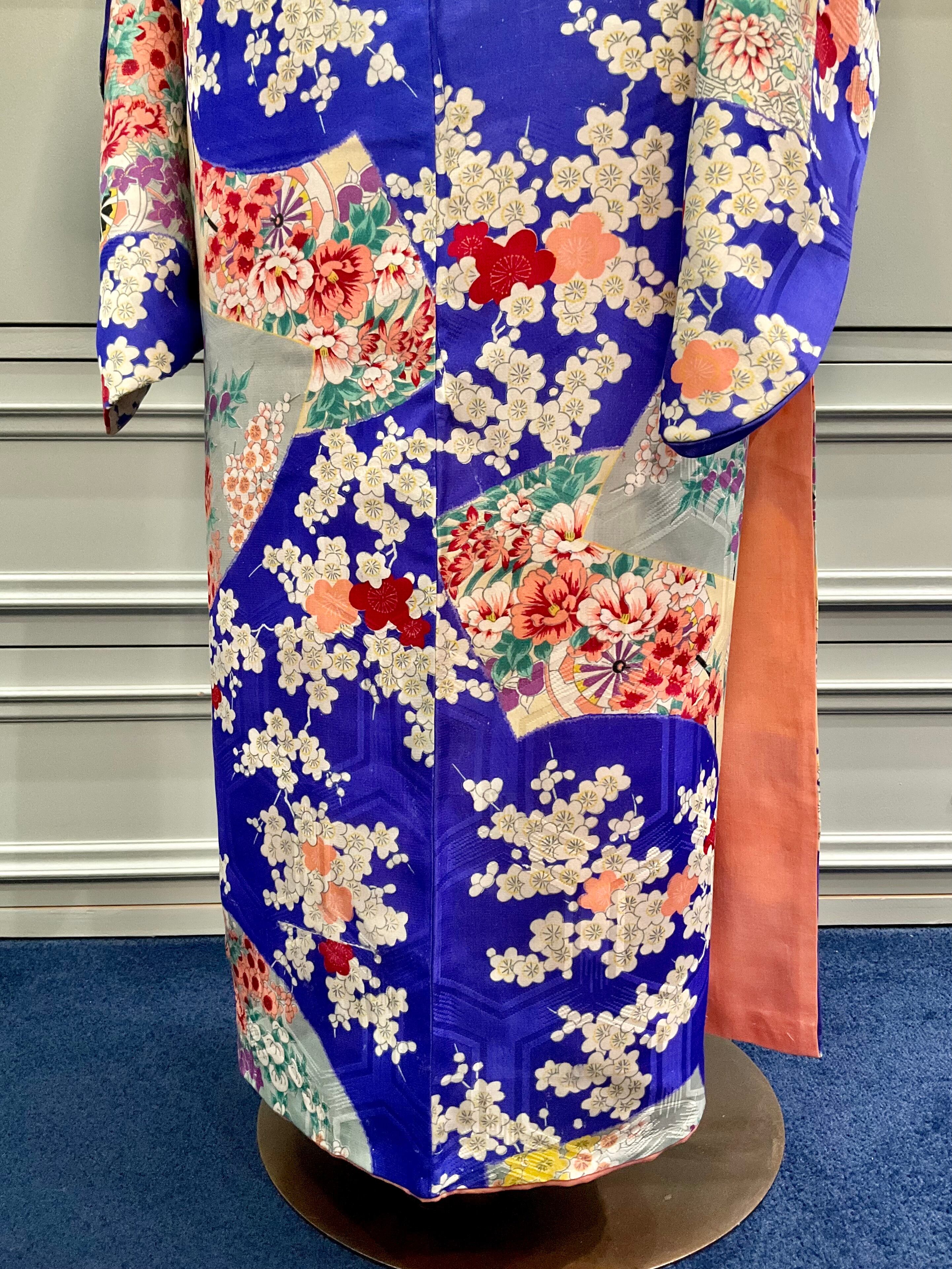 鮮やかに澄んだ瑠璃色の地に、四季の花が描かれた扇面や、梅の模様が美しい袷のアンティーク小紋着物です♪