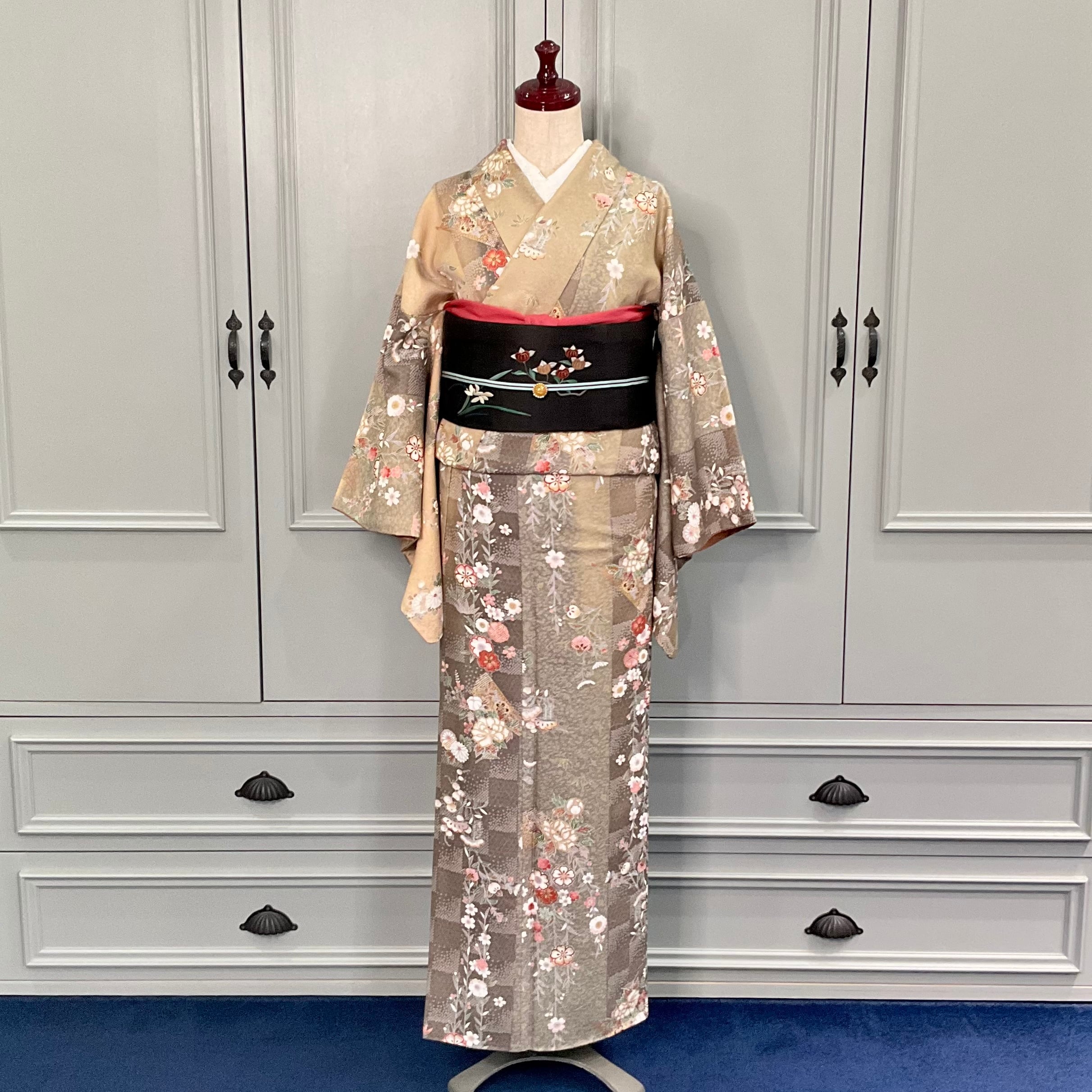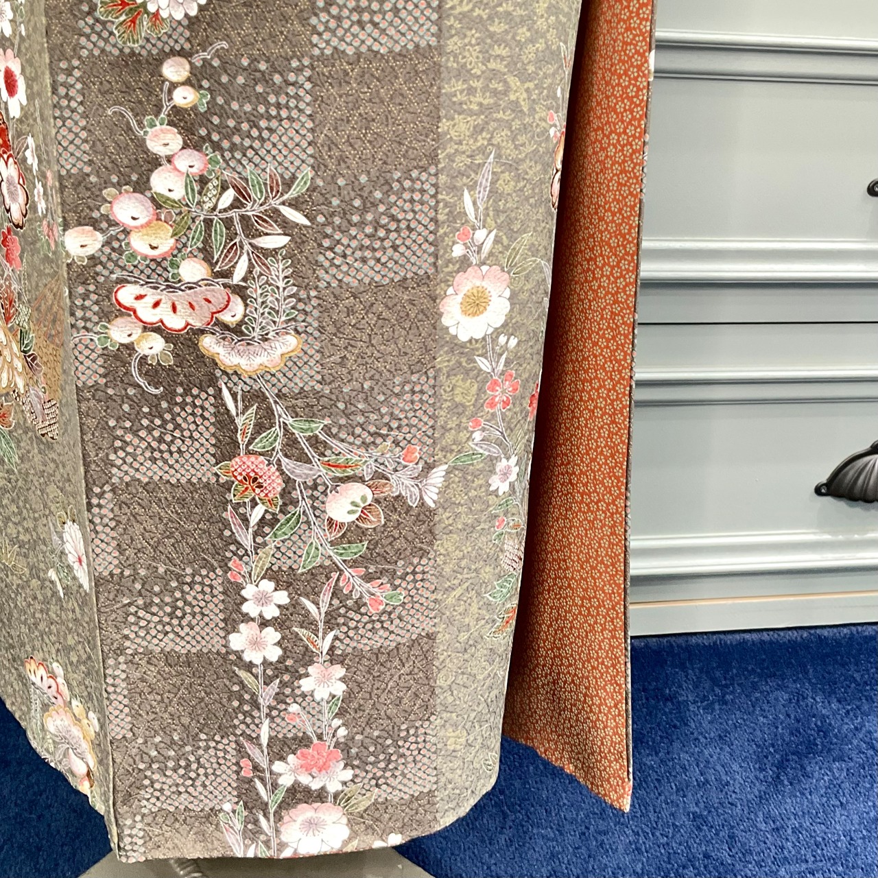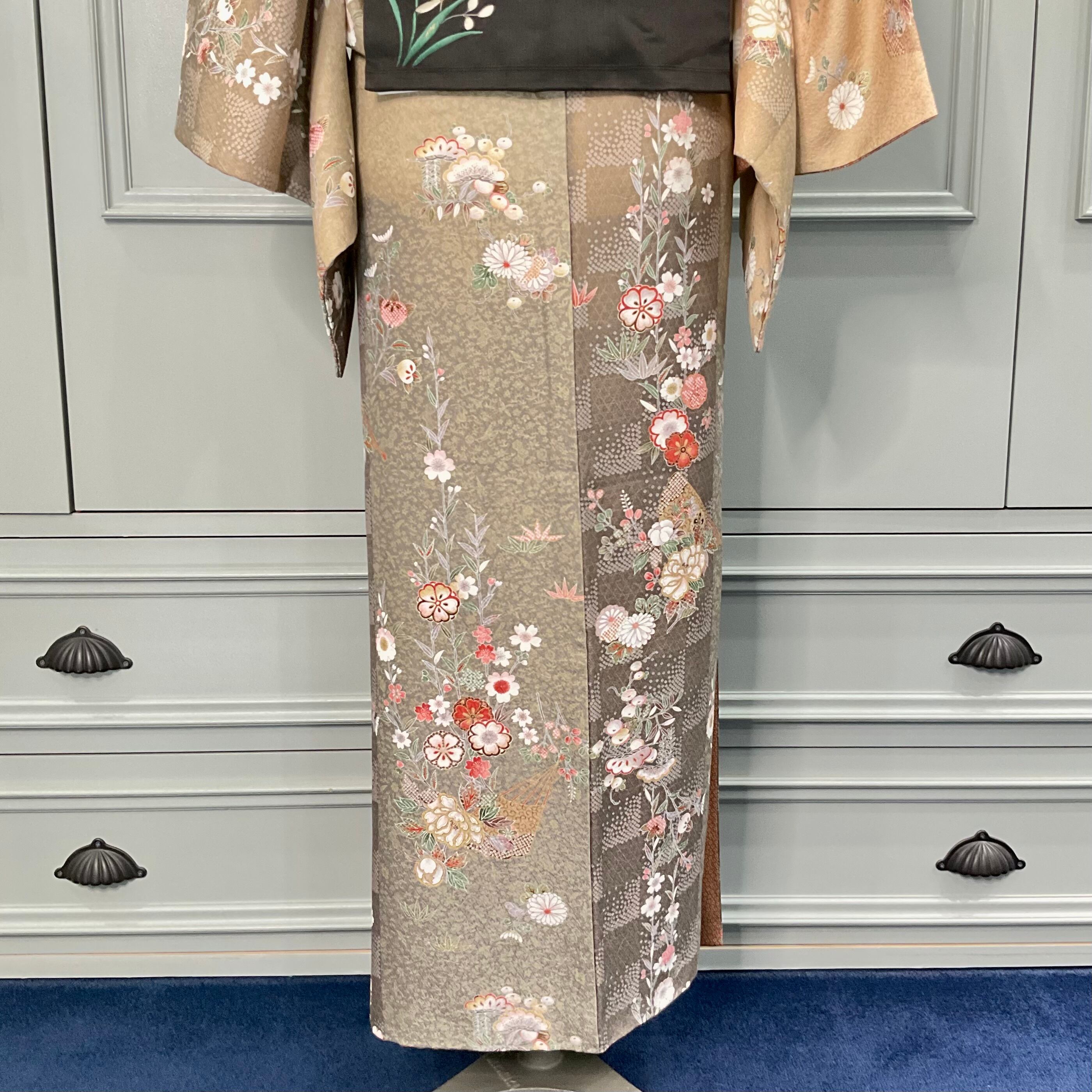 カーキからオリーブ色のグラデーションに秋から冬、春への移りゆく季節を表すような花模様が素敵な袷のリサイクル小紋着物です