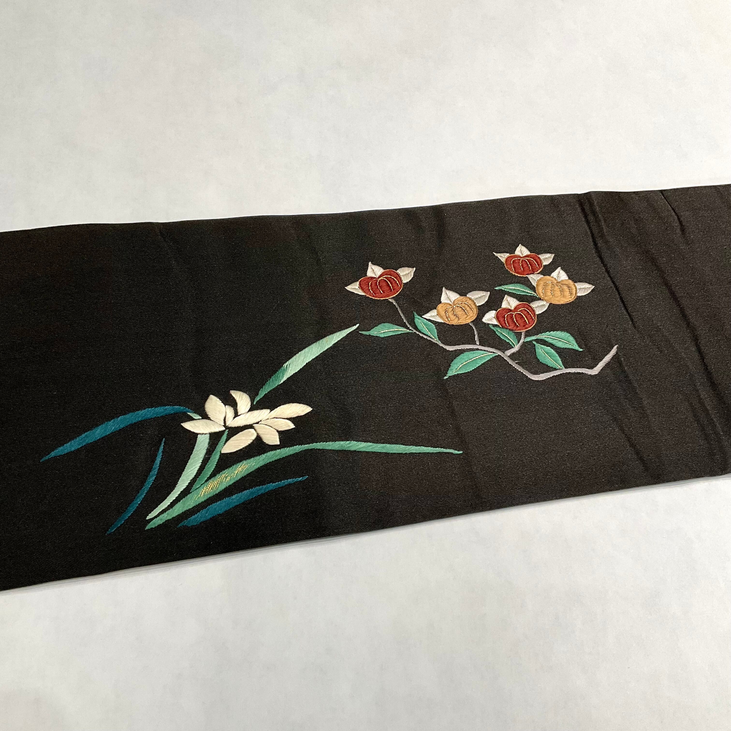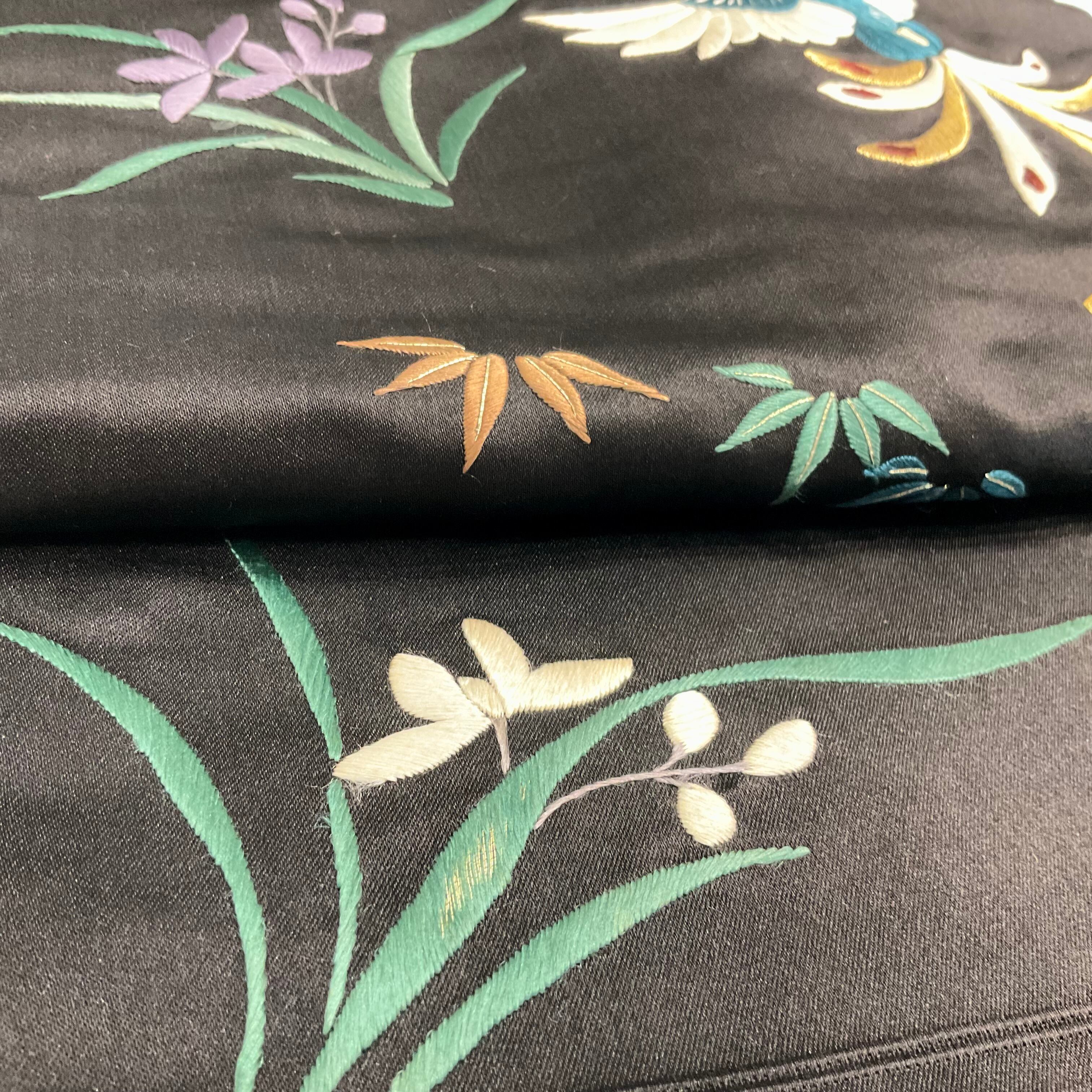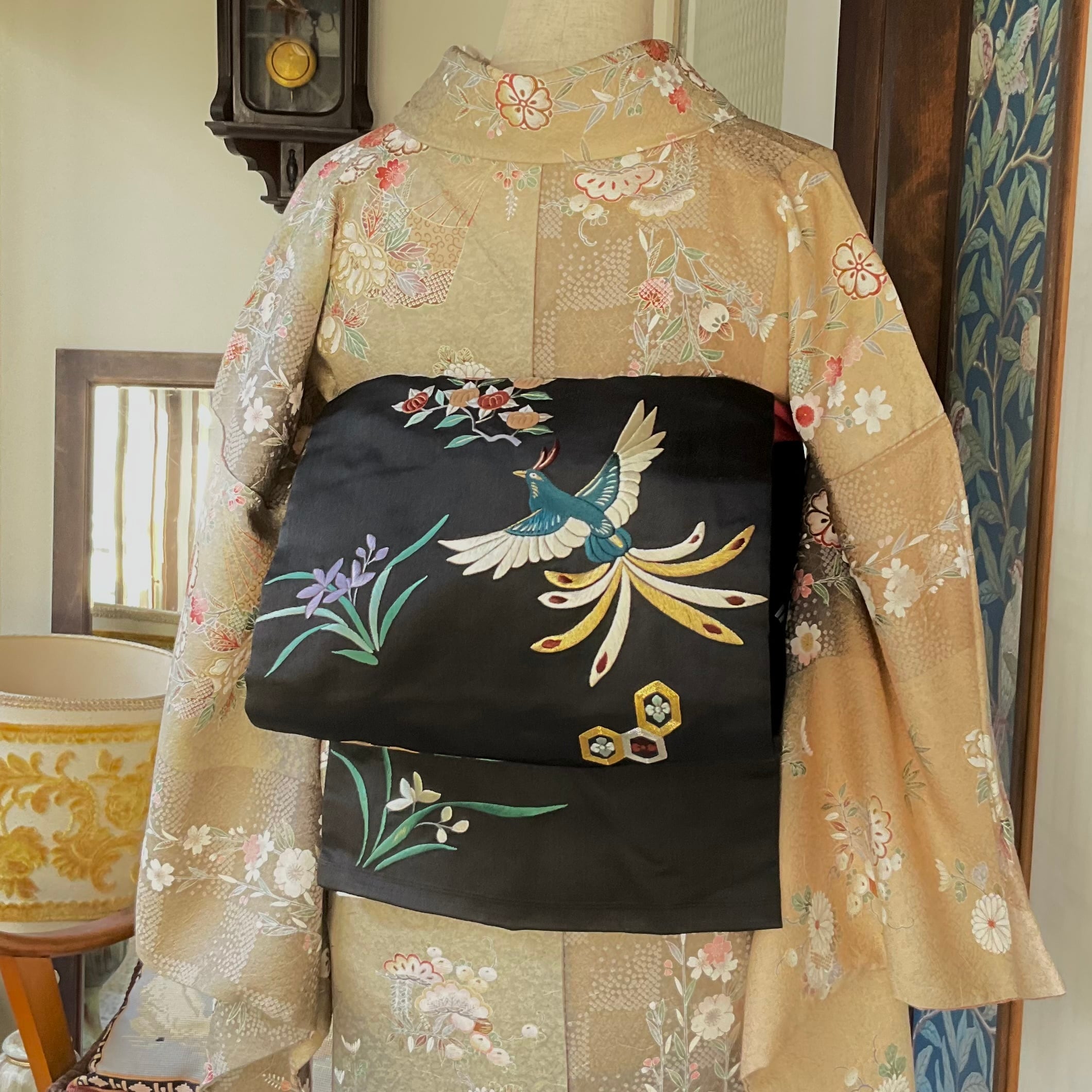 コーディネートしやすい黒繻子地に鳳凰や草花の刺繍が印象的なアンティーク名古屋帯です✨