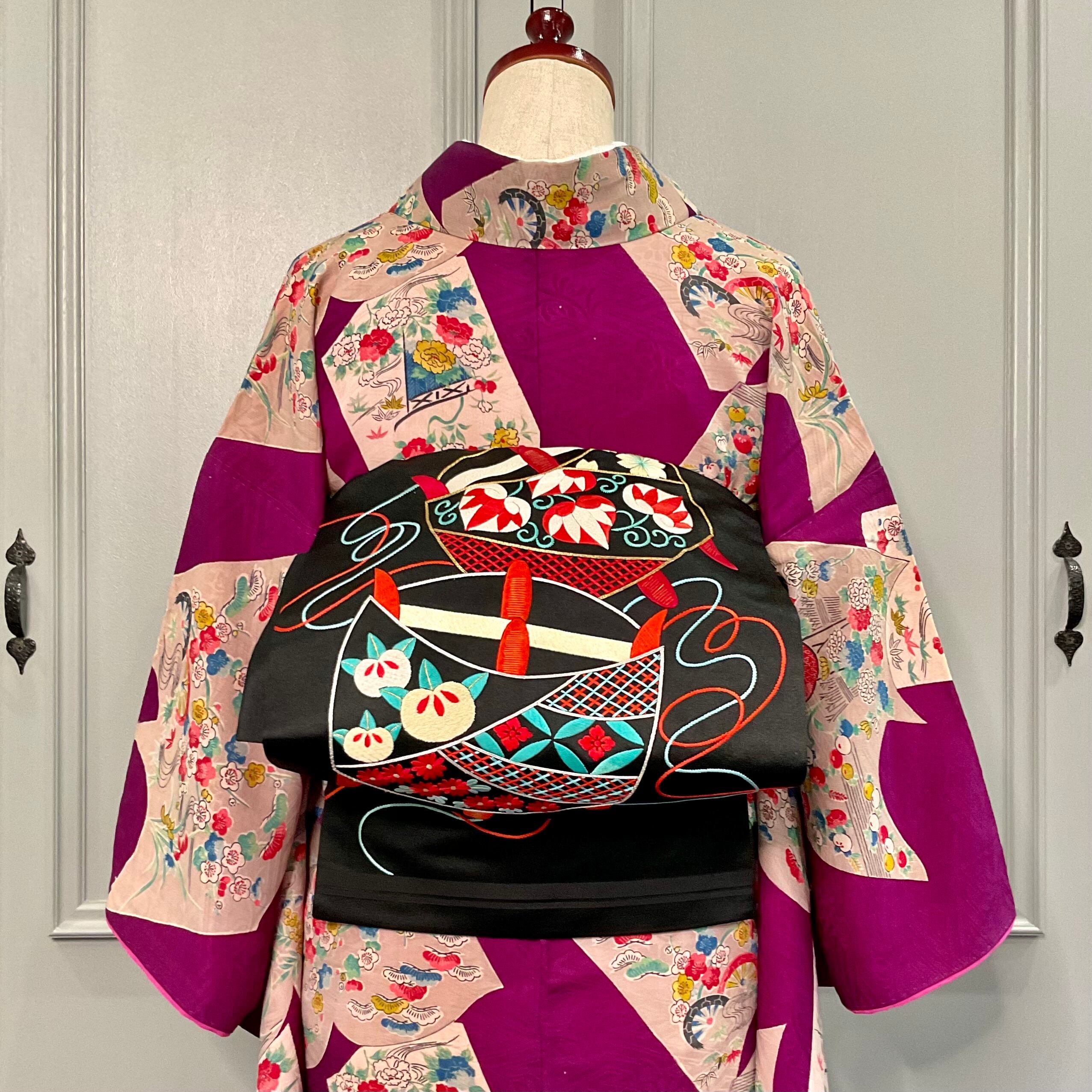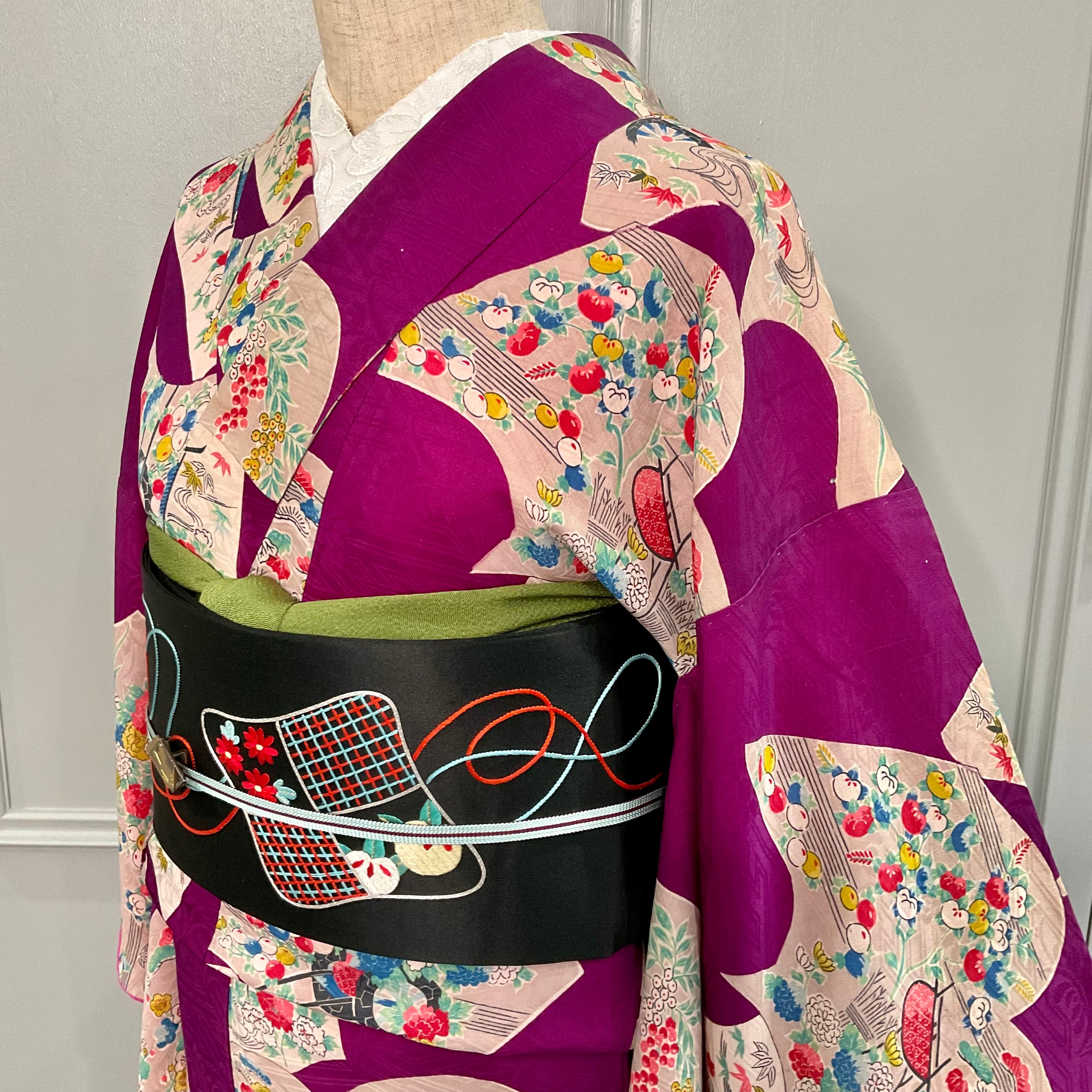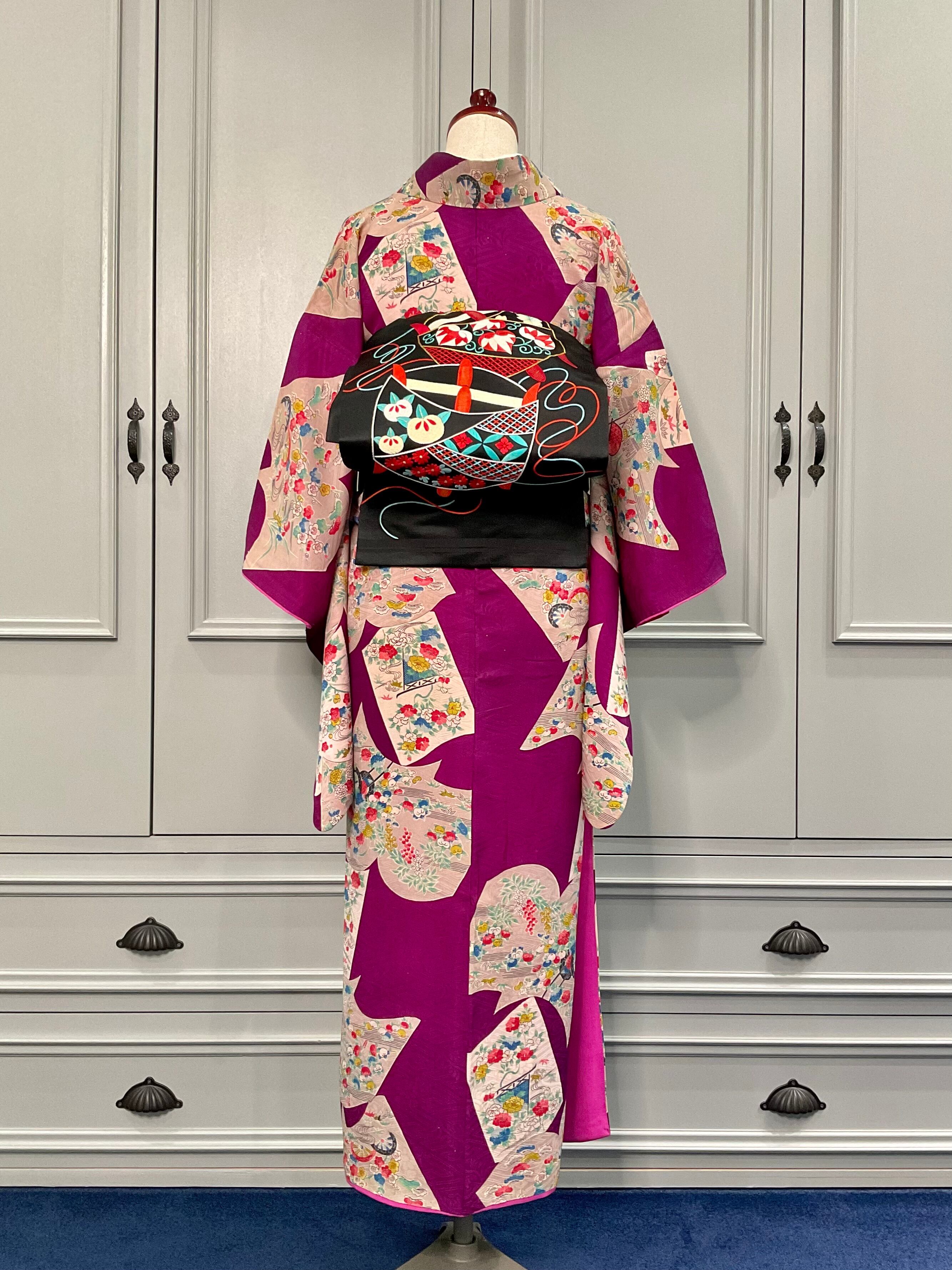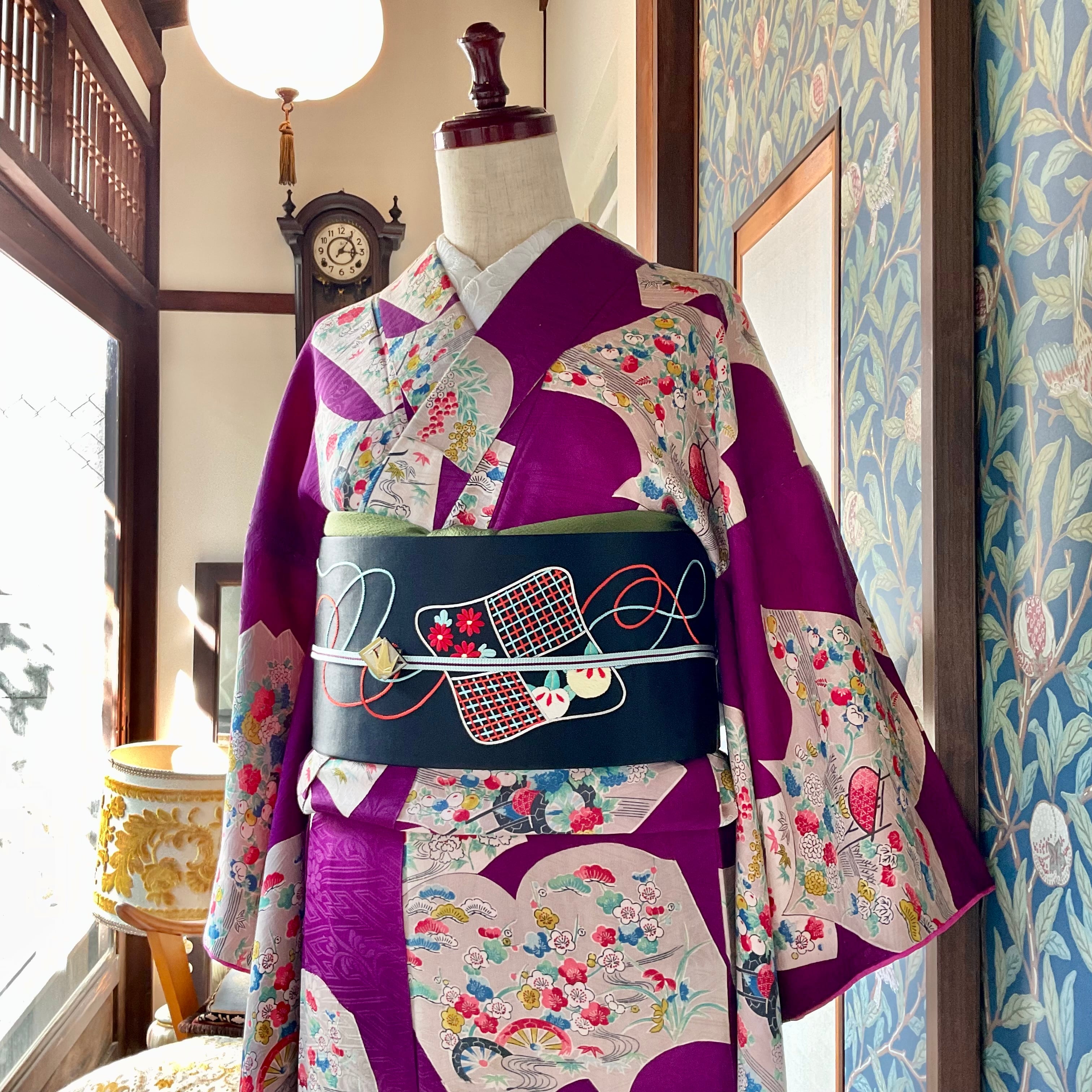 アンティーク着物らしい美しい紫に、古典的な雰囲気の四季のお花が細やかに描かれた読み本柄が、読書の秋にぴったりな一着✨