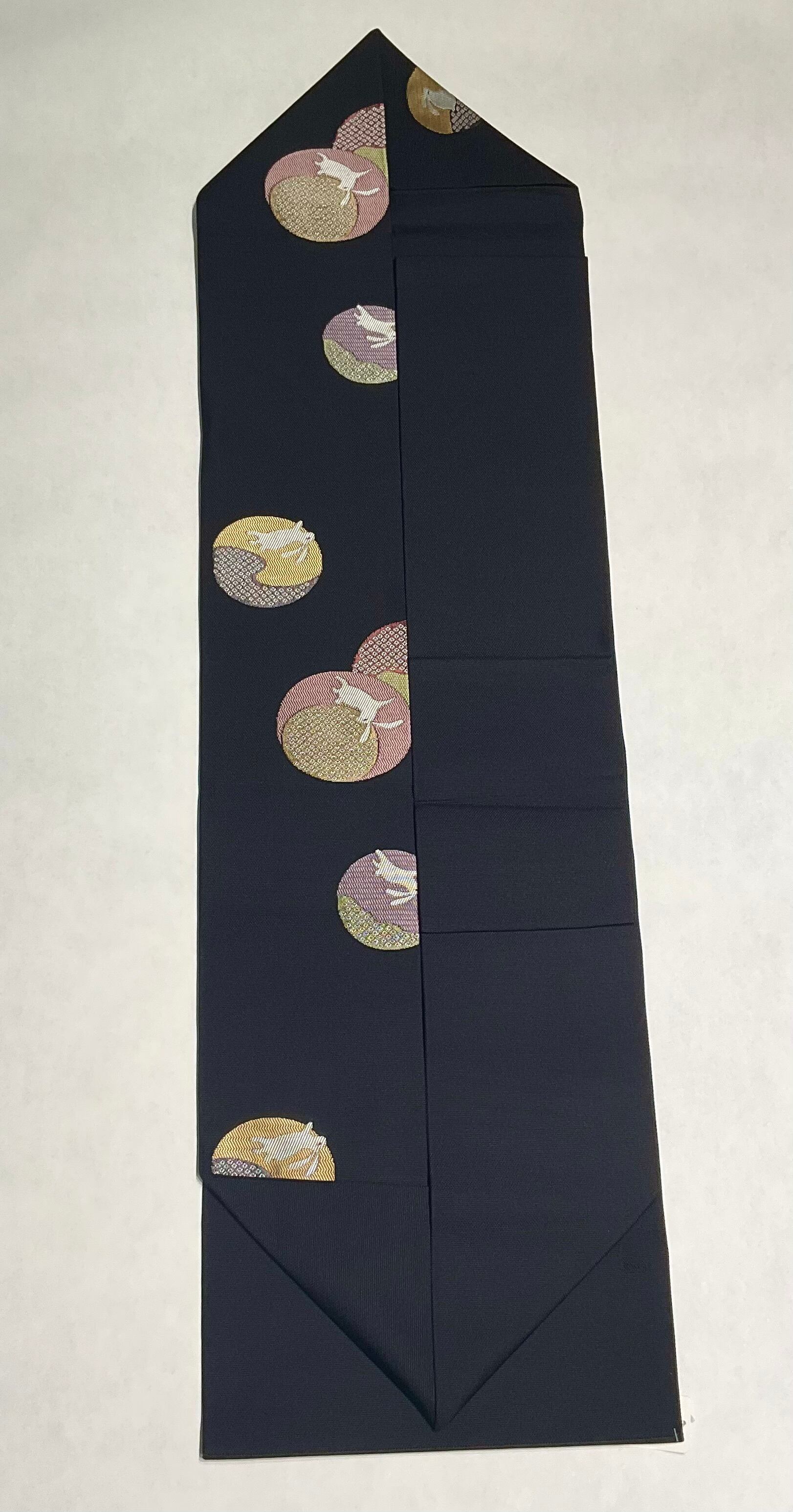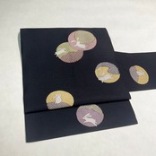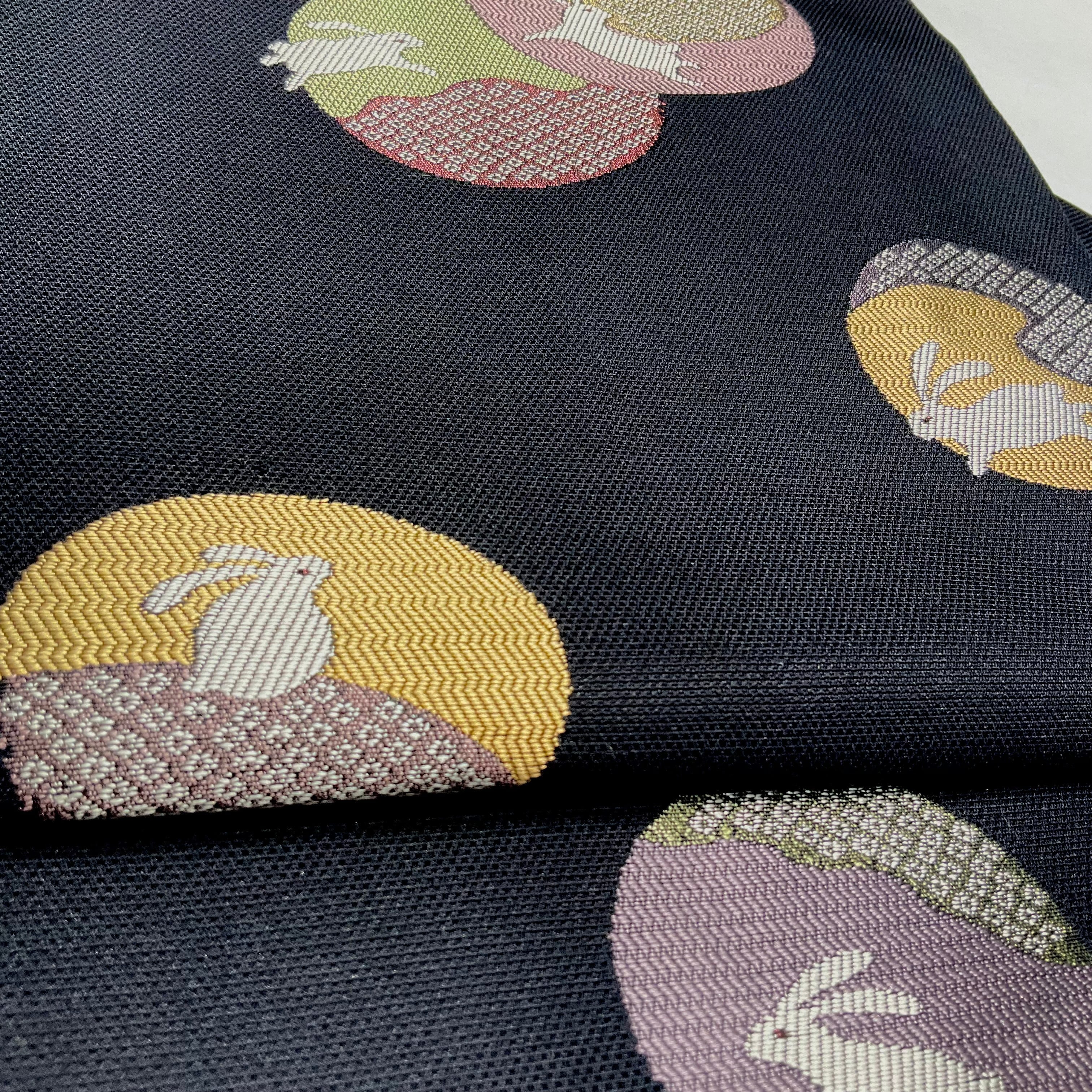 黒地にお月見うさぎの織模様が可愛いらしいリサイクル名古屋帯です
