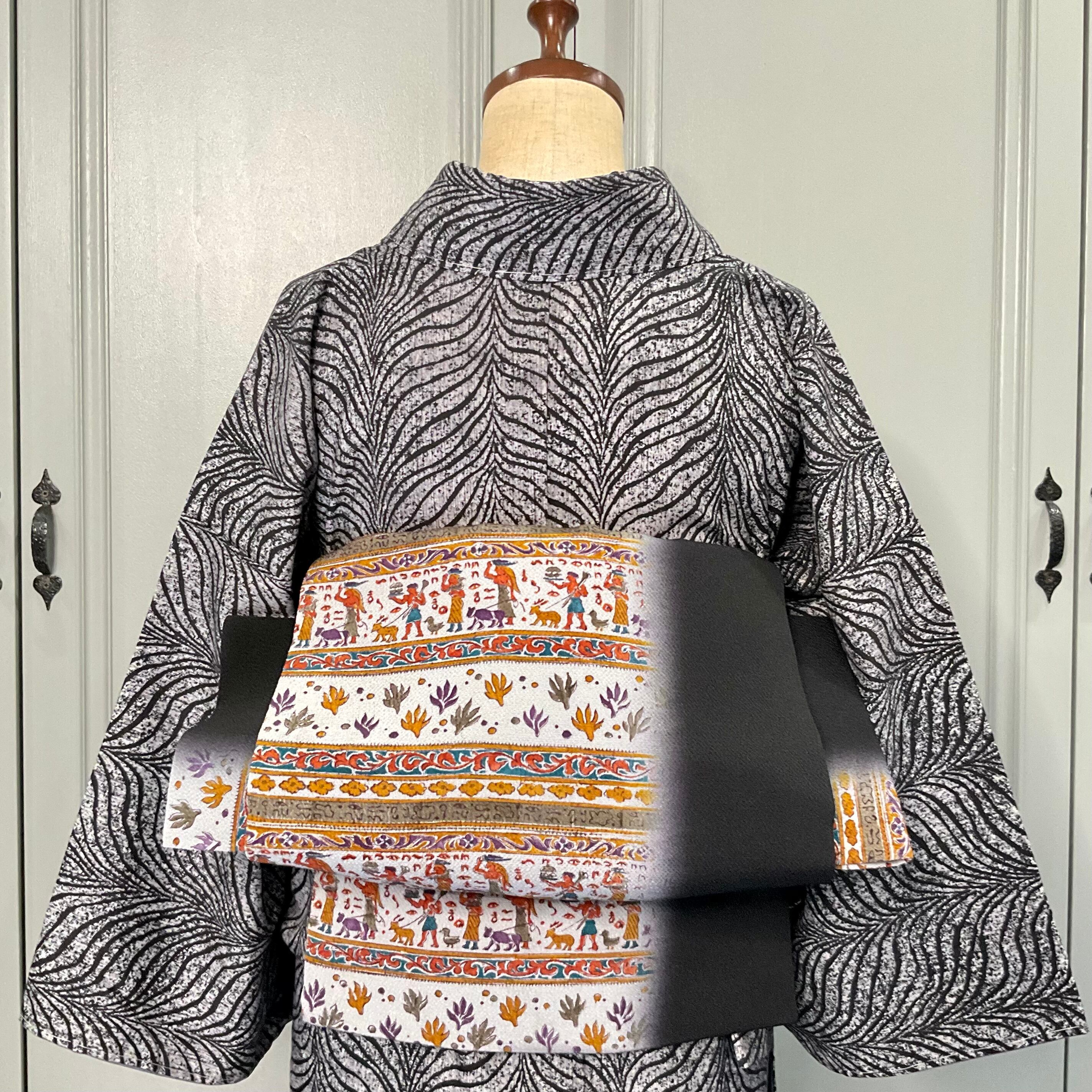 縮緬地に黒×エスニックな壁画(ミューラル)が描かれたオリエンタルなリサイクル名古屋帯です