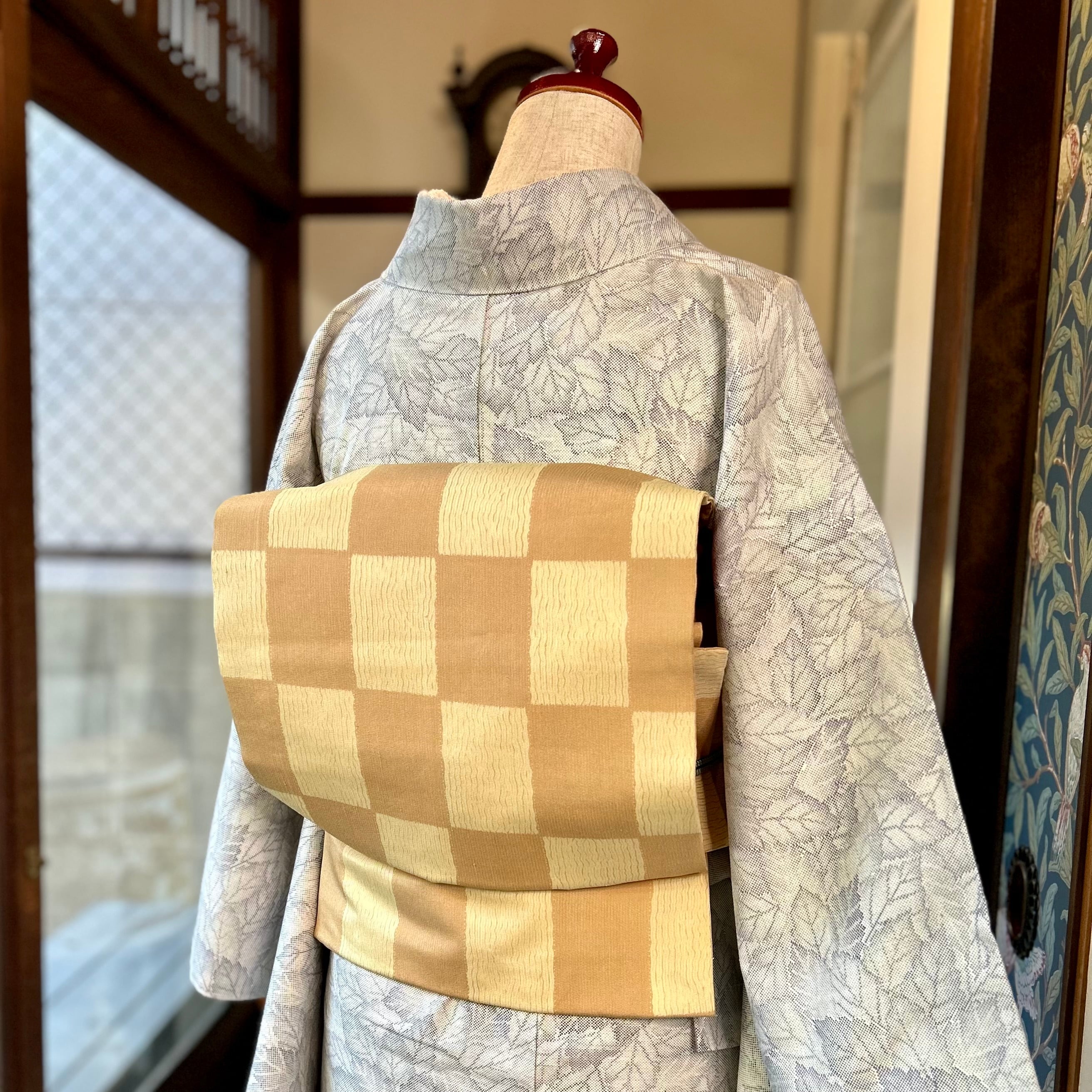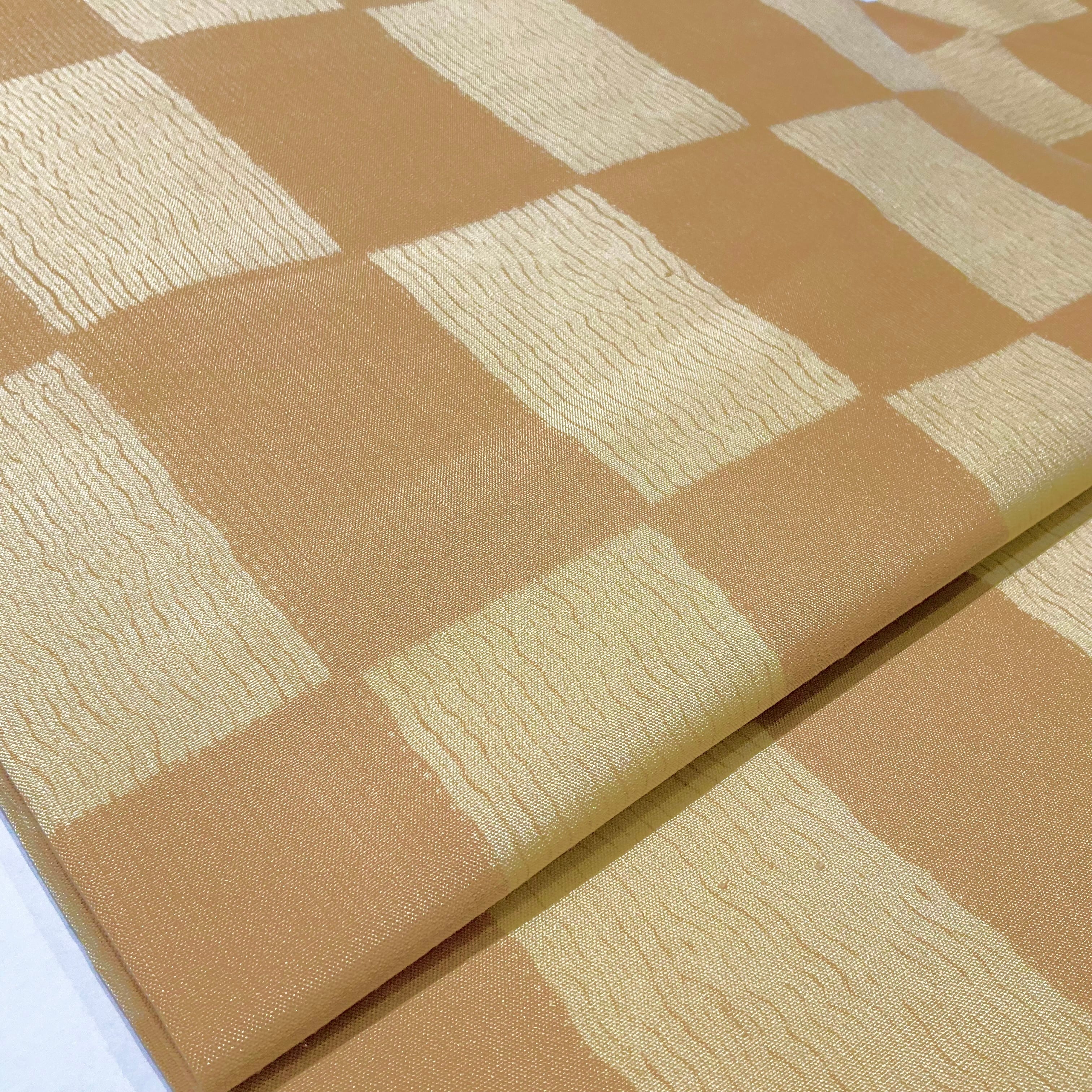tea time*杢目絞り チェック ビスケットブラウン 市松模様 リサイクル名古屋帯 A422