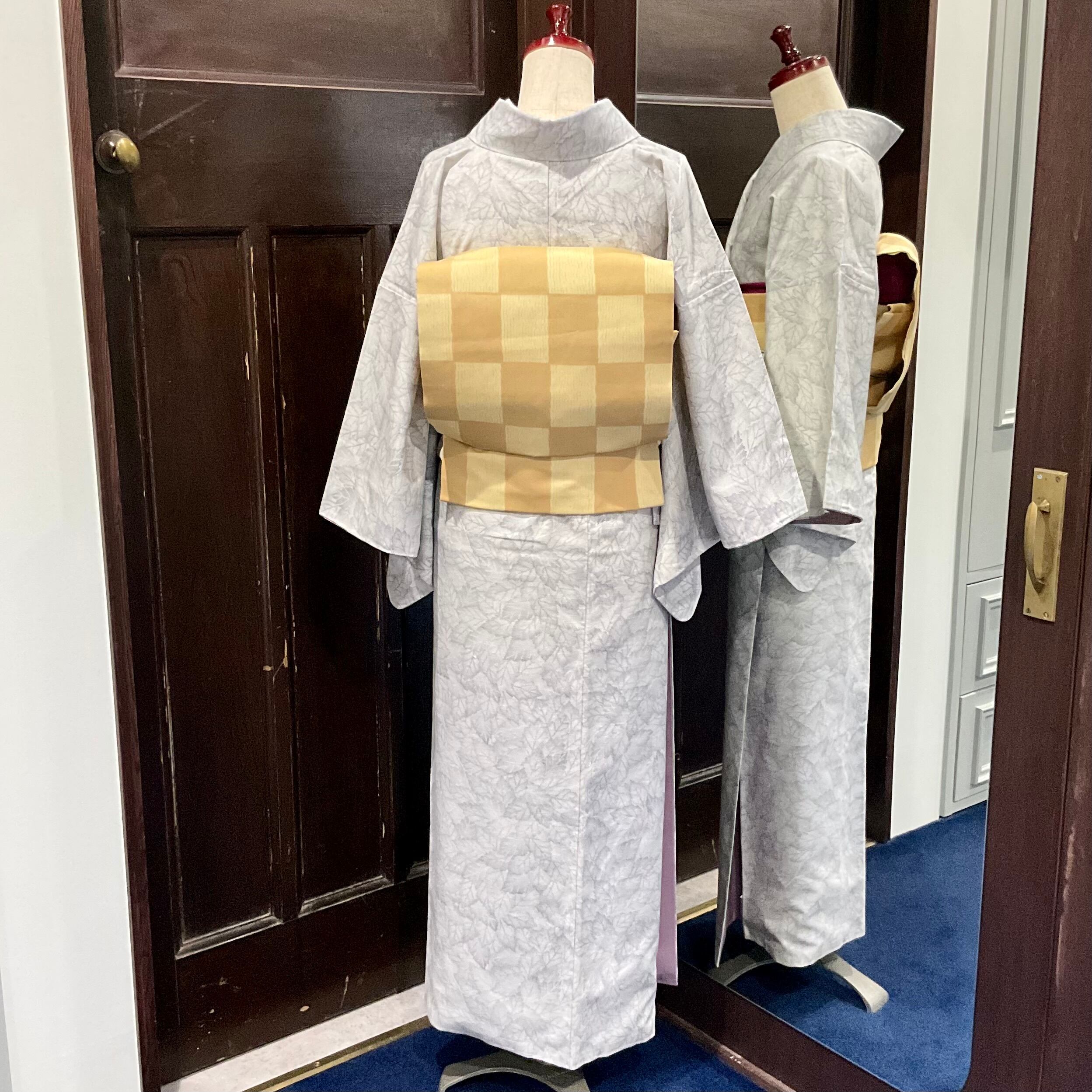 市松模様で染められた鋭角なデザインながらも、絞りによって木目のような模様がやわらかく上品で、とても秀逸です♪