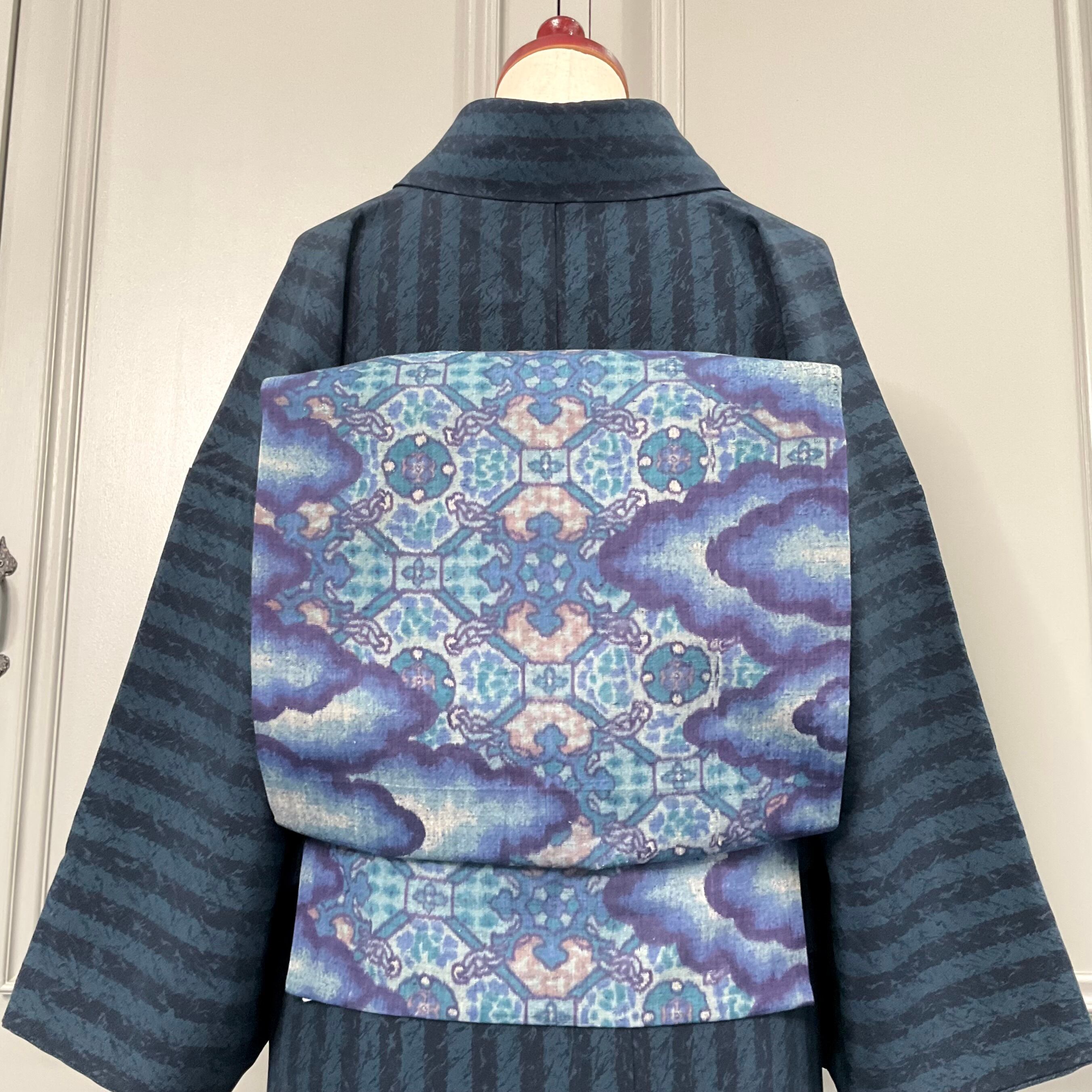 縦ラインのストライプなので、帯もどんな柄でも合わせやすく、着た時にスッキリ見えるのが良いですよね!