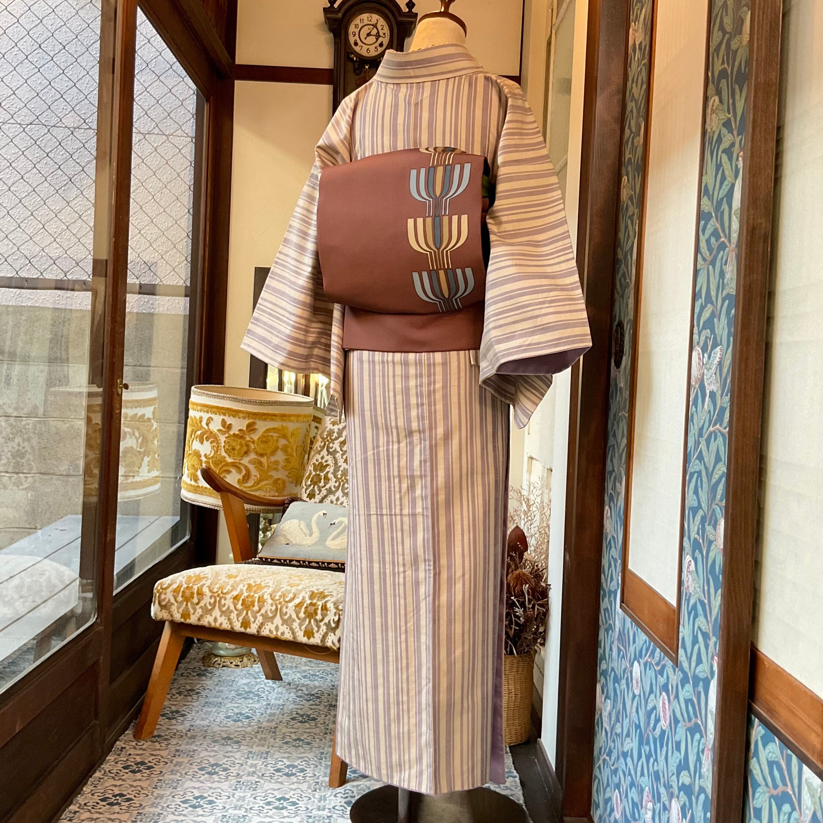 くすみパープルのやわらかいお色目の縦縞と紬のあたたかい雰囲気がこれからの季節に合いますね✨