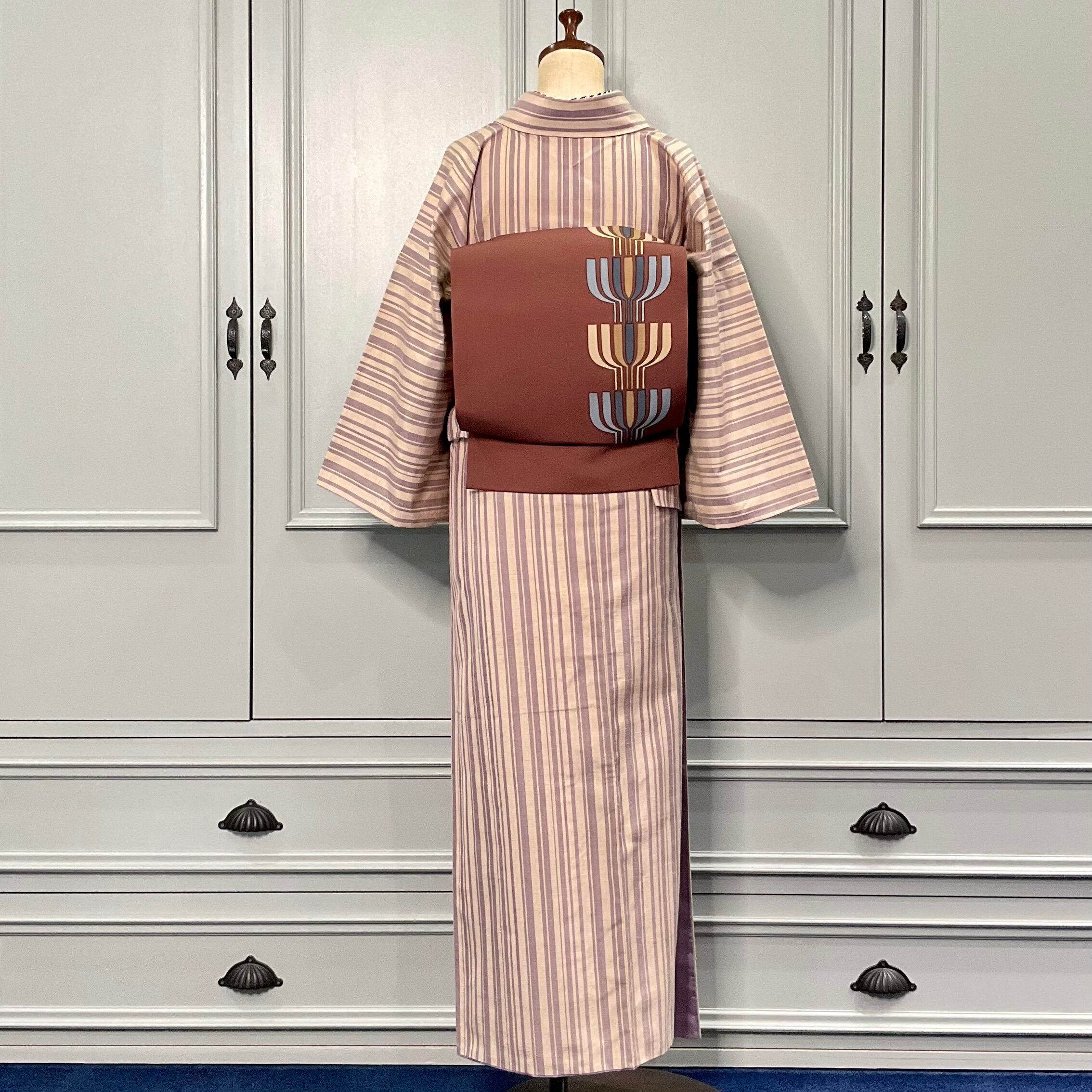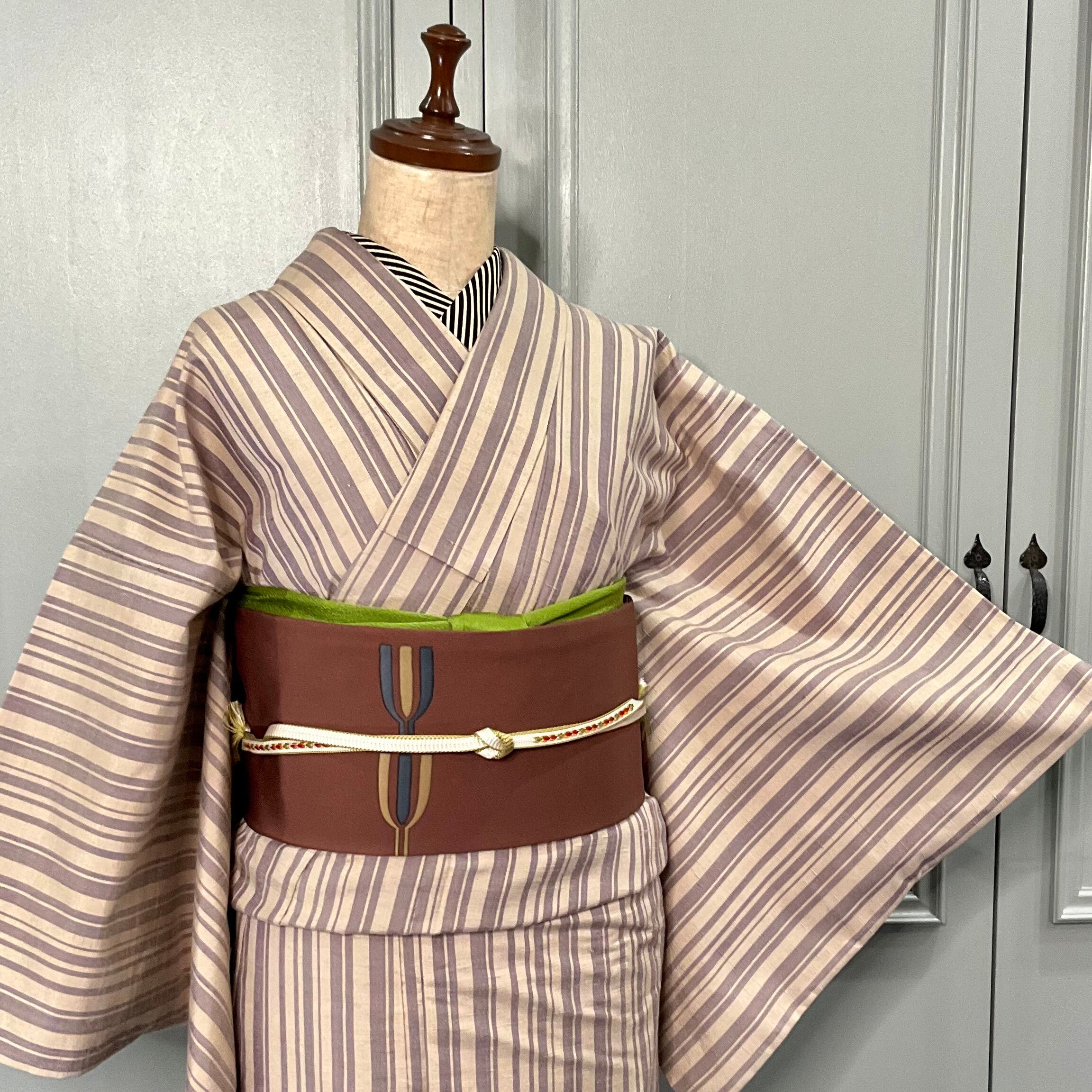 縦ラインのストライプなので、どんな柄の帯も合わせやすく、着た時にスッキリ見えるのが良いですよね!