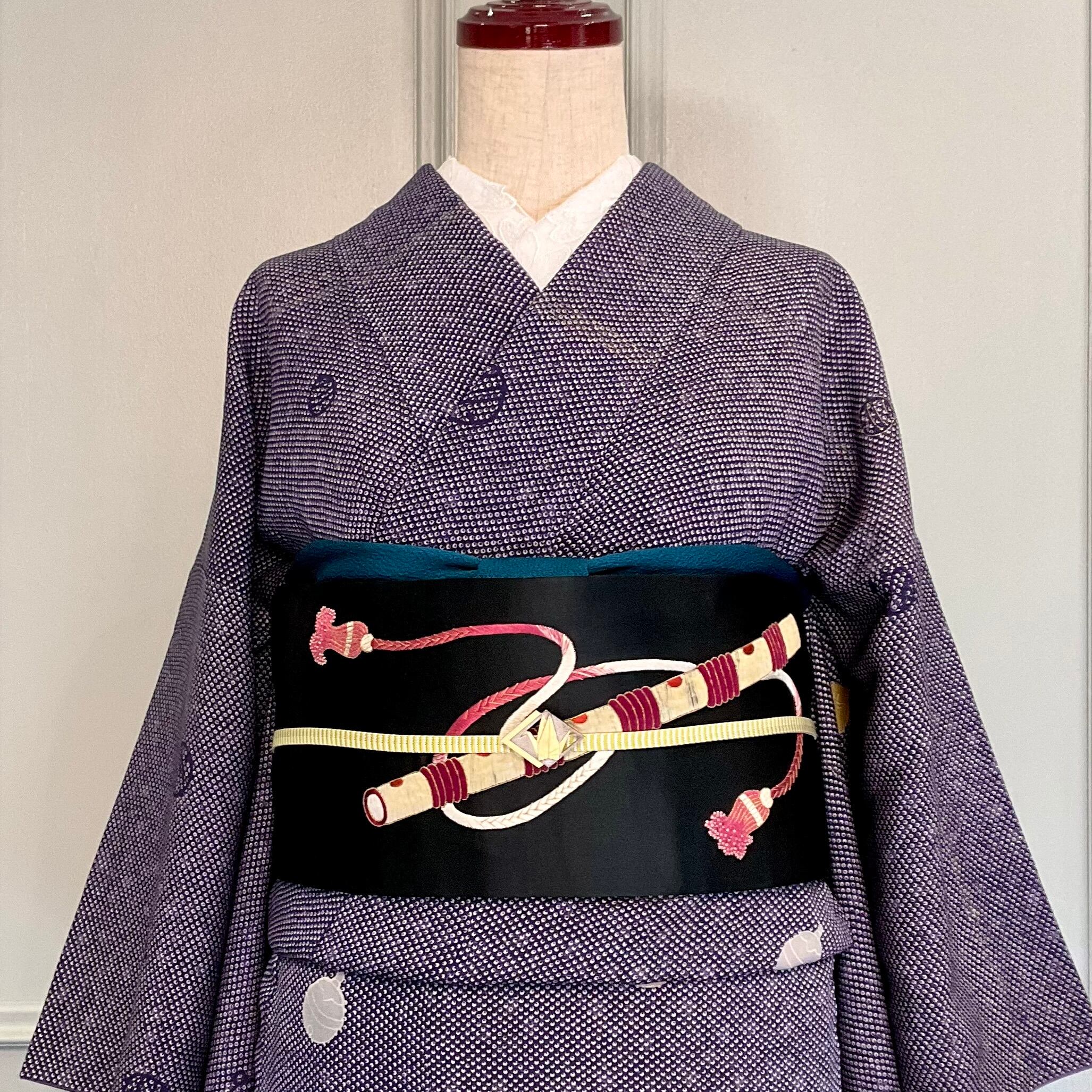 黒繻子地に、日本の古い雅楽の楽器が刺繍された美しいアンティーク名古屋帯です。