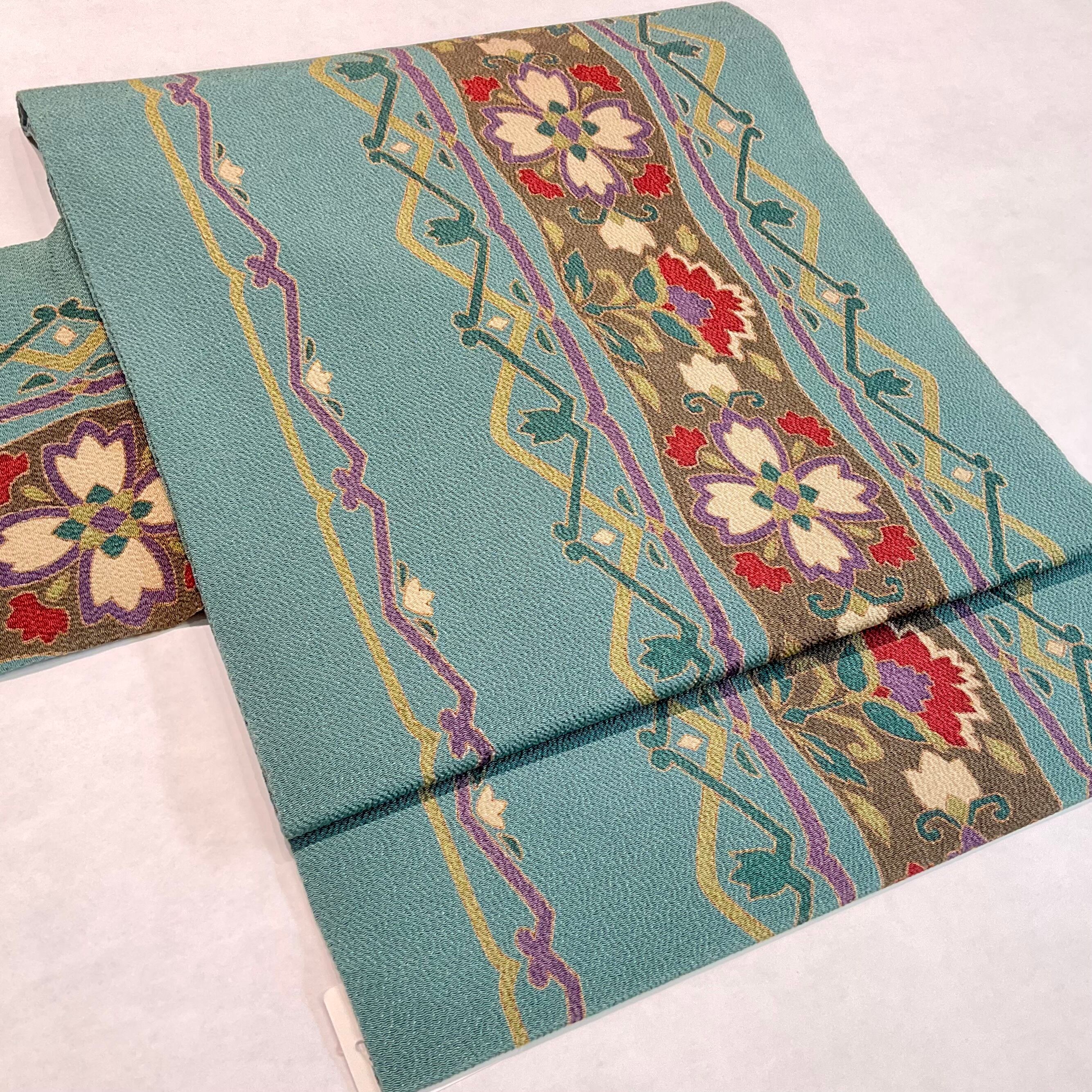 くすんだ淡いグリーン系の地色に、お花模様と飾り罫線がデザインされた名古屋帯です♪