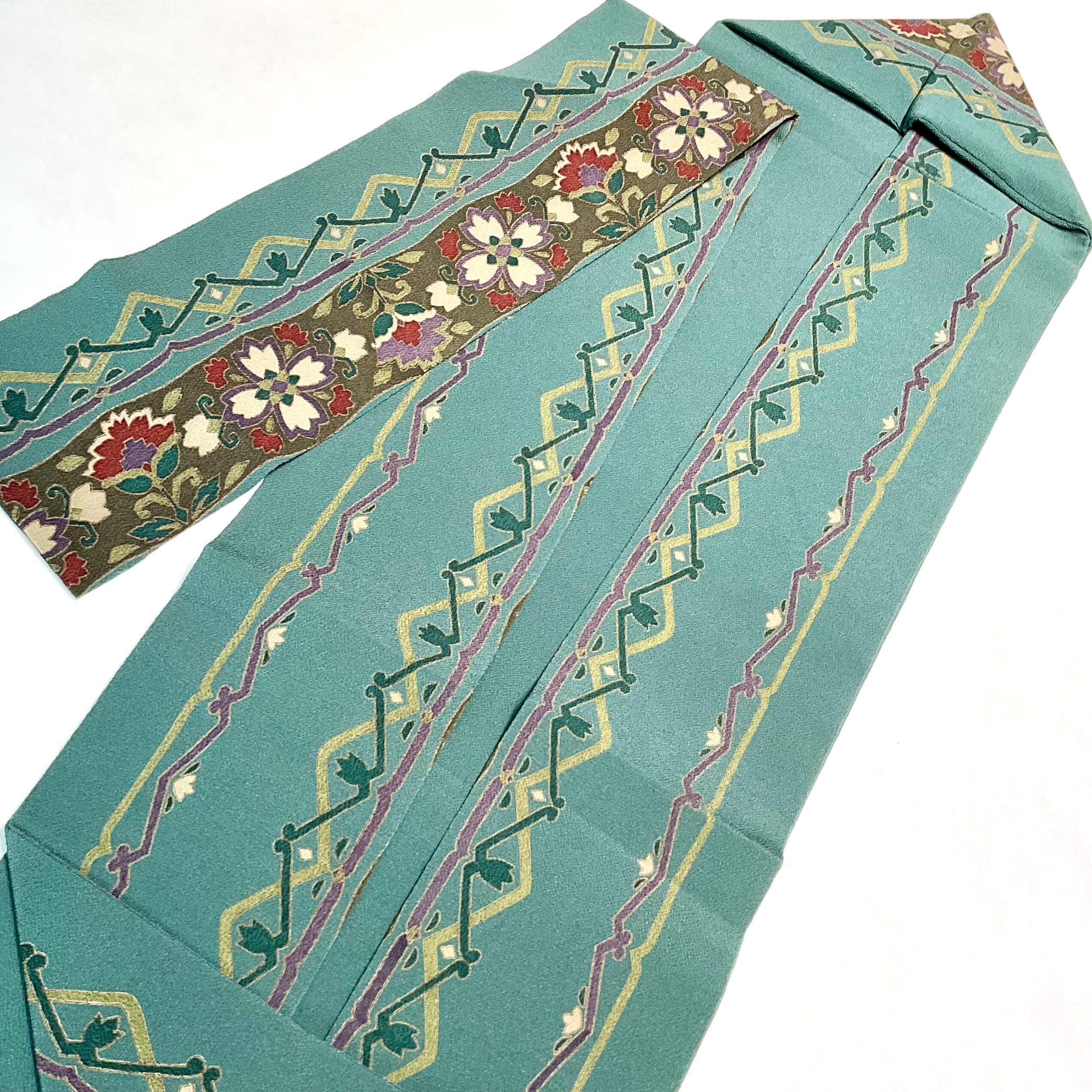 Decorative lines*名古屋帯 縮緬 花模様 グリーン 緑 紫 ヨーロピアン リサイクル名古屋帯 A444