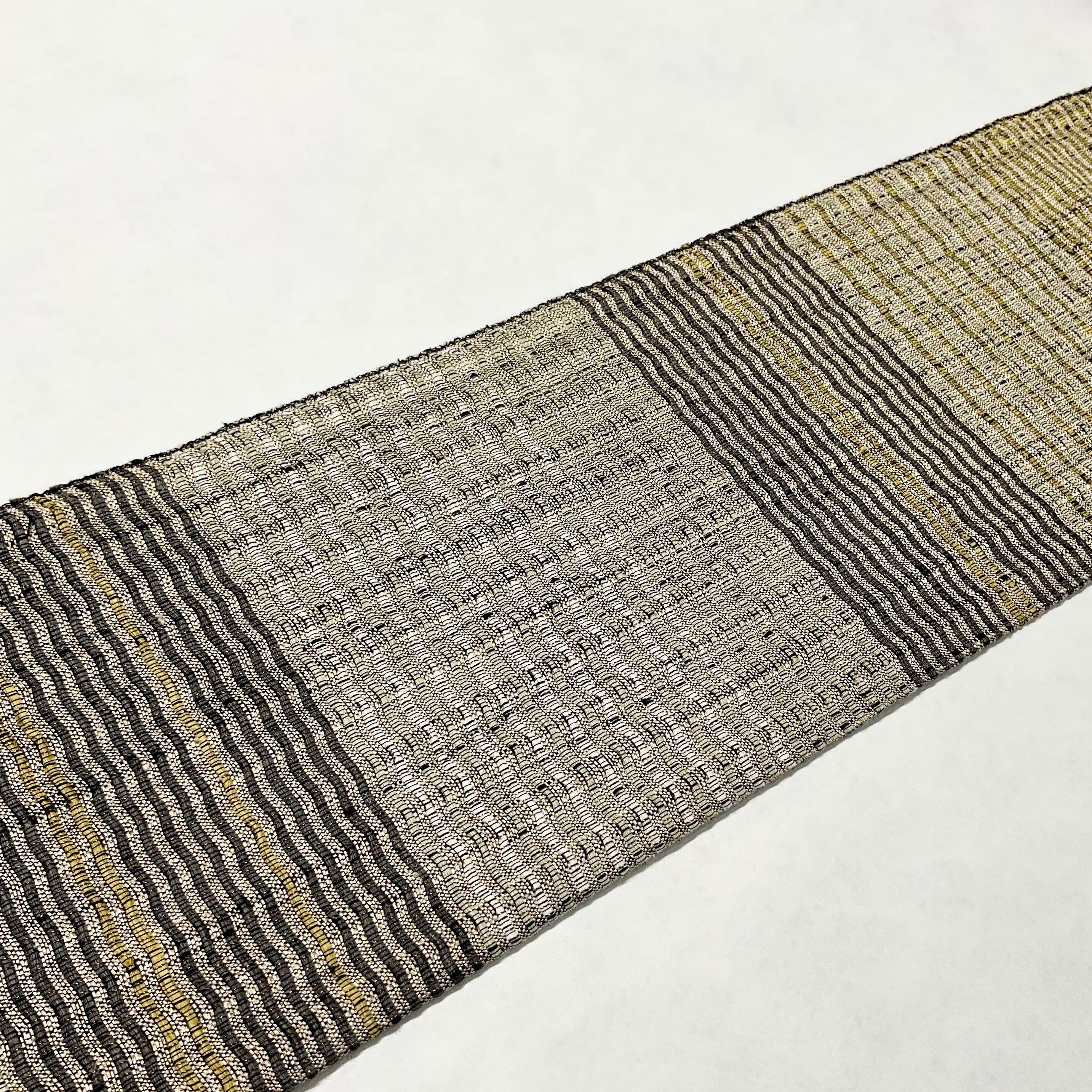 帯地をよく見ると、薄緑、黄色、灰色の緯糸を波を打つように曲線で織り合わせています