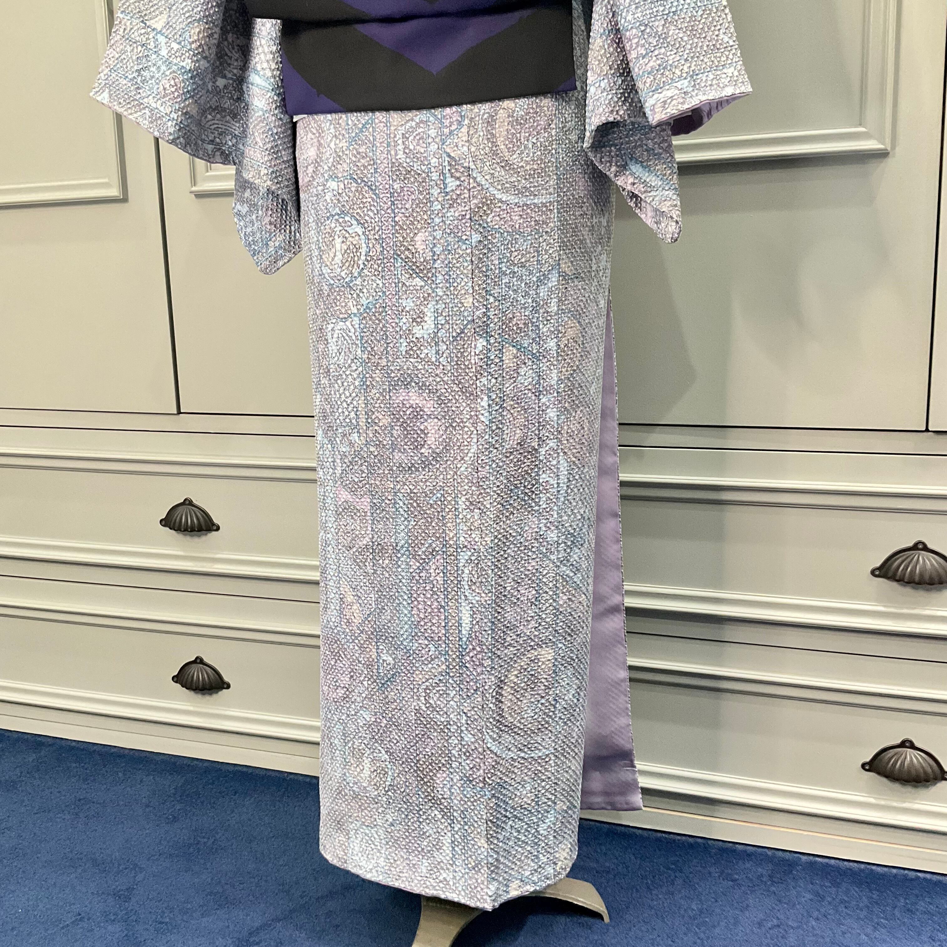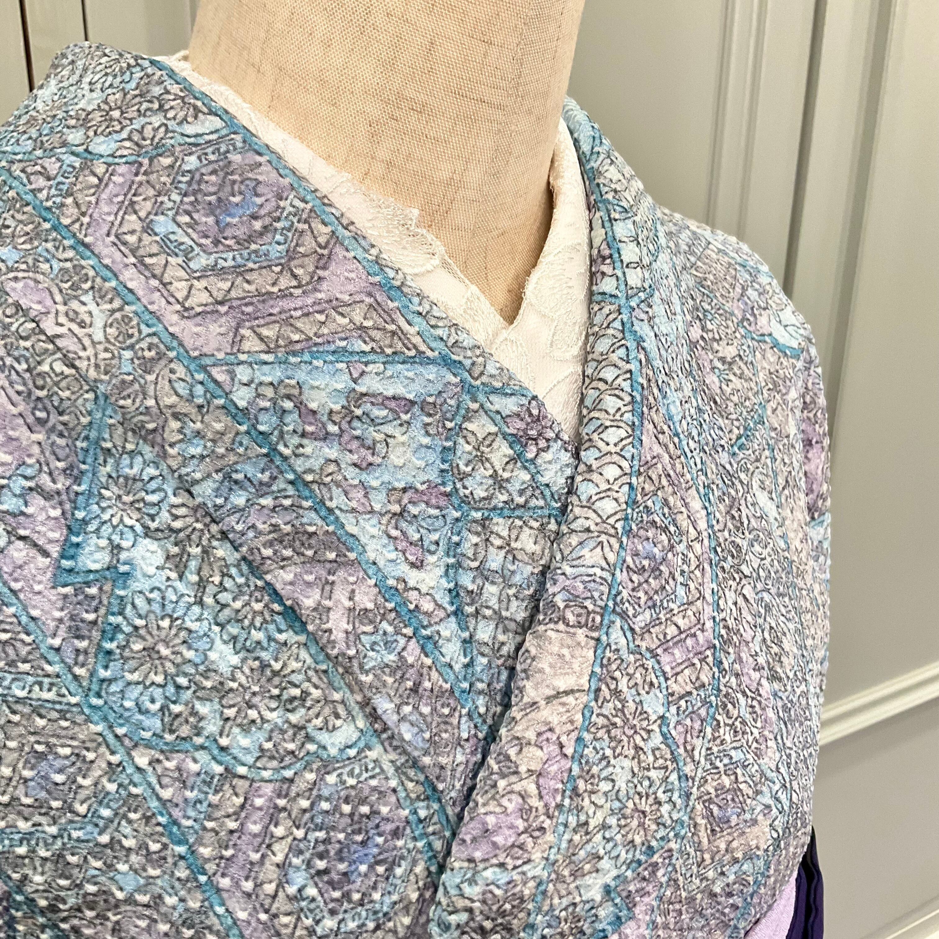 シックなくすみカラーの中にパープルやグリーン、イエローがパッと華やぎ、ふっくらとした凹凸が絞り染めの質感やシボ感を表していて、上品な装いになります
