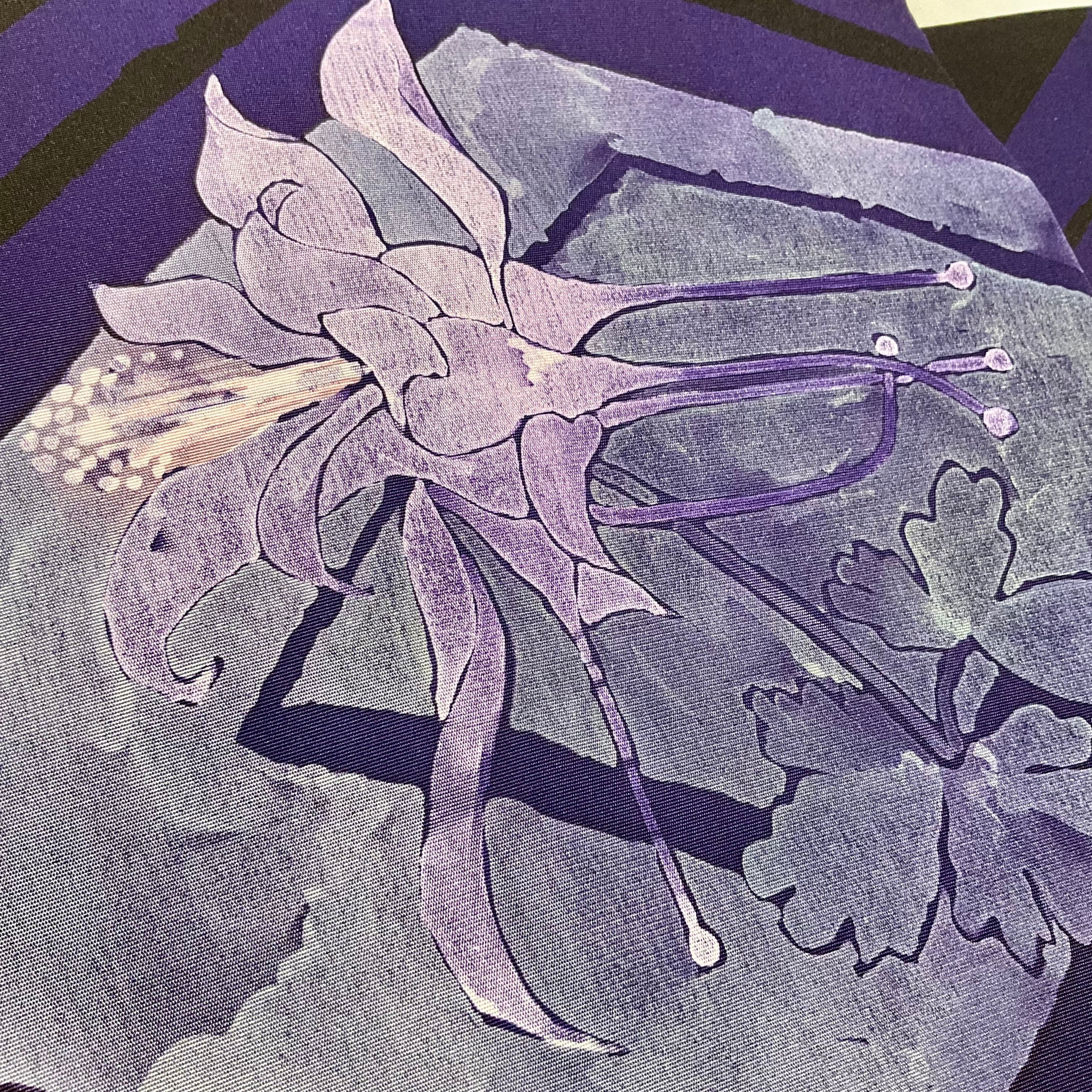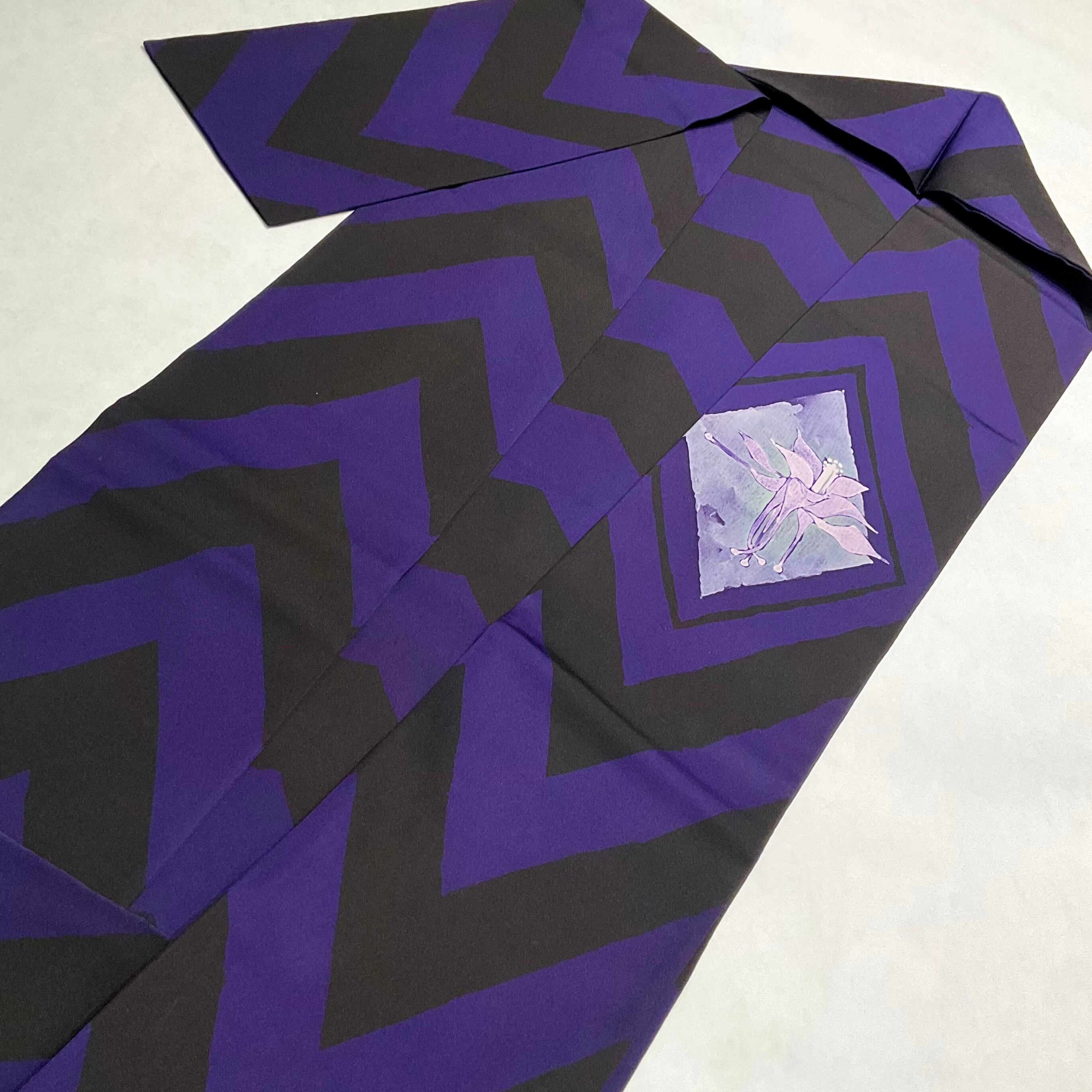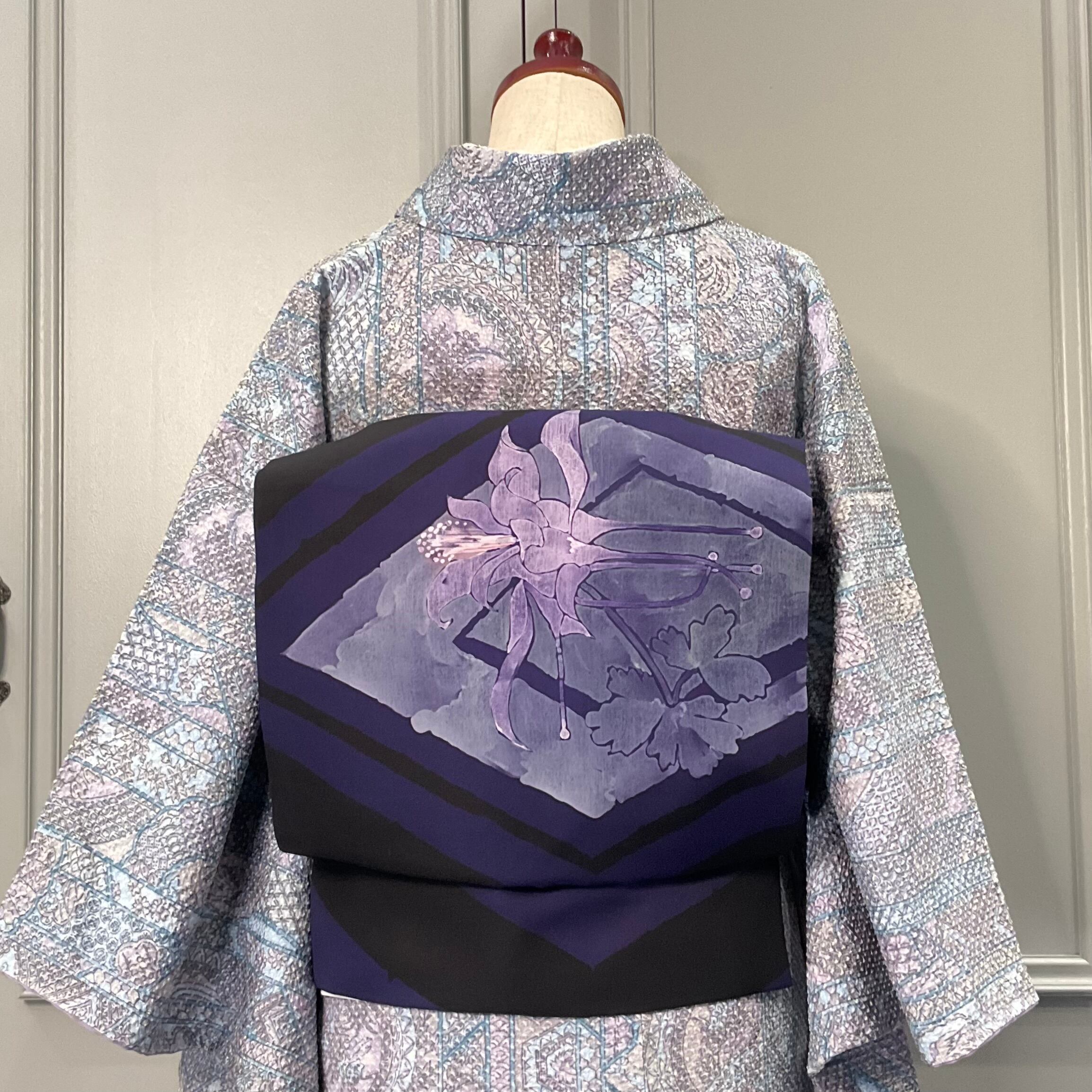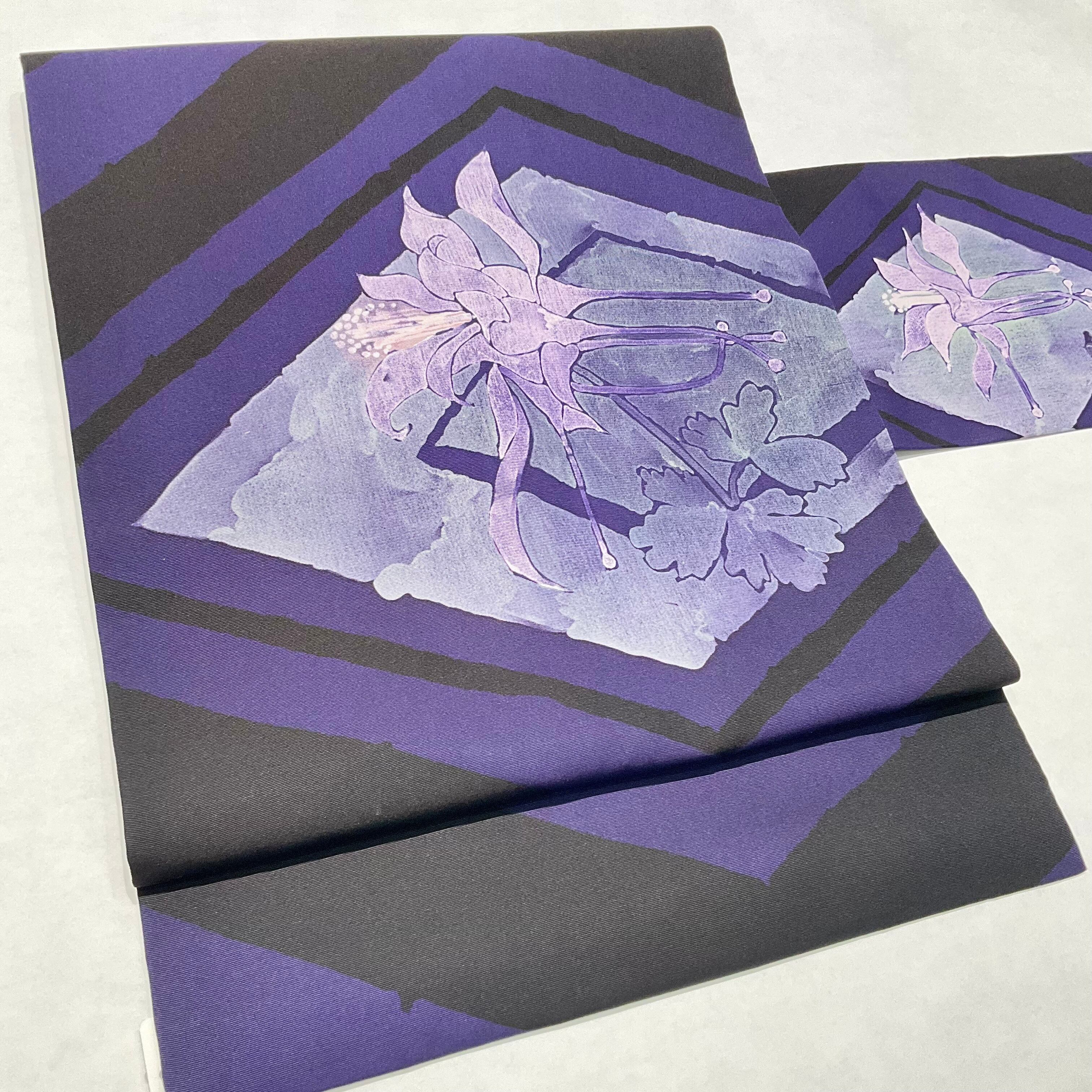ネイビーパープル×ブラックで描かれた菱模様に百合やカタクリに似た花がデザインされたリサイクルの塩瀬名古屋帯です♪