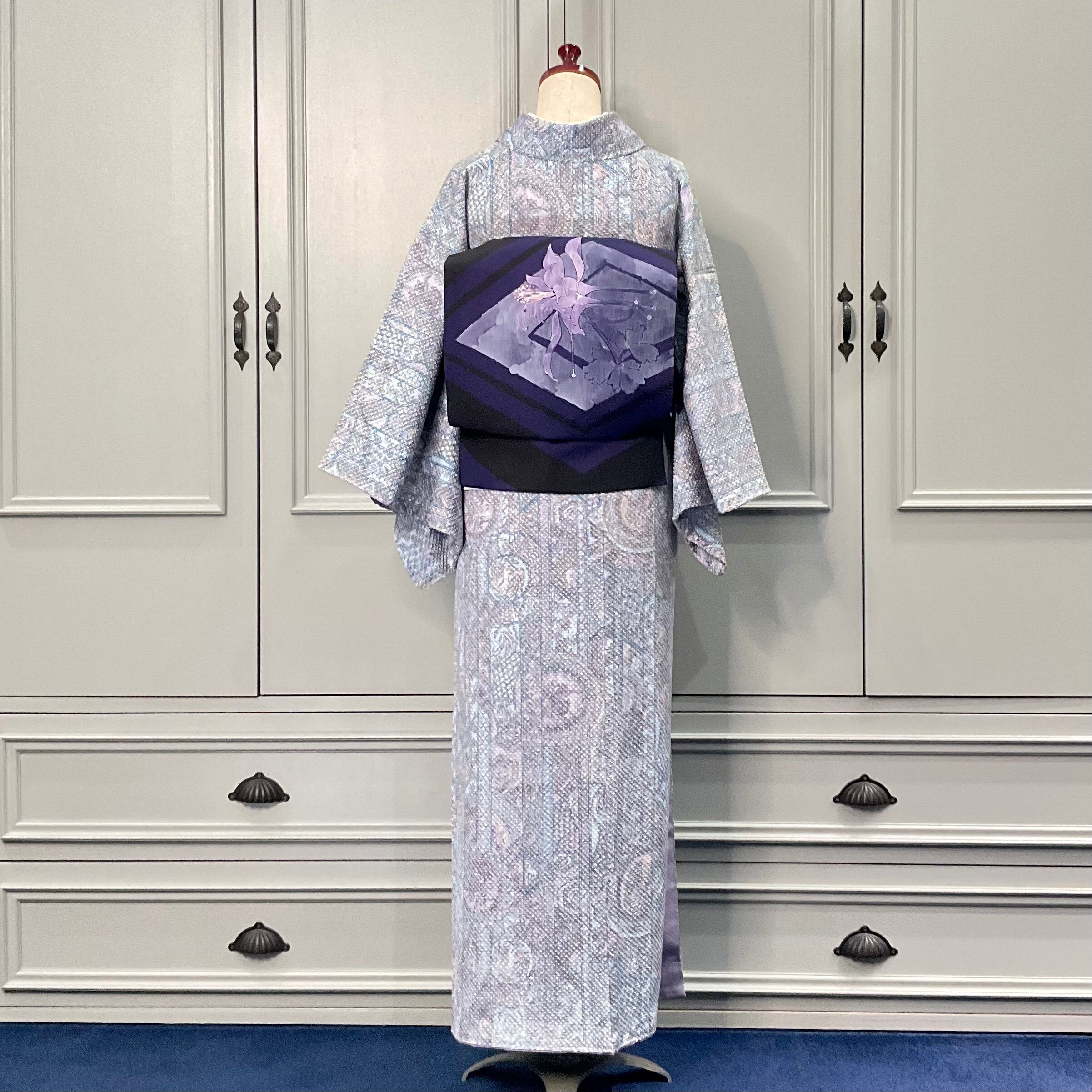 帯からはみ出るように大きく描かれたベースの菱模様はネイビーパープル×ブラックのキリッとしたカラー