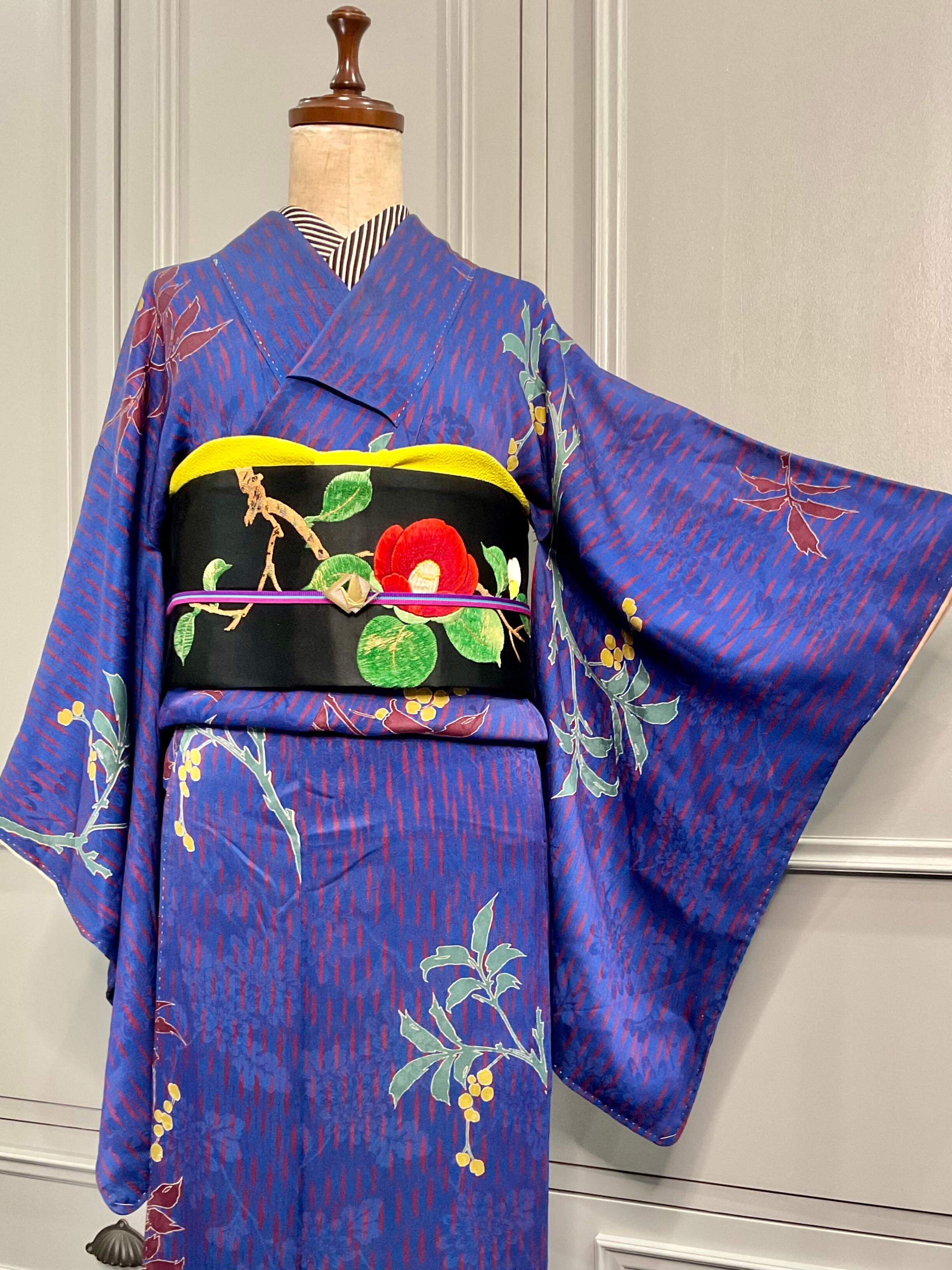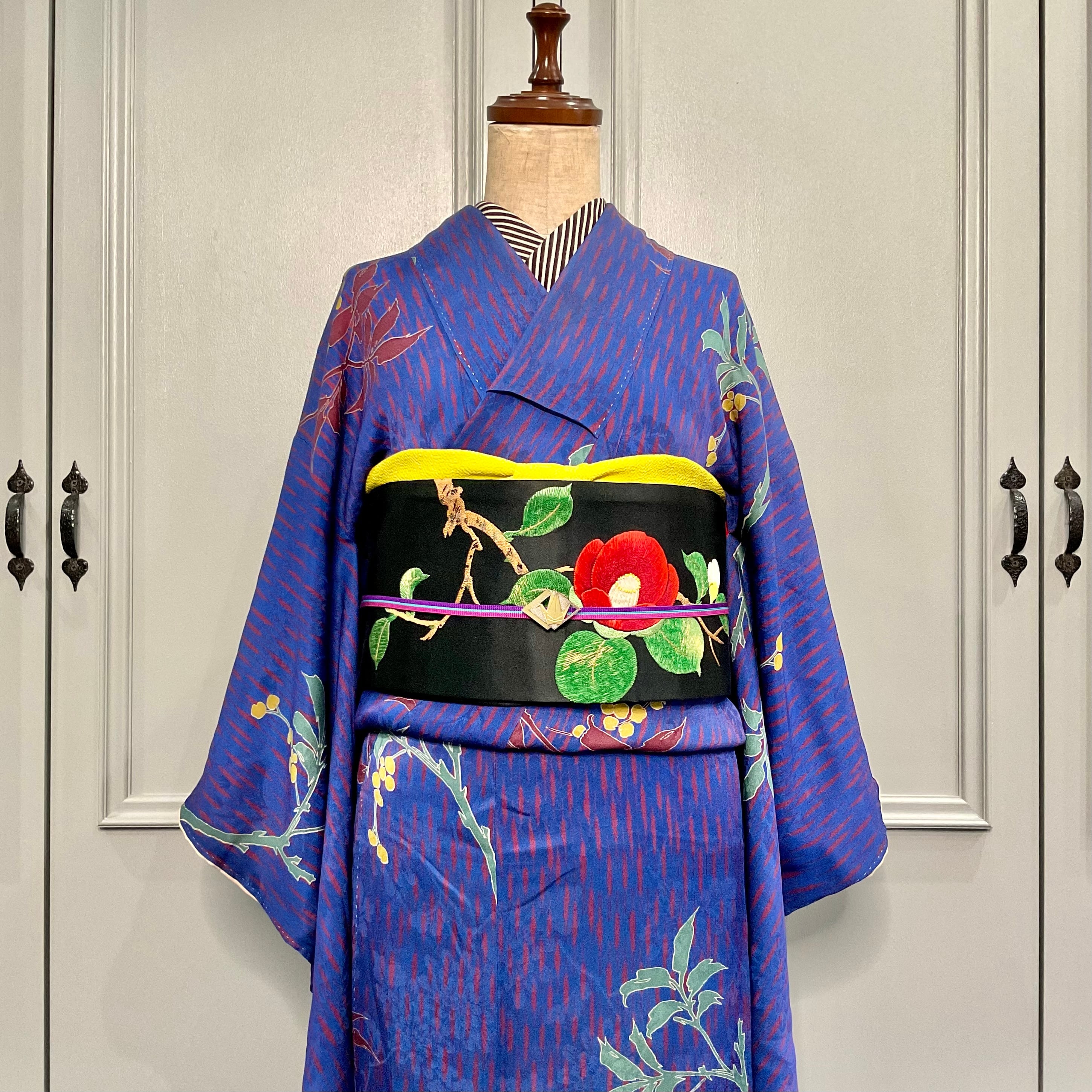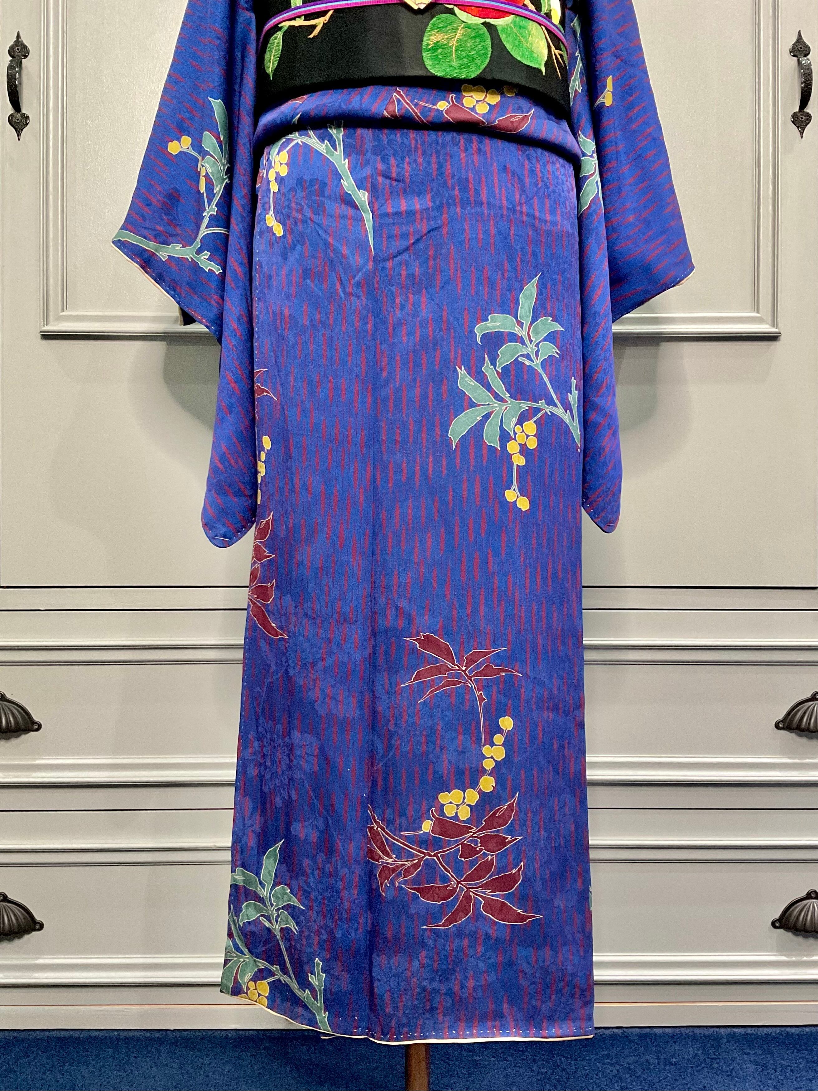 色づく木の実*ブルー 南天 アンティーク小紋着物 A453