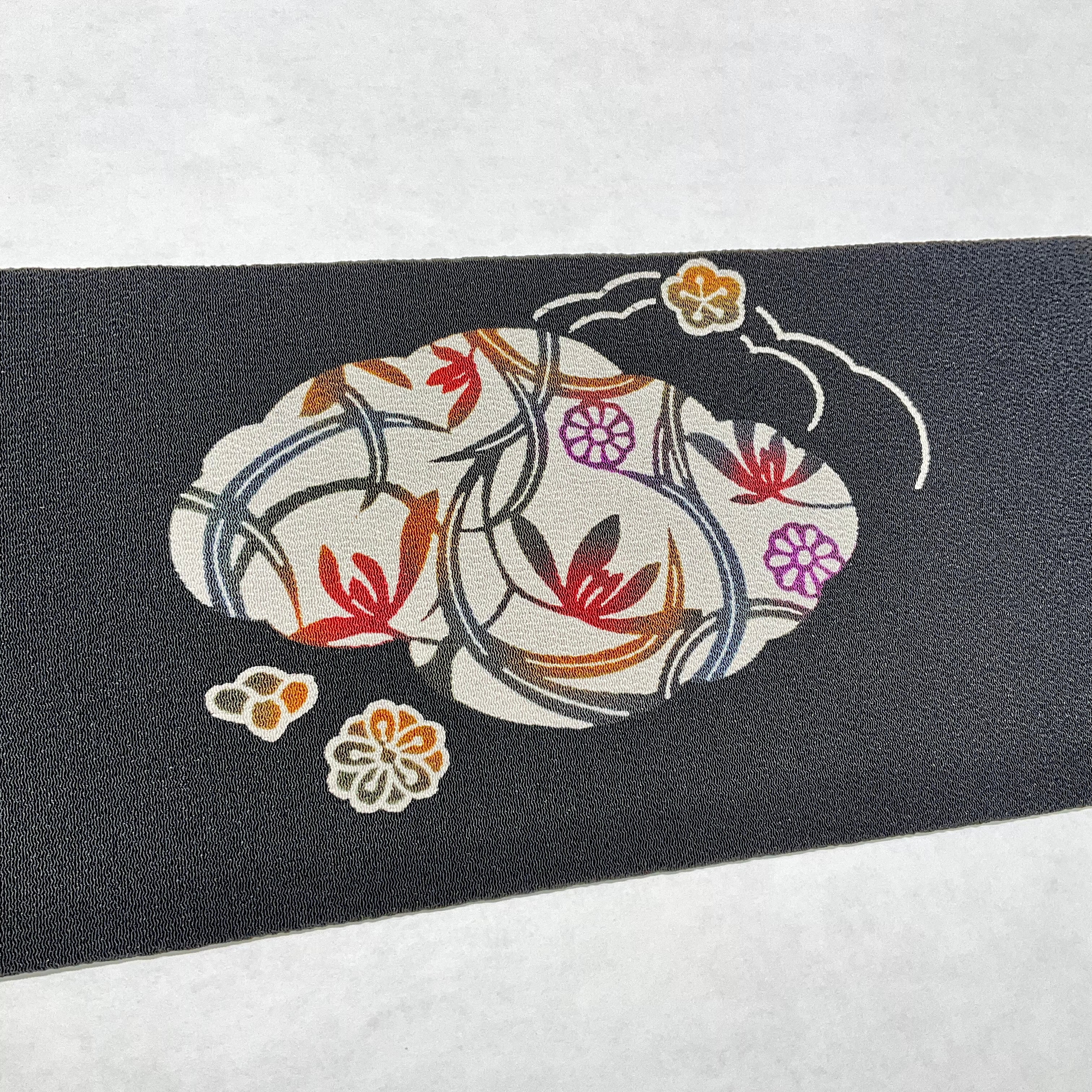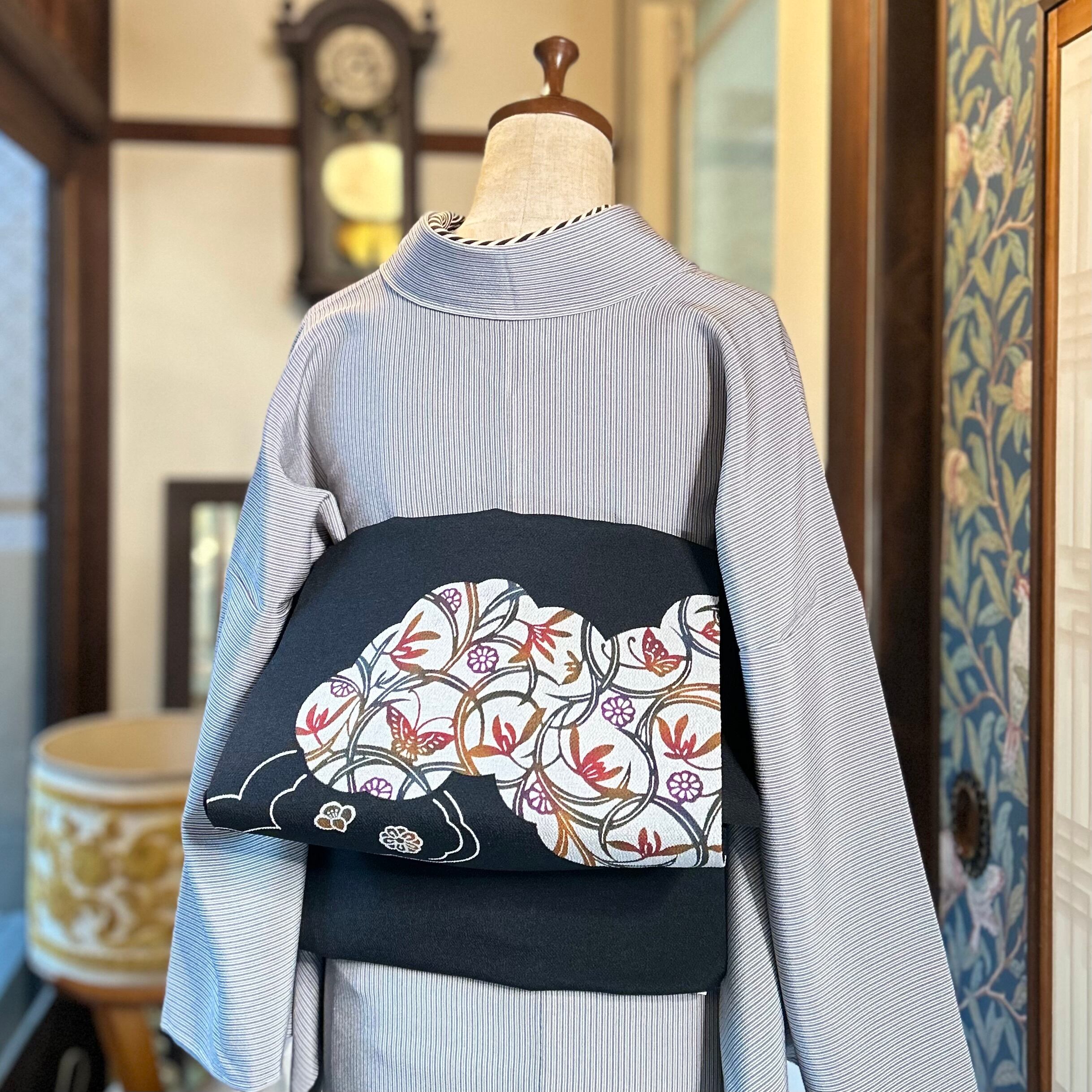 雲に描かれたこっくりと深みのある色彩の蝶や花模様、この味わいのある表情がブラックの地色に映えていますね✨