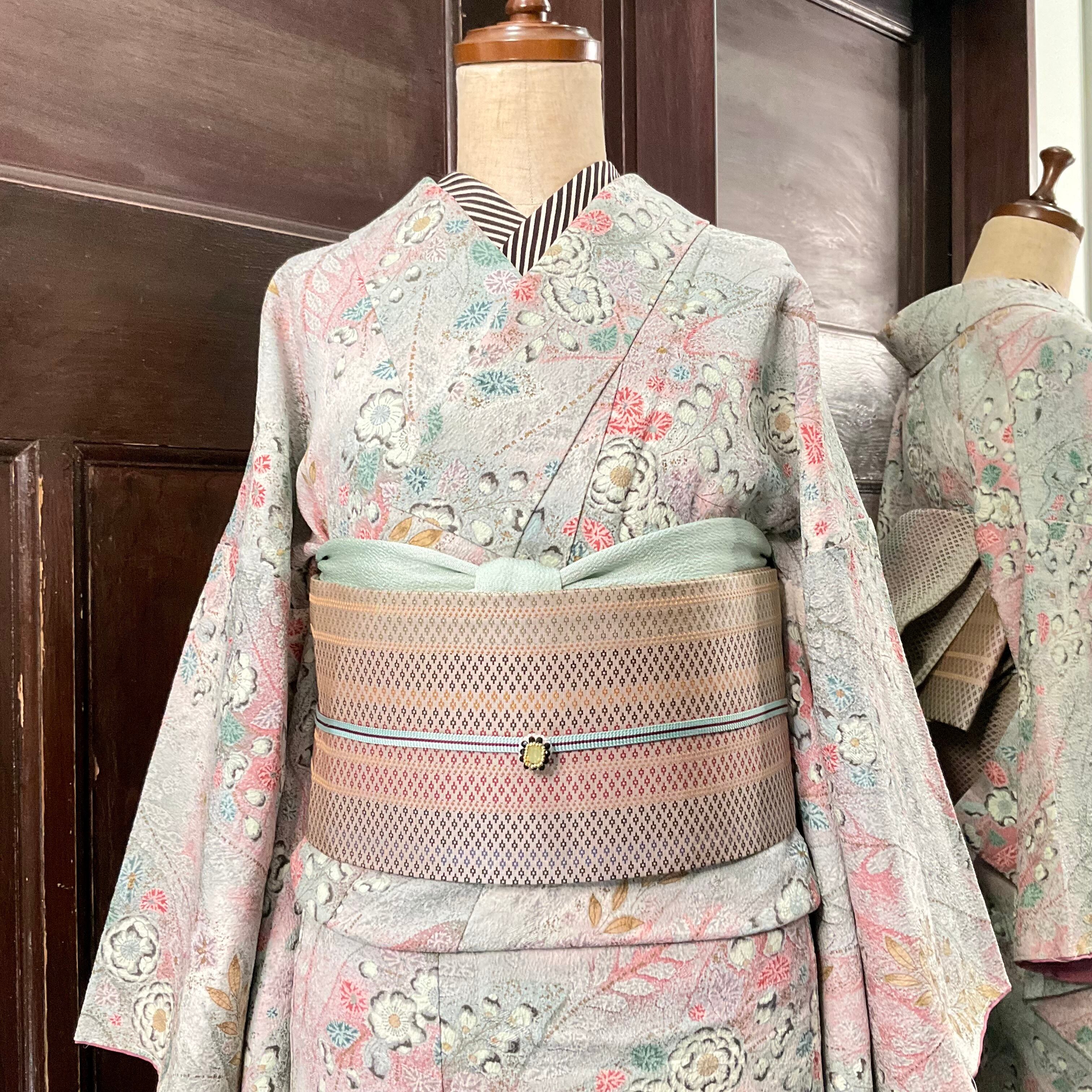 ○合わせた着物とオリジナル三分紐リバーシブルライン ミント×プラムもweb shop掲載品です♪