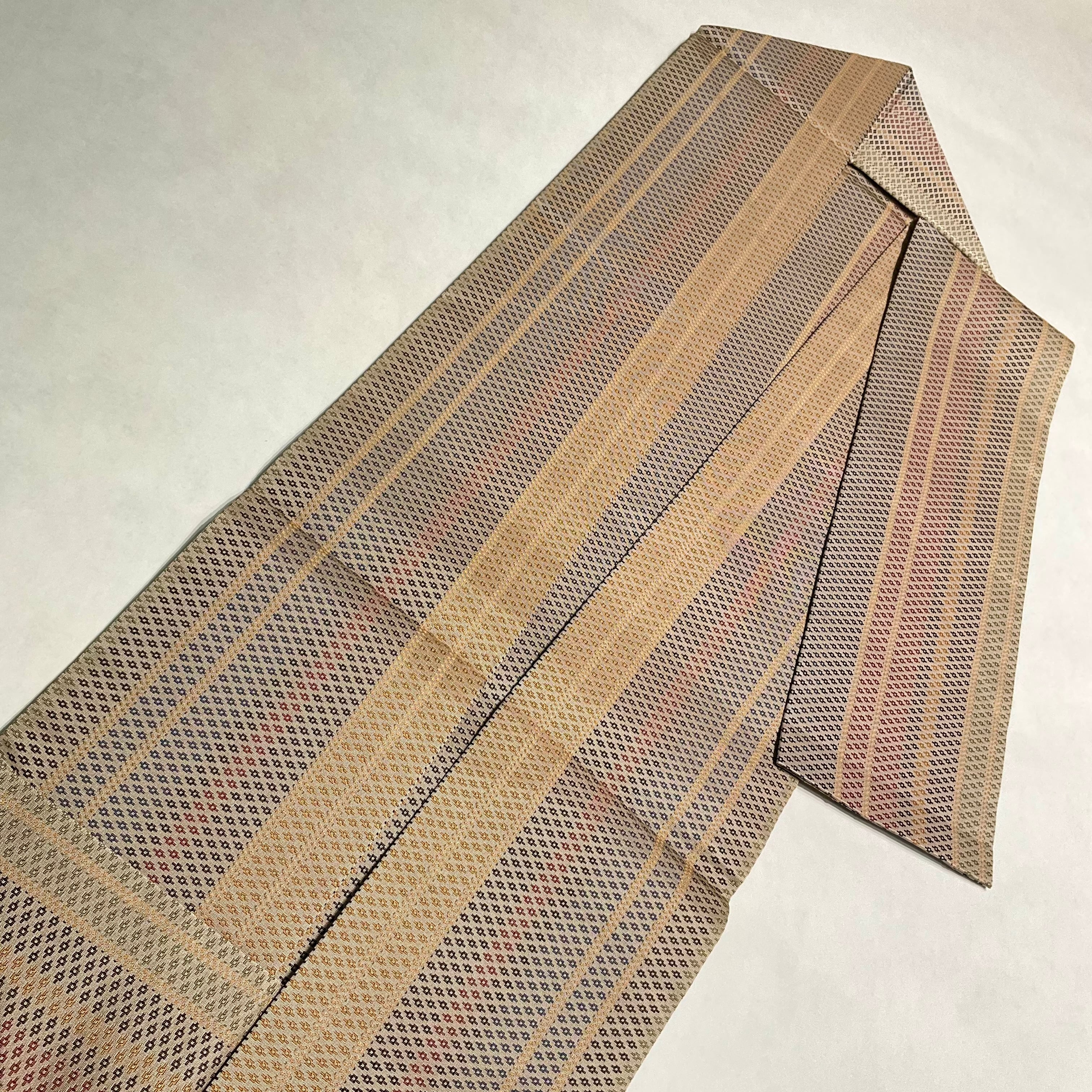 菱と縞*幾何学 未使用 青 緑 黄 赤 茶 縞模様 リサイクル名古屋帯 A460