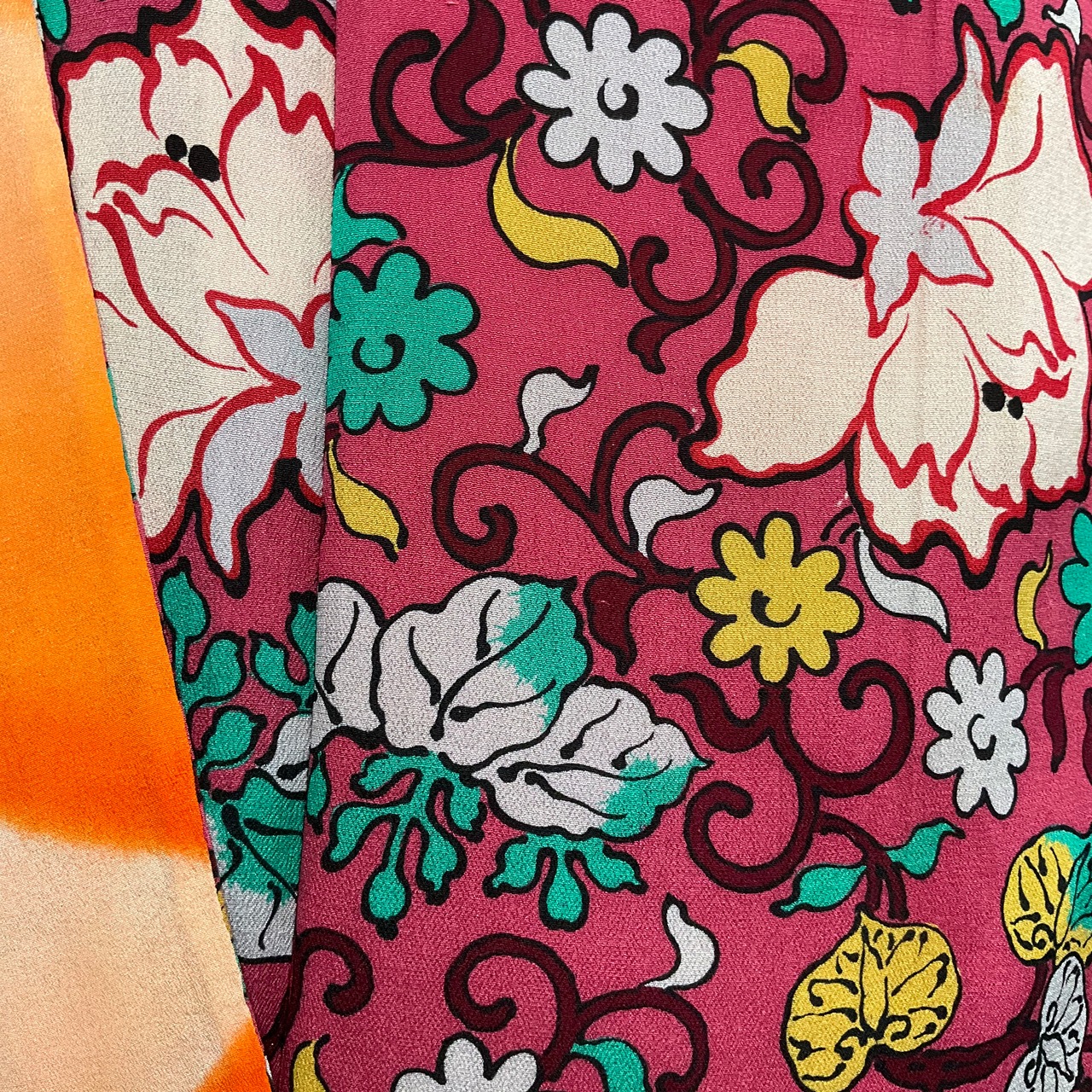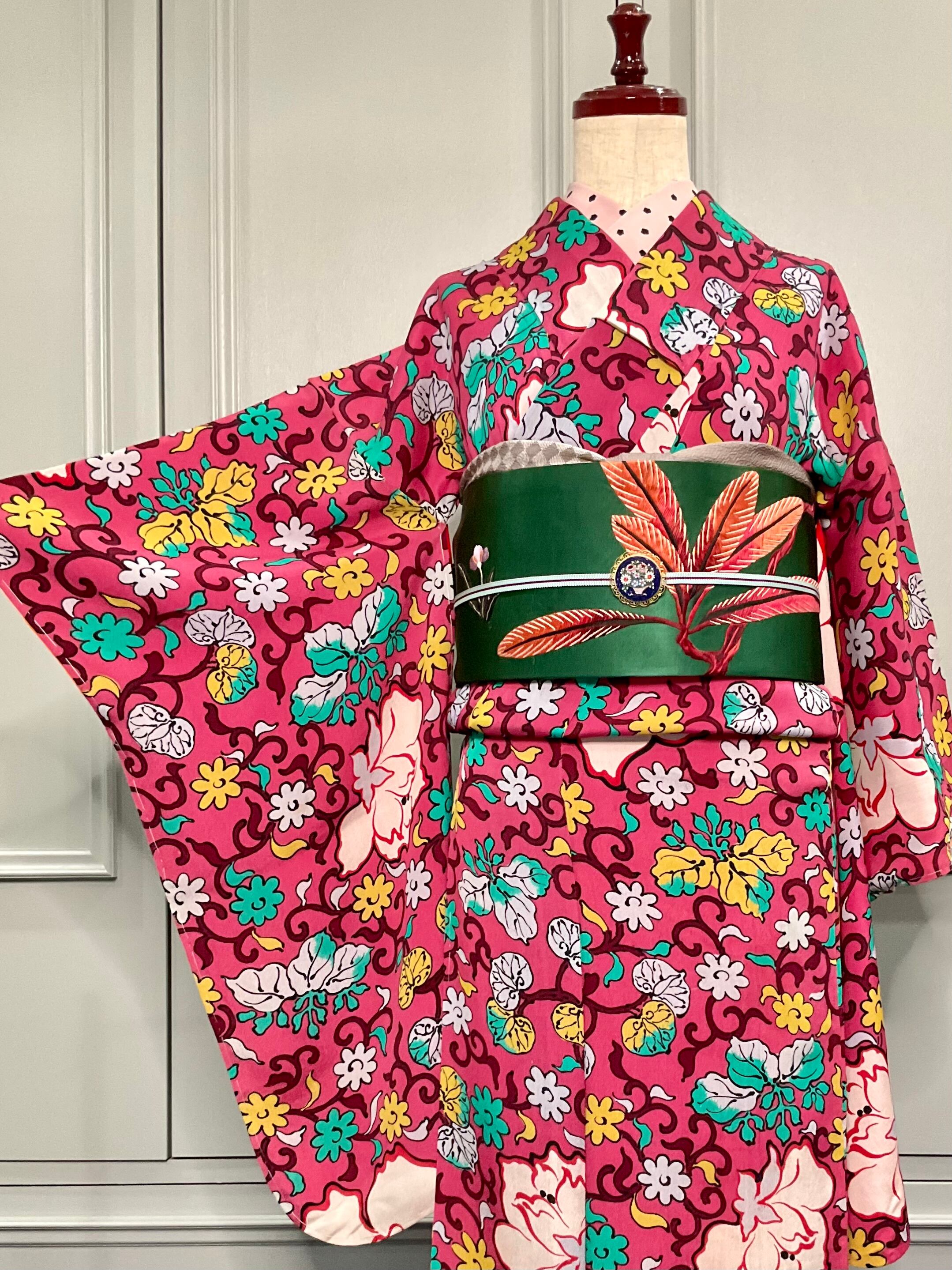 Flower party*花 牡丹 葵 葉っぱ アンティーク小紋着物 A467