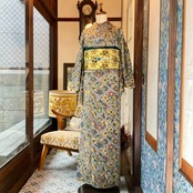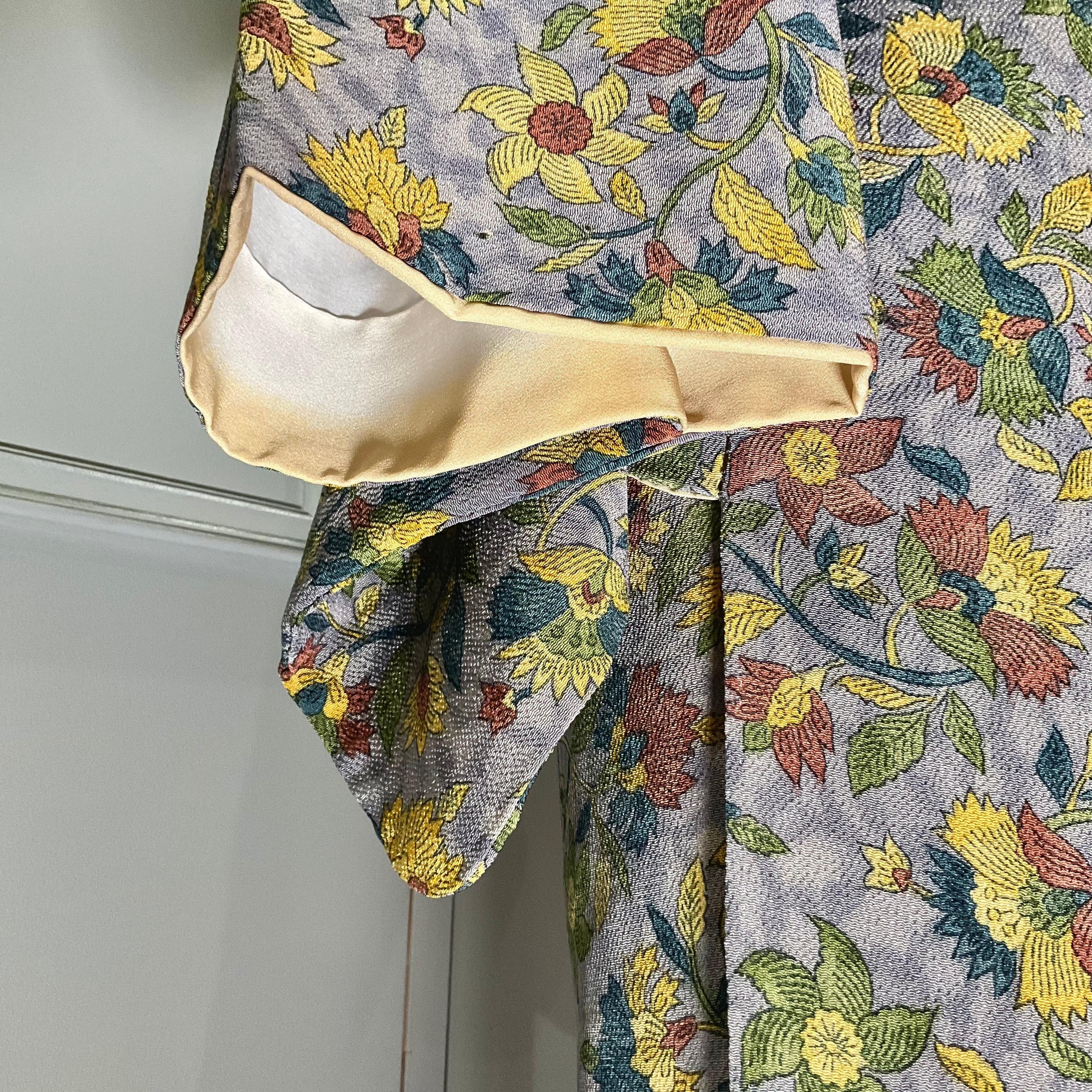 グレーの地色にブラウンやイエロー、グリーンのオリエンタルな花模様がデザインされたリサイクル小紋着物です