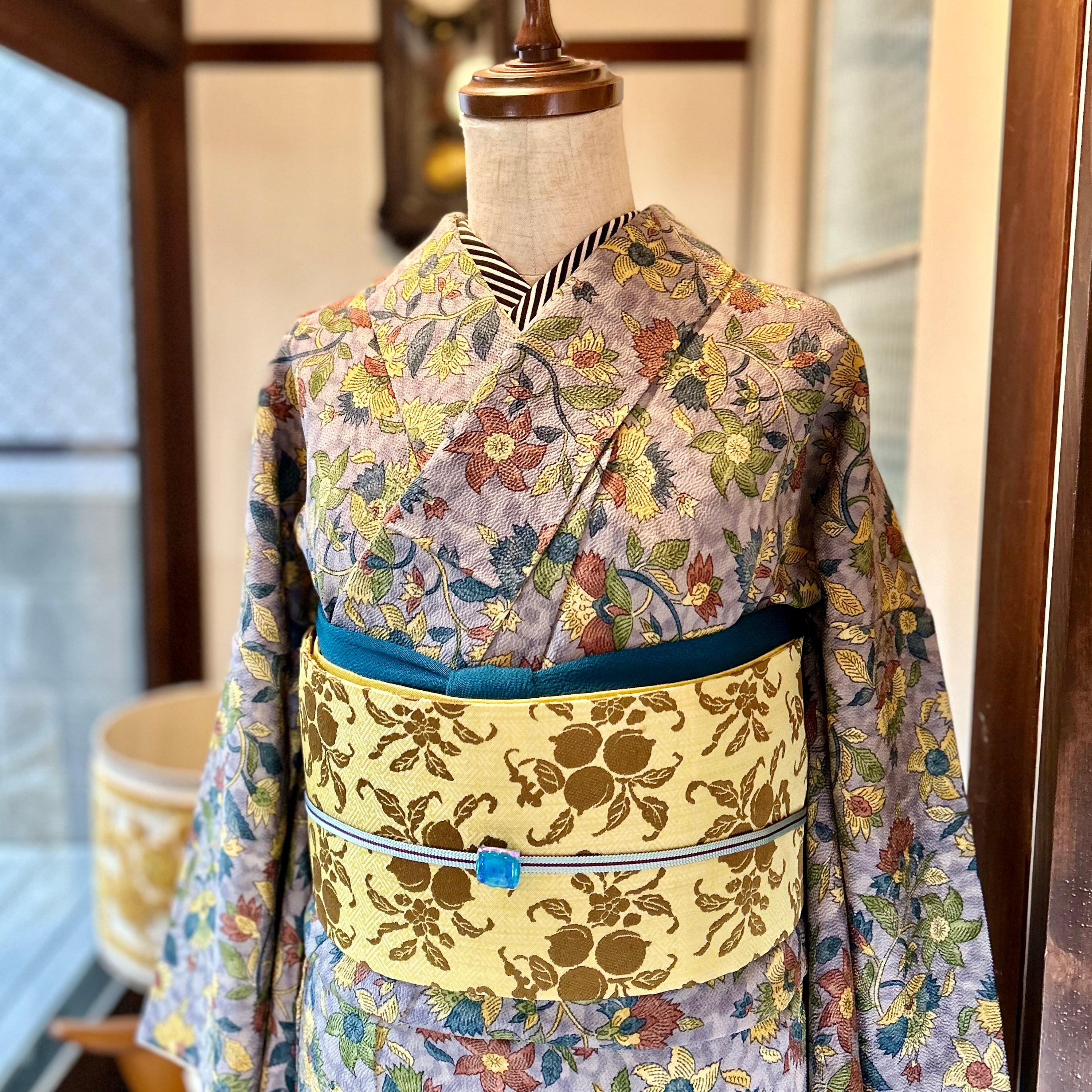 ○合わせた着物とオリジナル三分紐リバーシブルライン ミント×プラムもweb shop掲載品です♪