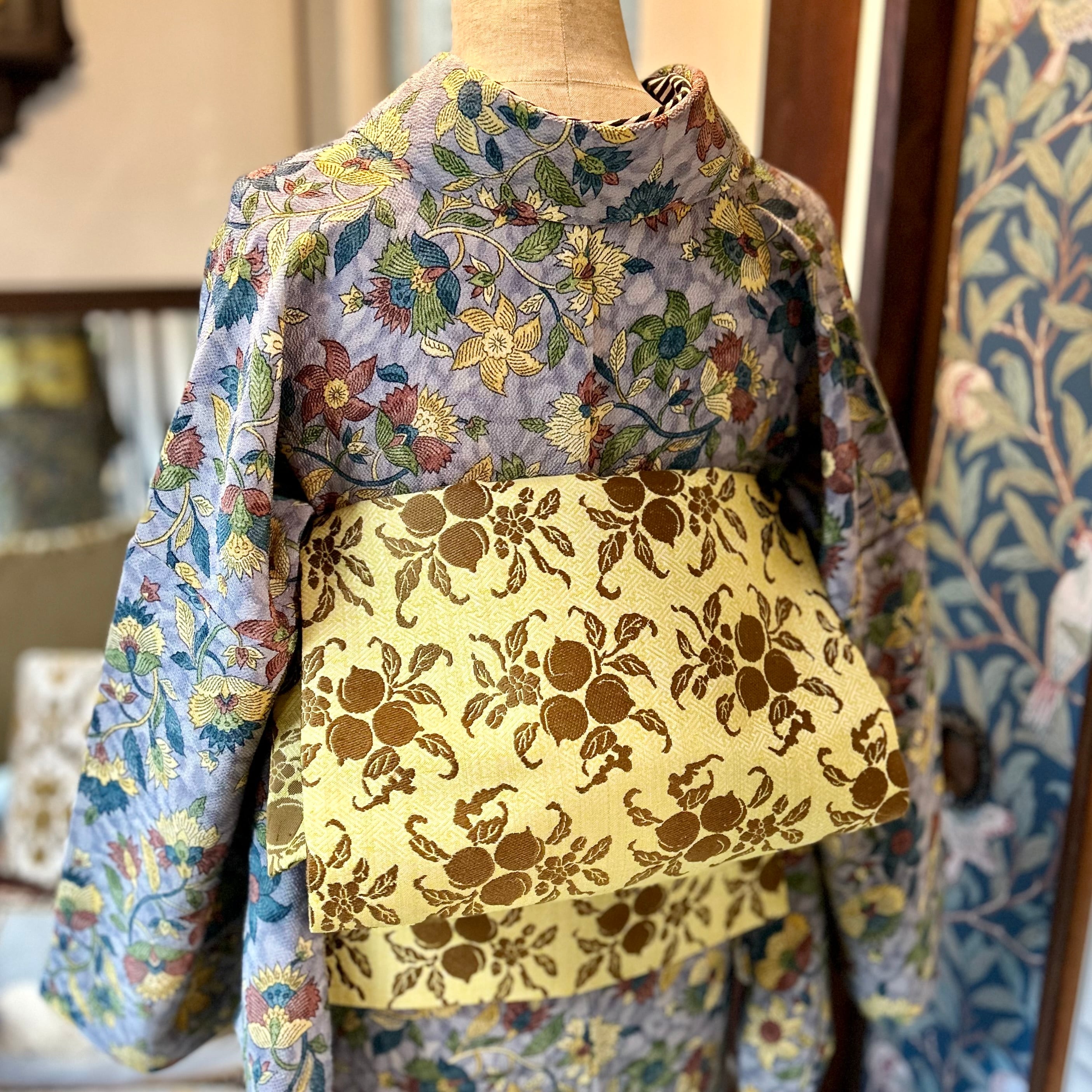 桃の実* 木の実 花と実 黄色リサイクル名古屋帯 A476